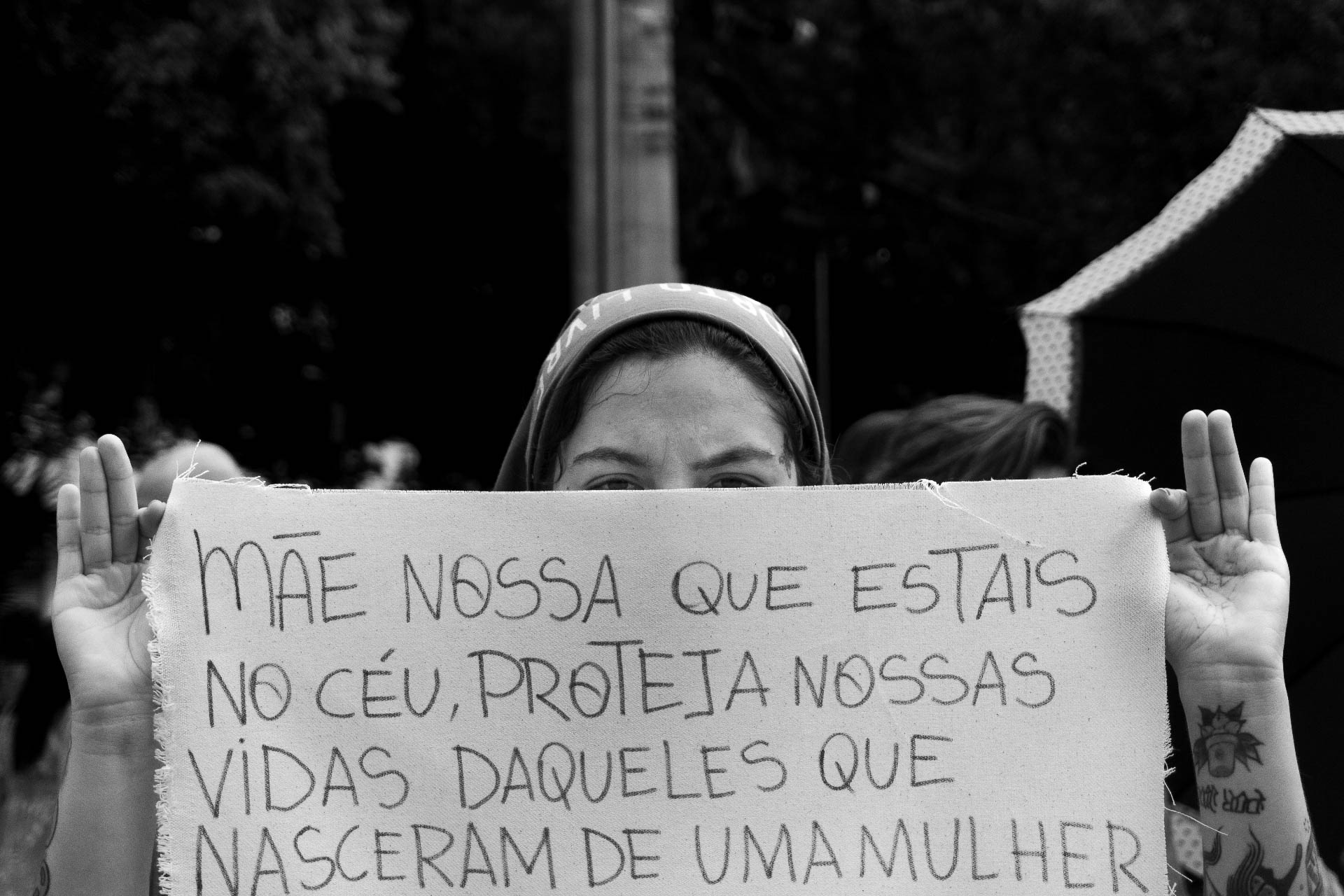 Mulher estende cartaz durante protestos contra o femininicídio.