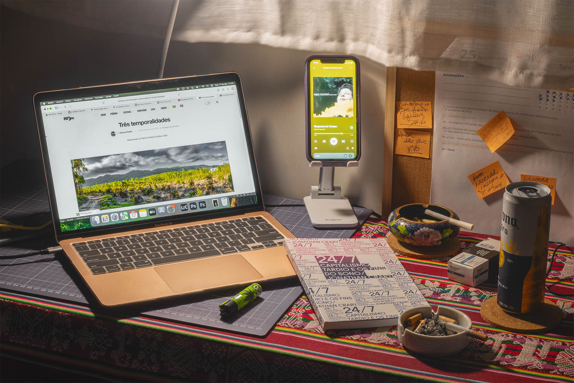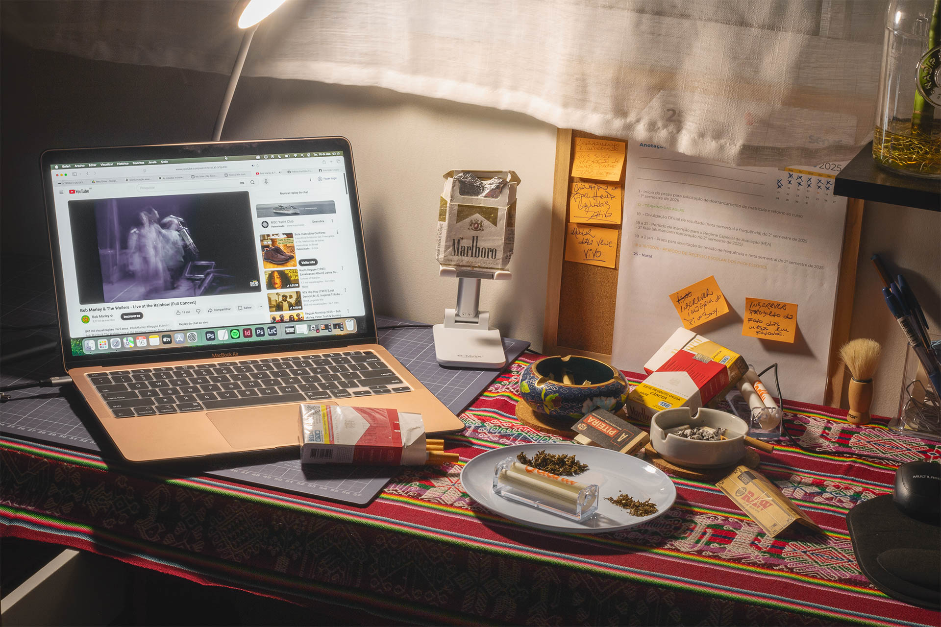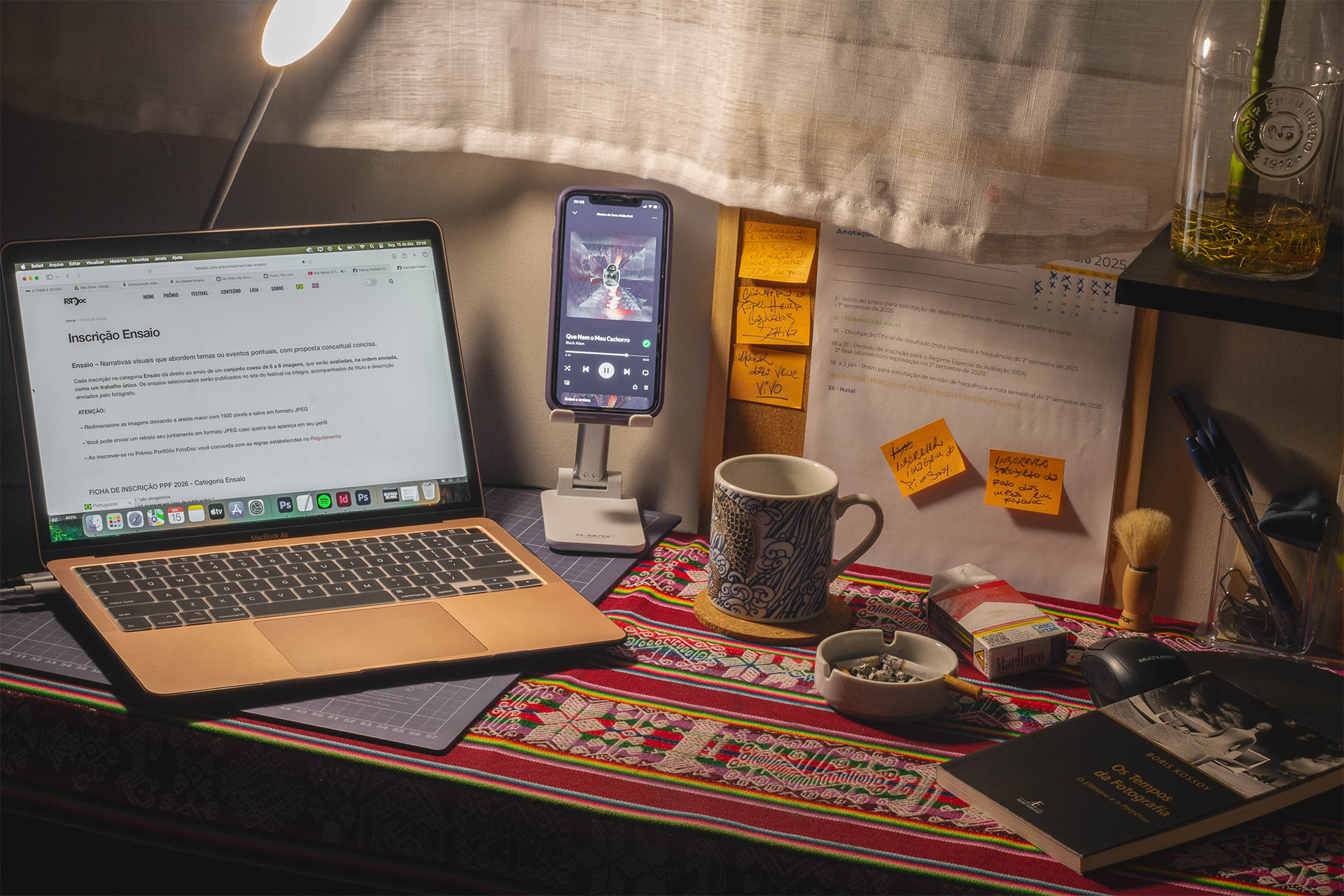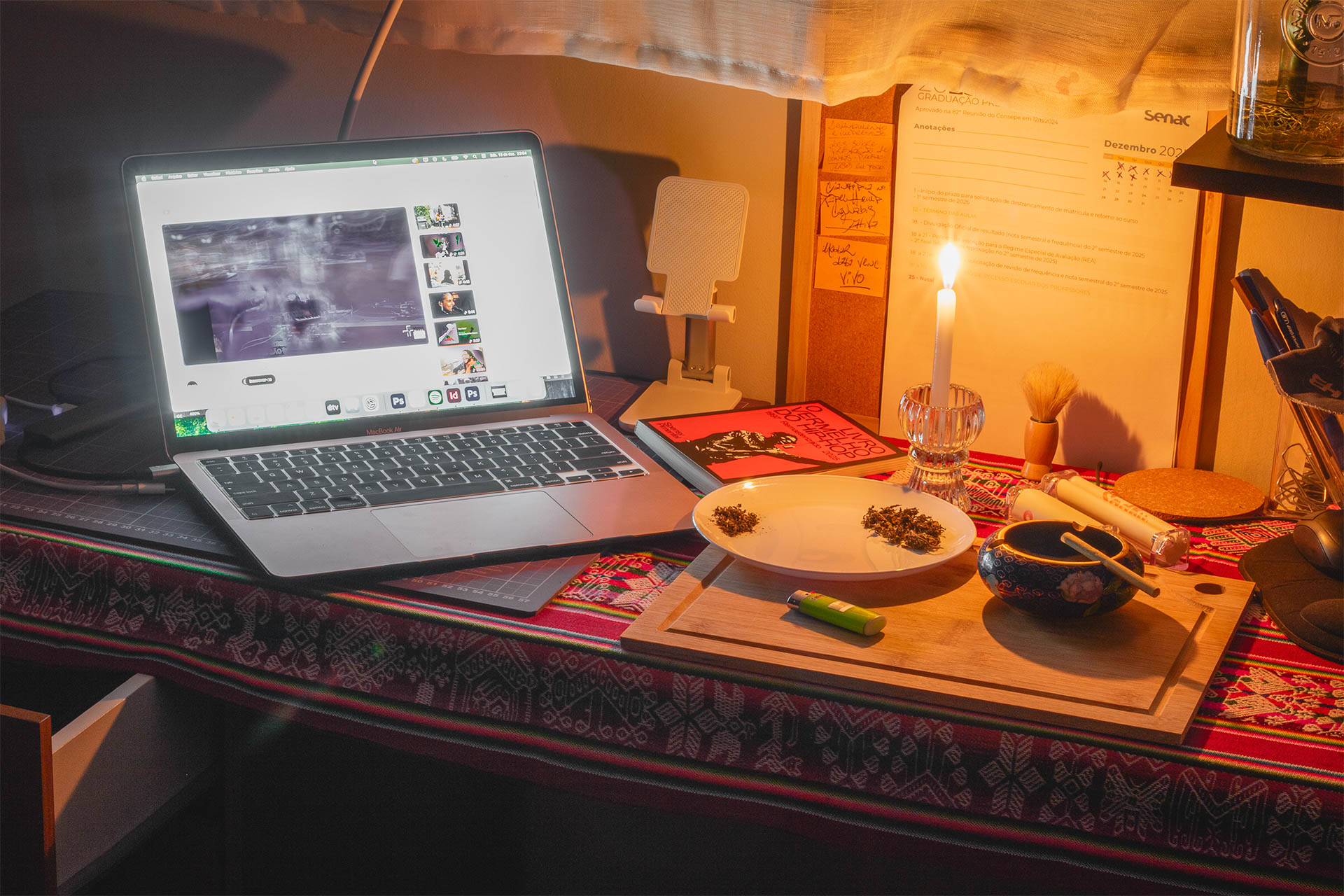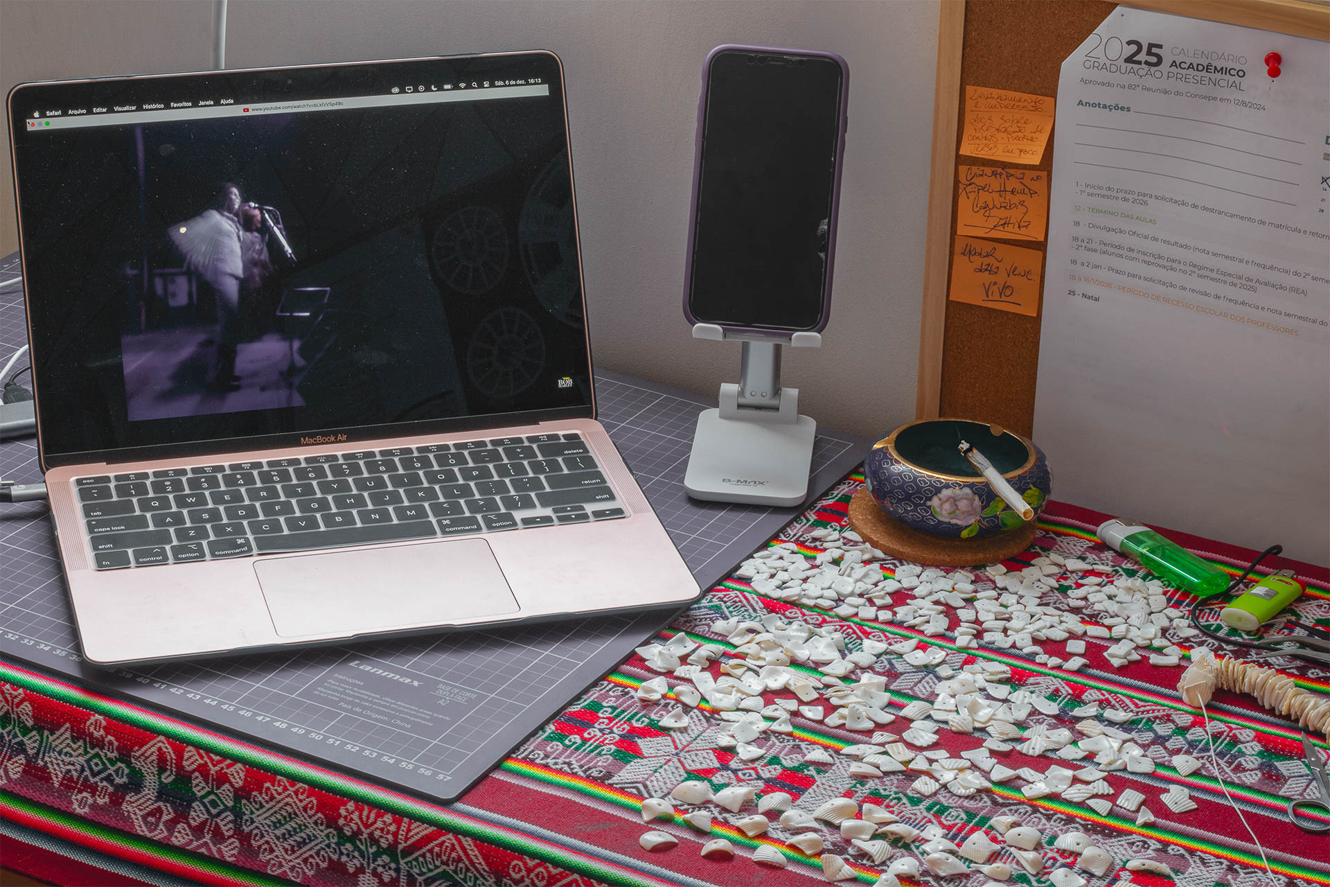 Um móvel aparece como lugar recorrente, não como centro organizado, mas como superfície onde as coisas se acumulam à medida que acontecem. Não se institui como ateliê, não por recusa, mas por ainda operar sem forma estabilizada, reunindo o que é possível em um mesmo espaço: pesquisa, edição e tratamento de imagens, leitura, escuta, alimentação, colagens, o refazer lento de um objeto manual, o uso de substâncias, a pausa, o deitar e o retorno.