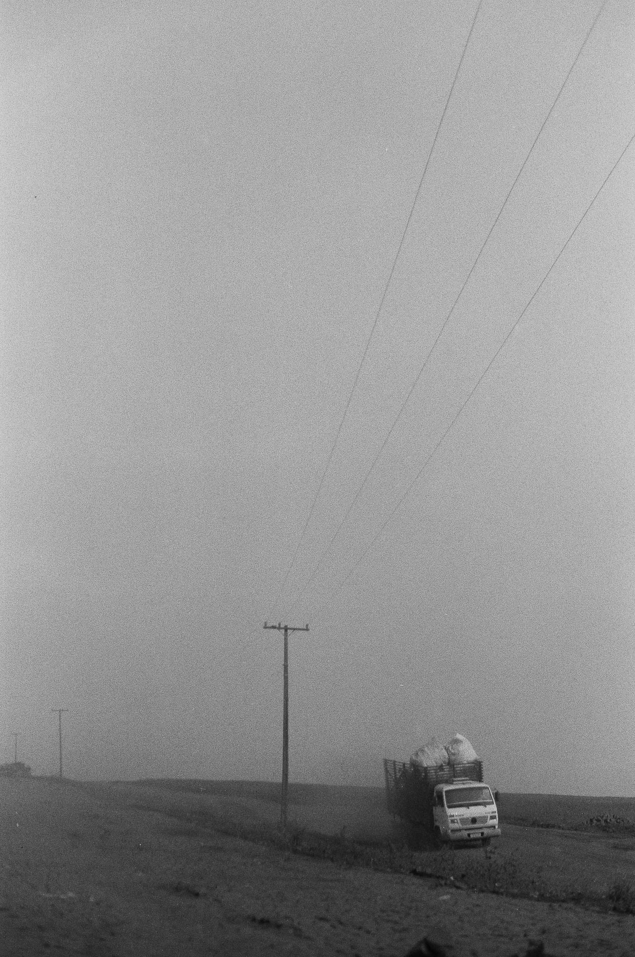 Um caminhão carregado some na névoa. A produção não tem rosto, tem direção.