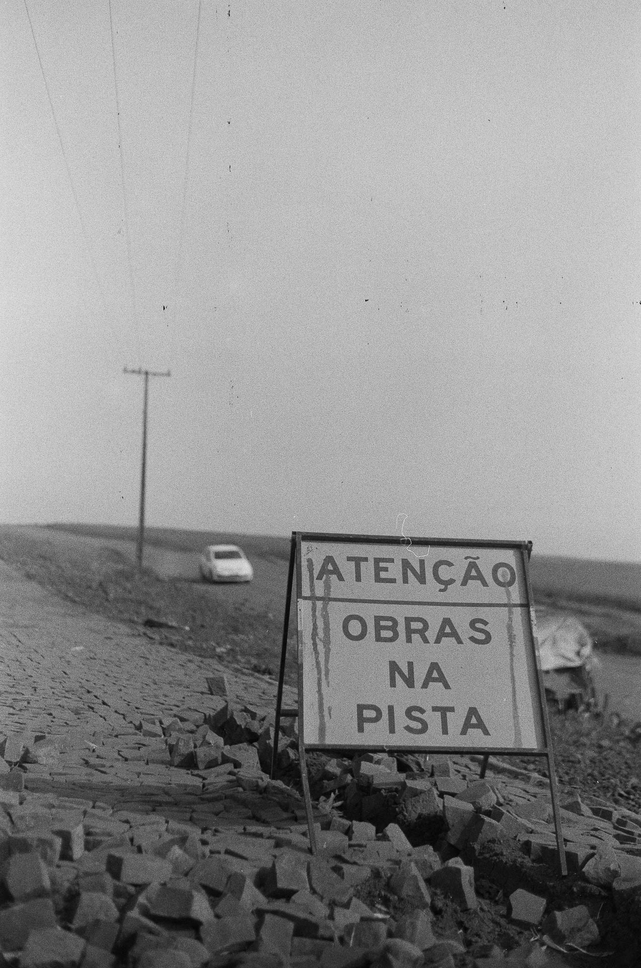 A estrada que serve ao latifúndio está sempre em construção. O horizonte pertence aos postes.