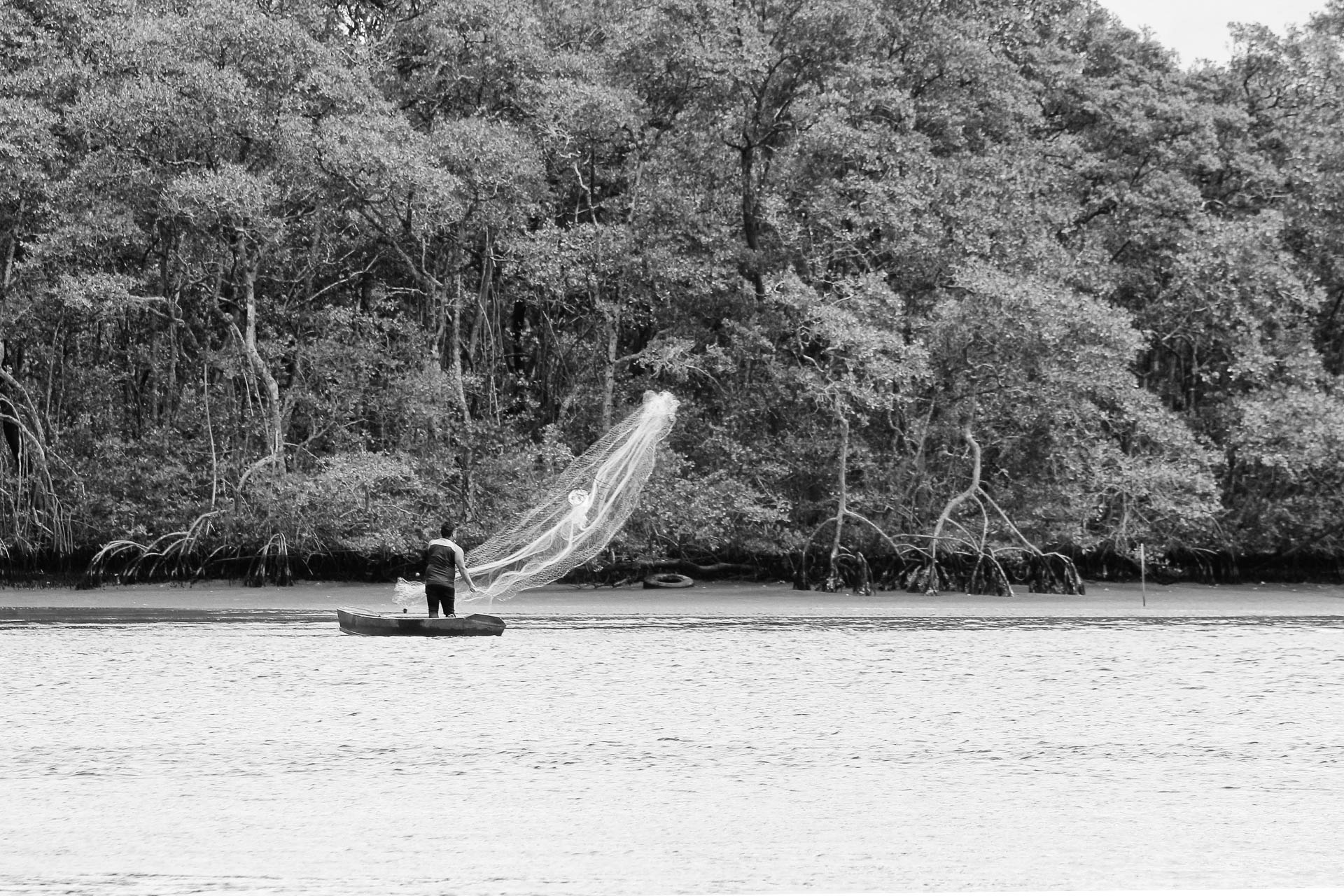 Gesto tradicional da pesca artesanal caiçara nos rios do litoral paulista.