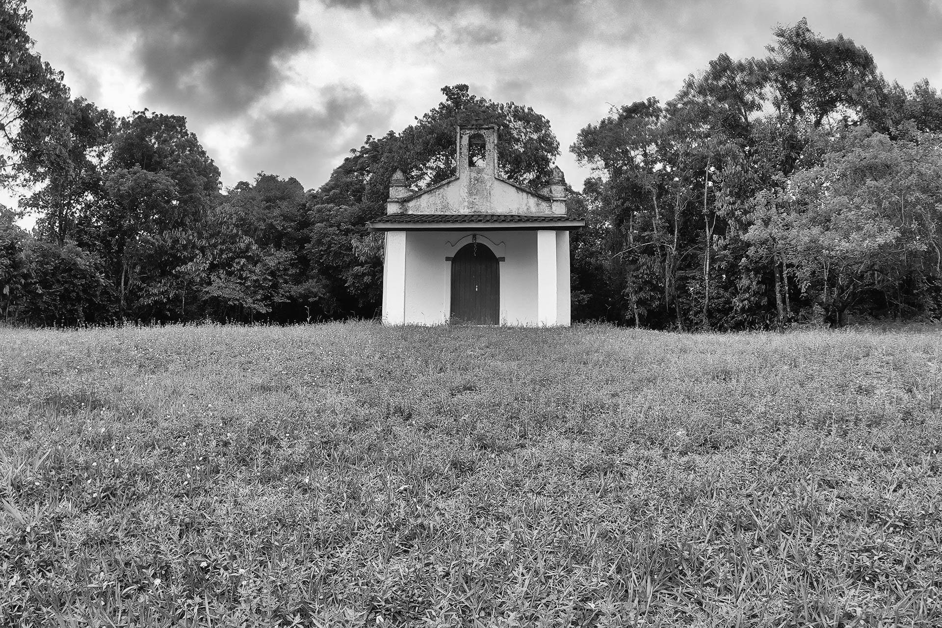 Em contraste, a igreja antiga revela marcas de ocupações humanas de outros tempos construida na mata. A árvore solitária em meio à pastagem explicita as tensões entre preservação e transformação do território, evidenciando os limites entre o que permanece e o que se perde.