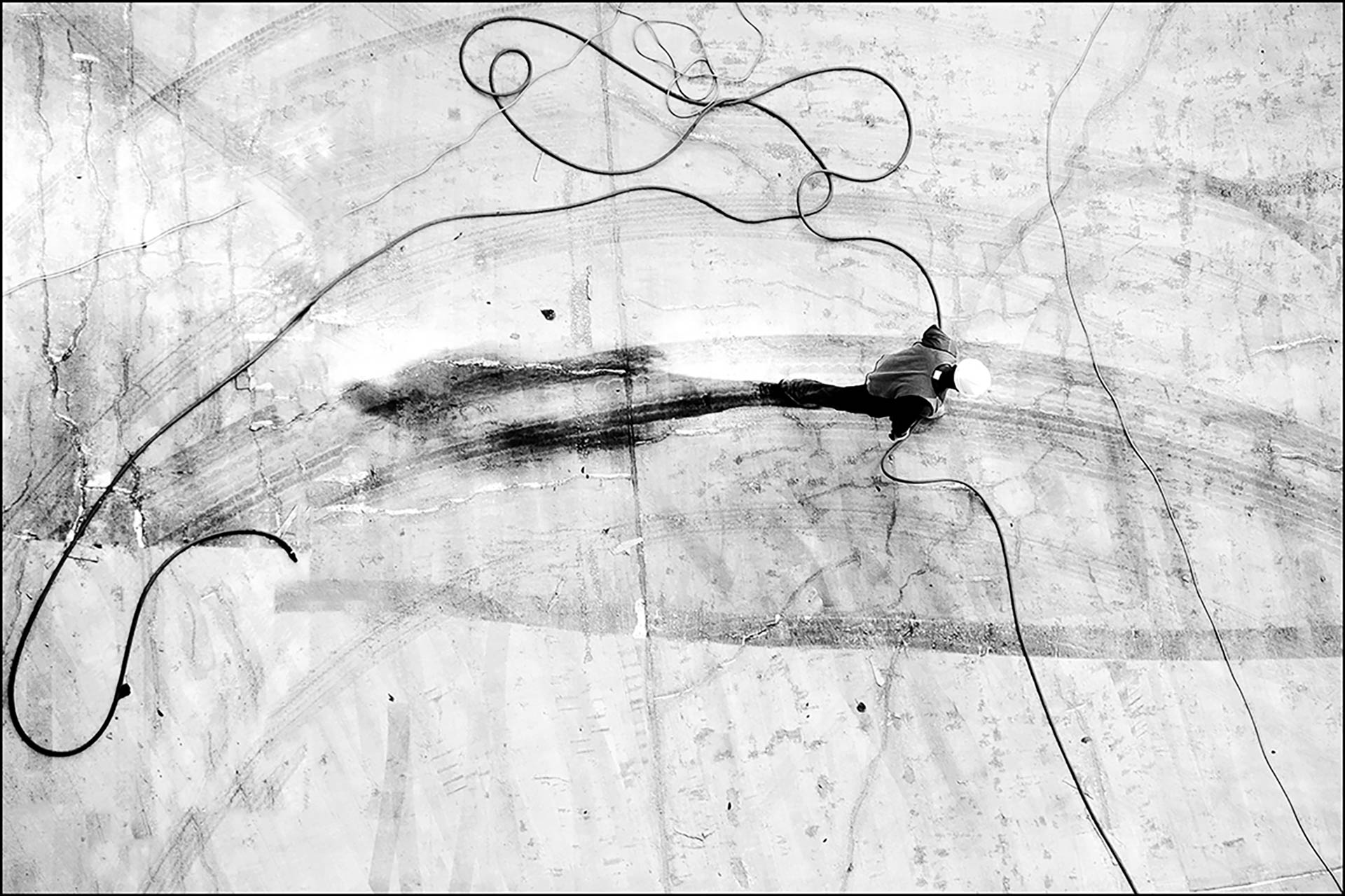 Sua sutileza monocromática tende a insinuar as tramas de um tecido temporal que no piso rústico de concreto se desenrola e vai acamando seus véus, feito de percursos sobrepostos, ora tatuando a superfície com a memória de trajetos, pelas inscrições ali deixadas com a passagem de pneus incógnitos, ora enraizando as fissuras da secagem do cimento, as quais bem podem levar o curso dos dias para mais fundo e atiçam o nosso olhar para a materialidade do piso. Enfim, ocorrência nenhuma parece passar ao largo do olhar poético de Mariza; nem mesmo as situações mais voláteis como pequenas nuvens de poeira à distância, a quase sensualidade dos cabos de energia espraiando desenhos efêmeros no chão, a vazante de poças d’água gerando bem abaixo dos pés, por vezes, indícios das nuvens do céu.
