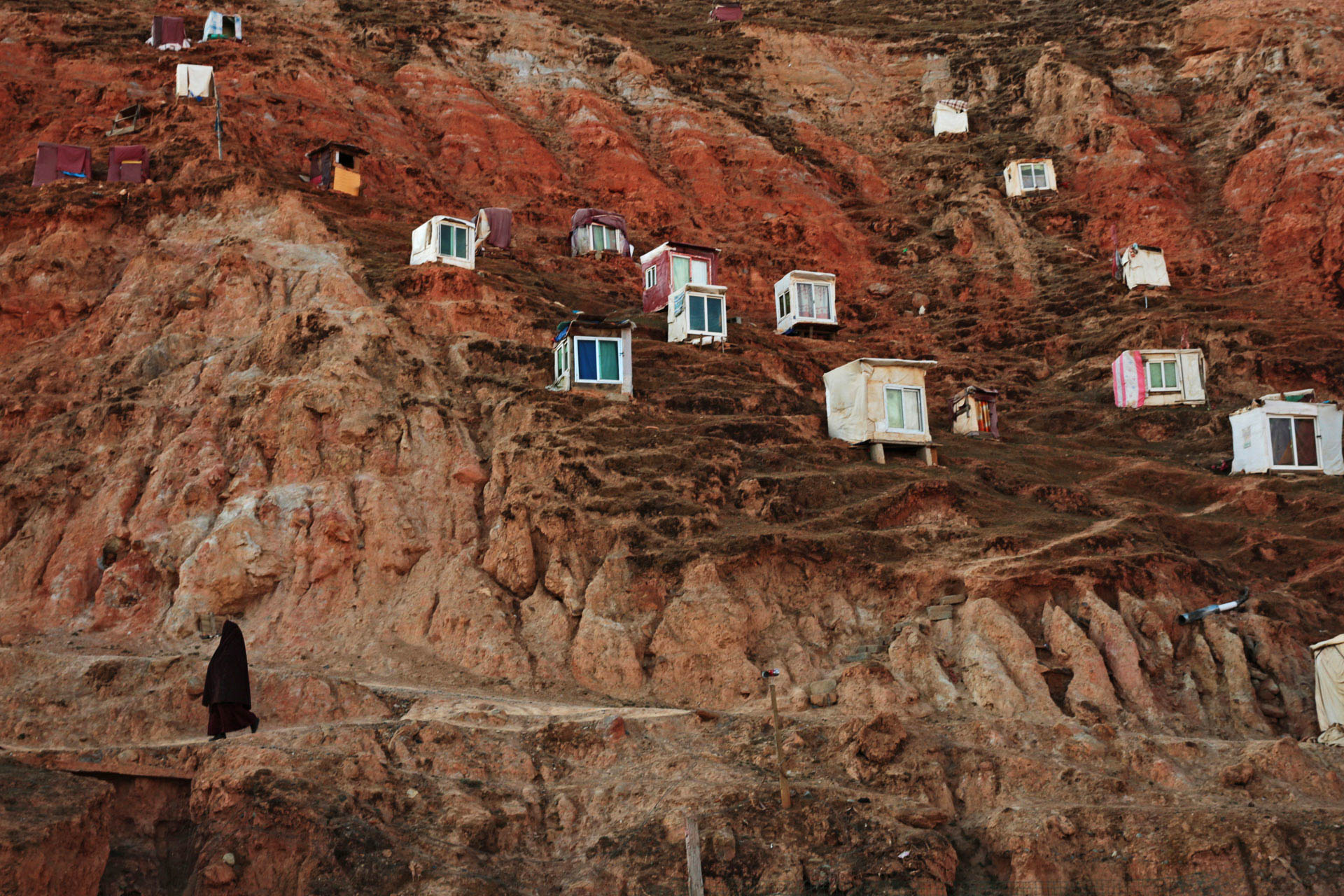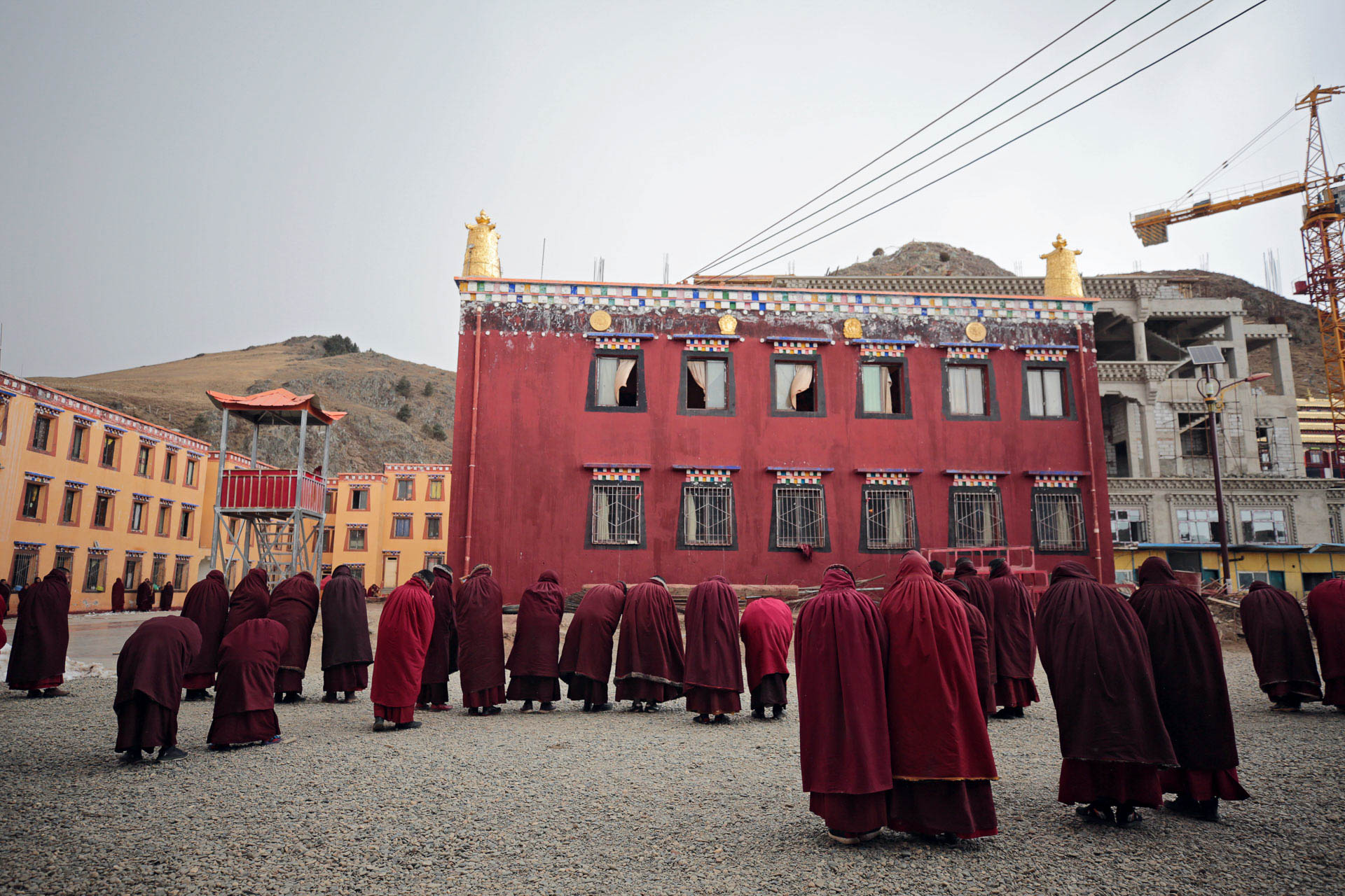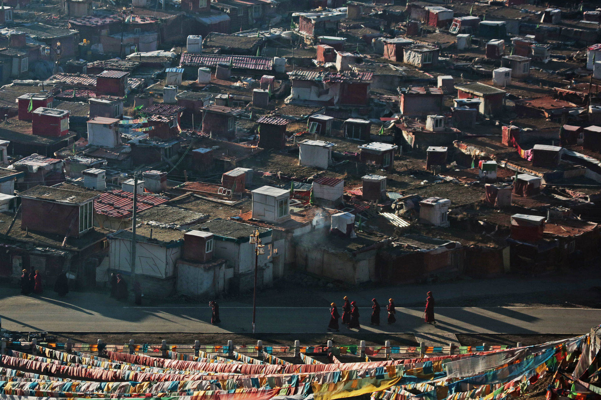 A nun passes by past the meditation cubes in the hill. In winter, nuns must continue their practice of asceticism every day in a one-cubic-meter wooden hut located on the hillside faced to the island. Except eating and drinking, nuns sit and meditate during daytime, still and silent. The asceticism lasts a hundred days.A group of nuns walks past their houses. The nuns’ island of Yarchen Gar is the largest nuns’ residential area in the world. Here, houses topped with meditation cubes form a unique loft structure. Today, as Chinese officials start to control the number of nuns on the island, the houses face large-scale demolition.