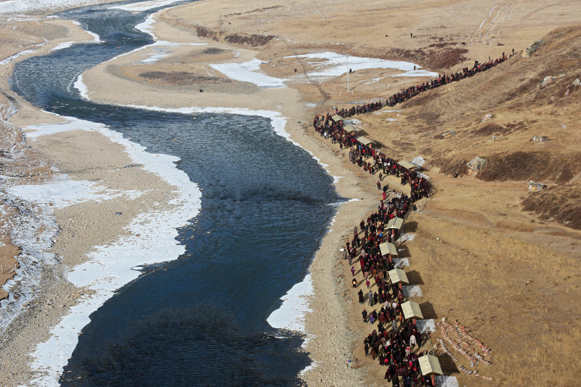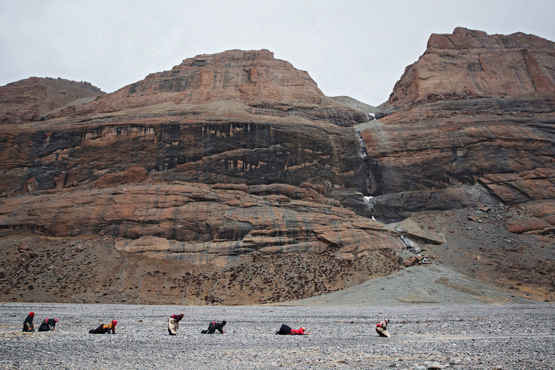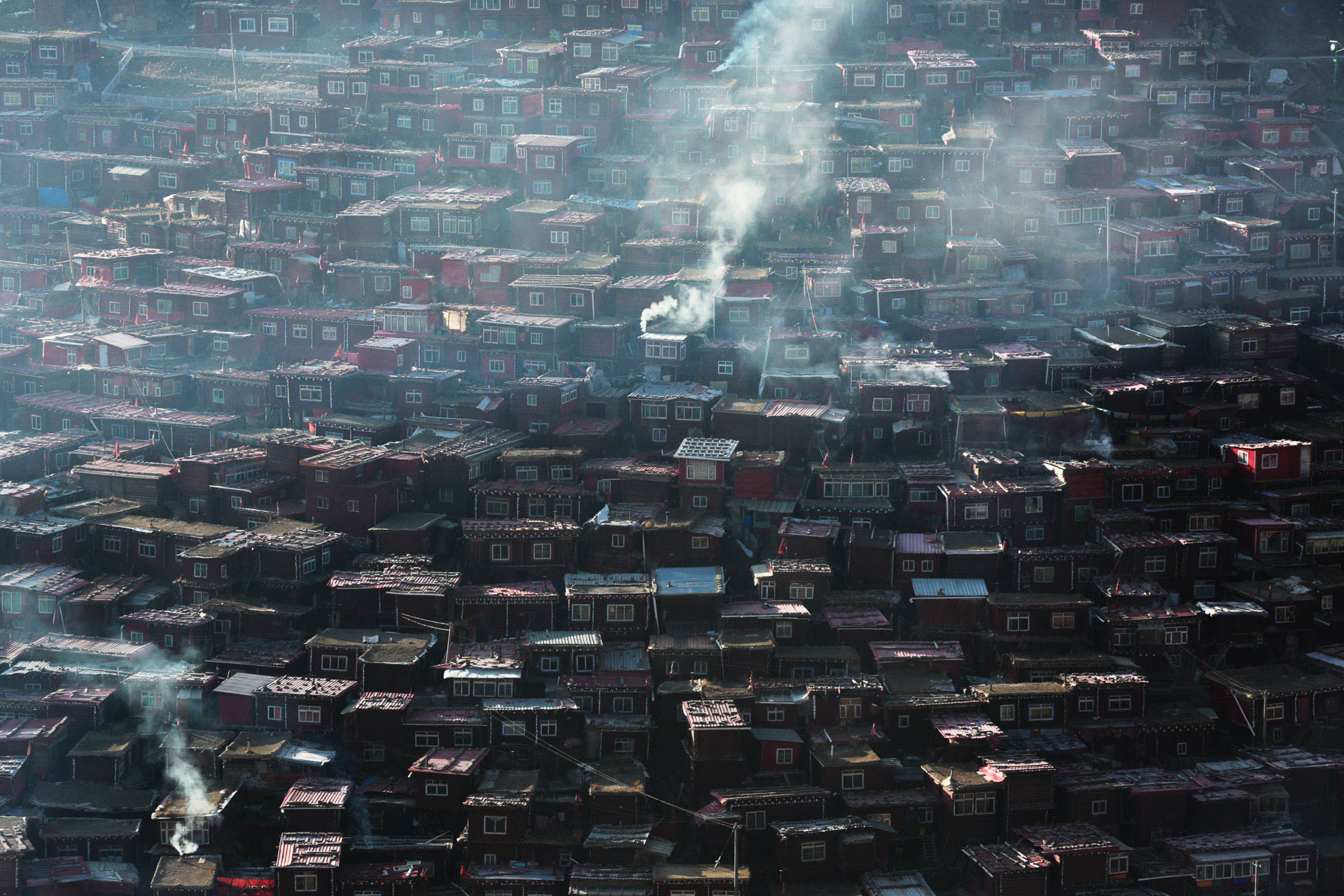 A family of pilgrims crawls towards Mount Kailash. Mount Kailash is considered as the center of the world by the Hindus, the Jains, the Buddhists and the Bönpos. It is said that circumambulation around Mount Kailash on foot brings good fortune to the pilgrims. Every year, thousands of believers come to practice this holy ritual.In early morning, smoke rises from red log cabins in the hill. Larung Gar is the largest Tibetan Buddhist institute in the world, with tens of thousands of monks.