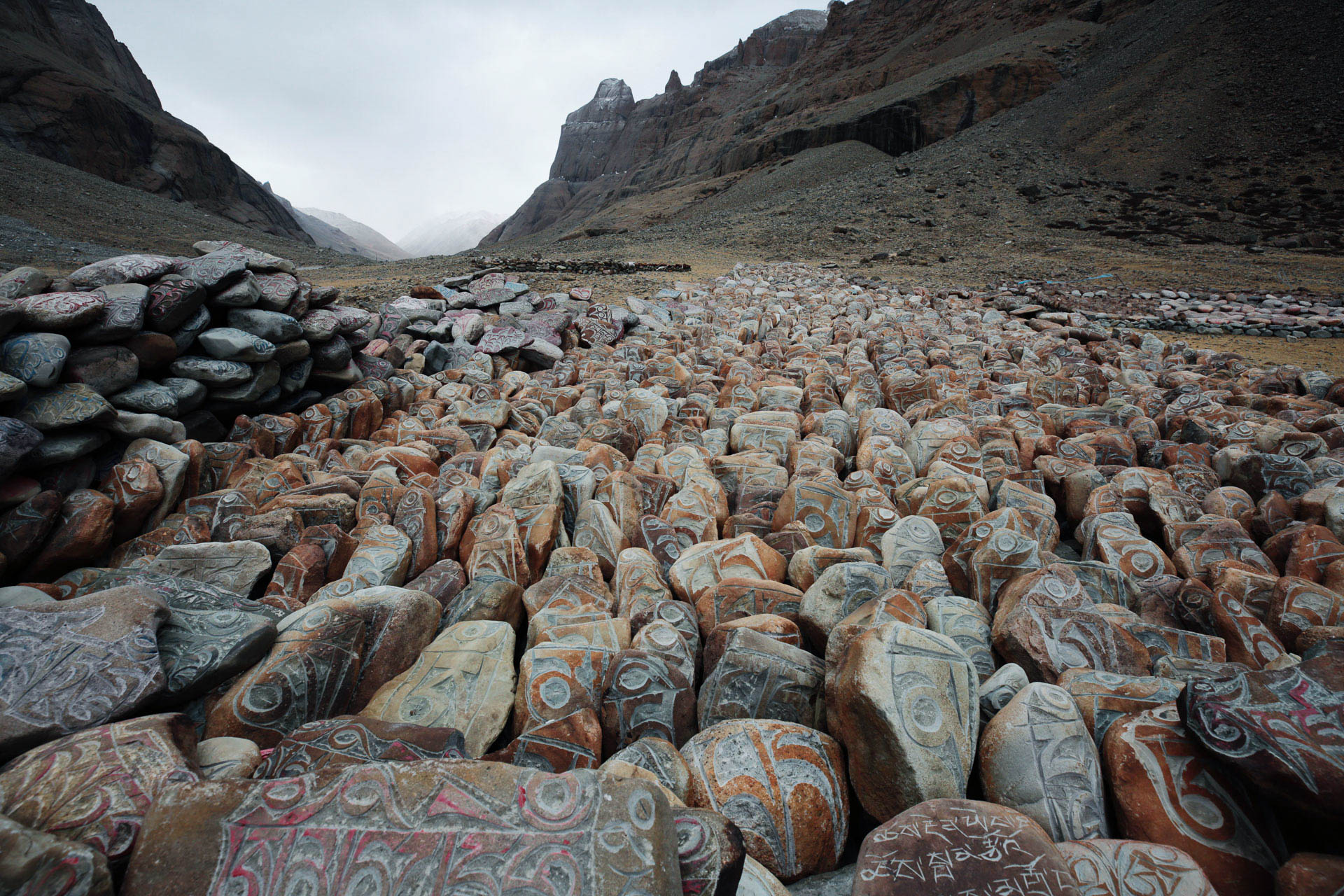 A pilgrim bows to the Lama giving class in the prayer hall.A large pile of Mani stones piled up by pilgrims over the years on the way to Mount Kailash, Tibetan pilgrims believe that these stones engraved with Buddhist mantra will bring them good auspices, Ngari.