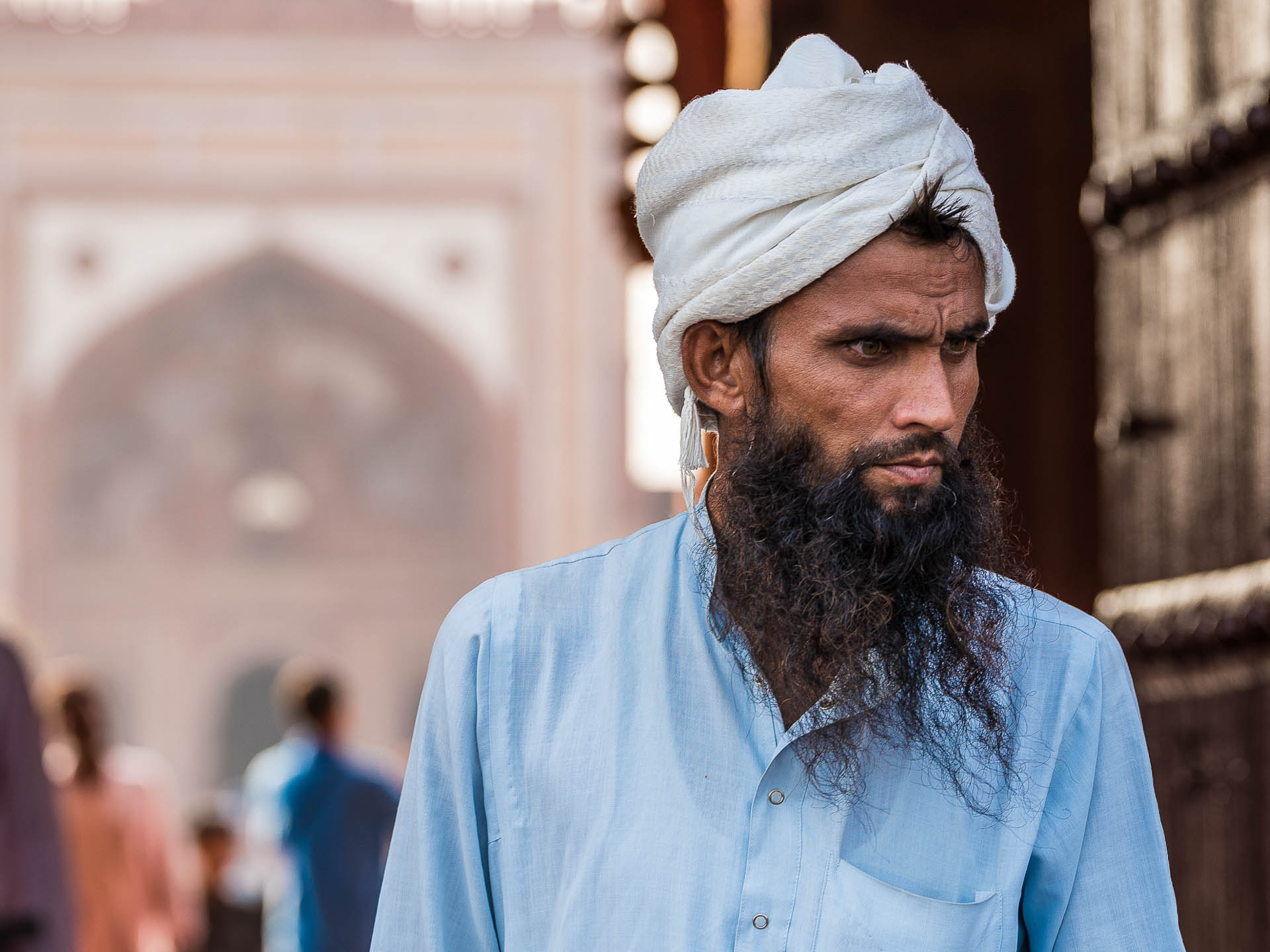 Um homem vestido com uma túnica azul-clara e um turbante branco atravessa a entrada monumental da histórica mesquita Jama Masjid, na Índia. O arco intricado atrás dele simboliza séculos de fé, enquanto a multidão ao fundo sugere um mundo onde tradição e complexidade moderna se encontram. Fatehpur Sikri, Índia, 2013