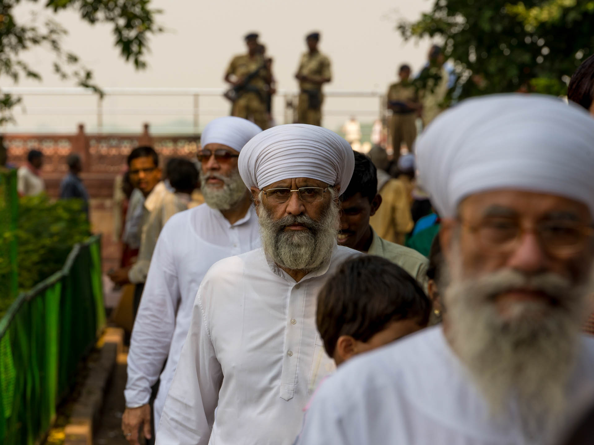 Uma procissão de fiéis vestidos de branco avança por um caminho estreito, sua unidade contrastando com guardas armados posicionados acima. A justaposição entre devoção e segurança reflete o equilíbrio frágil entre fé e medo em sociedades polarizadas. Taj Mahal, Agra, Índia, 2013
