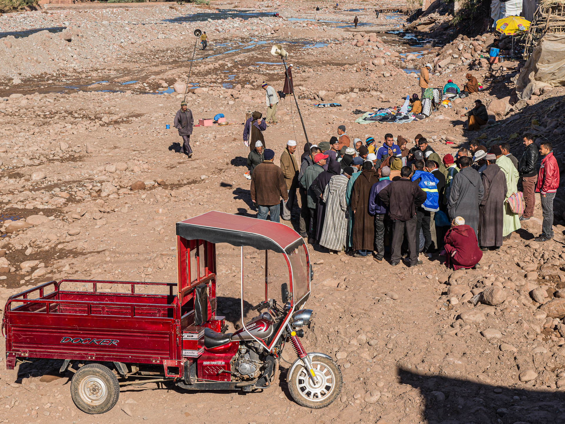 Um grupo de aldeões forma um círculo sobre o leito seco de um rio, sua reunião marcada pela simplicidade e determinação. Próximo dali, um veículo modesto evidencia a interseção entre tradição e sobrevivência em regiões onde a fé une comunidades. Fez, Marrocos, 2014