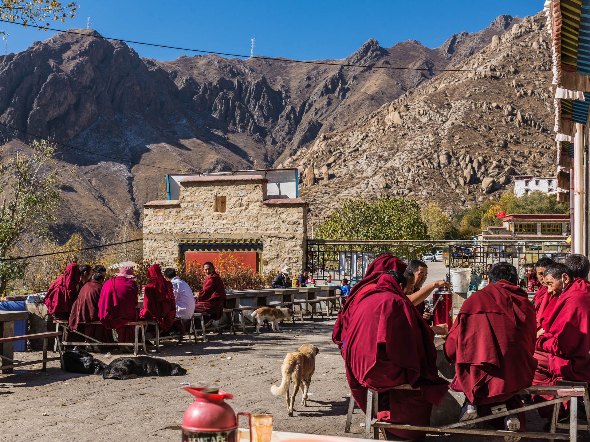 Grupos de monges em túnicas carmesim compartilham uma refeição ao ar livre, tendo como pano de fundo montanhas austeras. Sua vida comunitária, enraizada em práticas seculares, oferece um contraponto ao isolamento e à fragmentação do mundo moderno. Mosteiro Drepung, Tibete, 2013