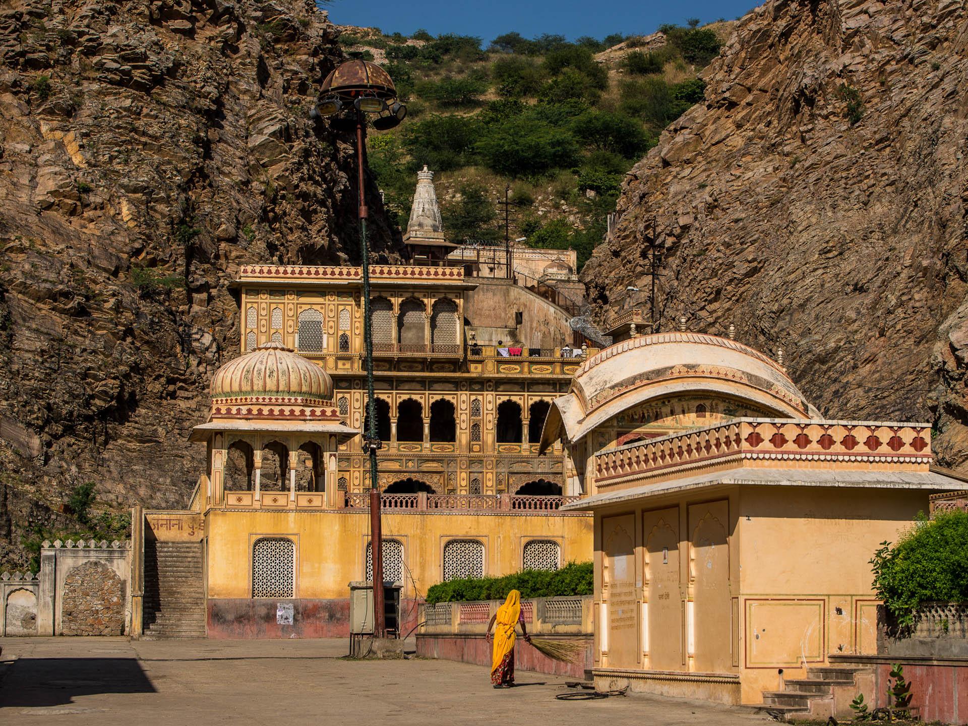 Uma devota vestida de açafrão caminha em direção a um templo ornamentado, incrustado entre encostas rochosas. A solidão da cena contrasta com a grandiosidade da arquitetura, evocando a persistência silenciosa da crença em uma paisagem dividida. Templo Oly Gaddi, Jaipur, Índia, 2013