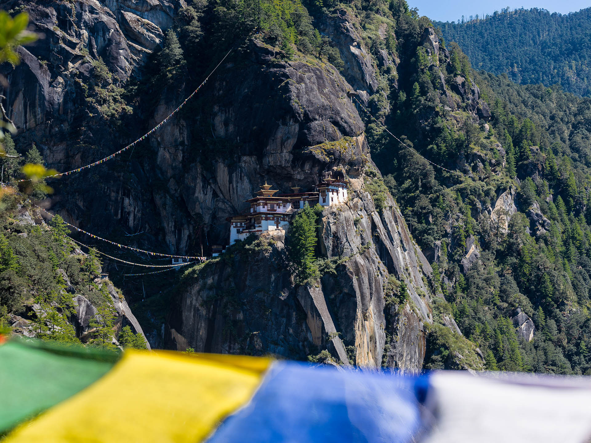 Um mosteiro se agarra a uma falésia íngreme, emoldurado por vibrantes bandeiras de oração que tremulam ao vento. No alto dos Himalaias, este refúgio remoto encarna a resiliência espiritual em um mundo fraturado por fronteiras e ideologias. Mosteiro Paro Taktsang (Ninho do Tigre), Butão, 2013