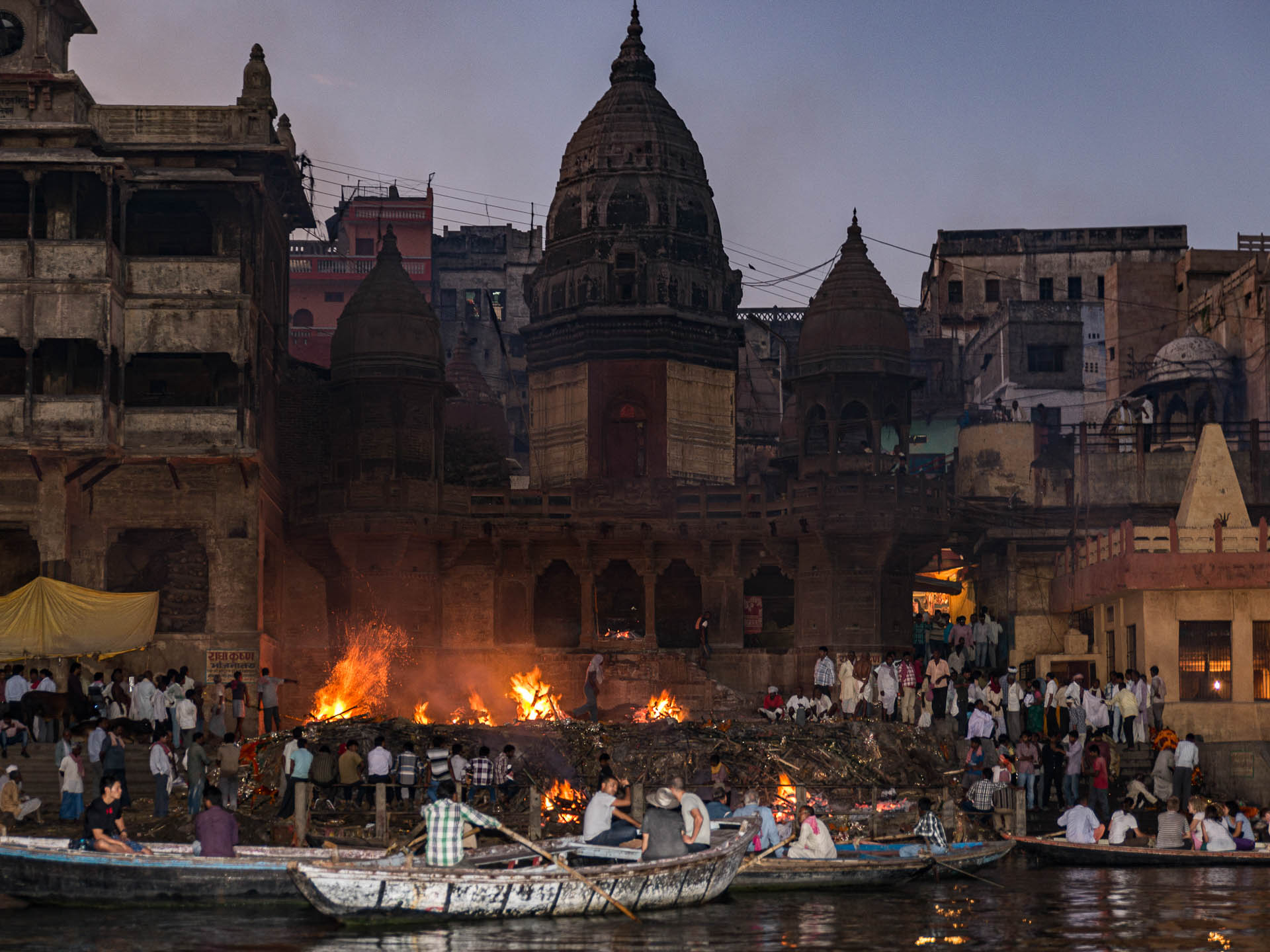 Piras funerárias ardem ao longo da margem sagrada do rio em Varanasi, onde vida e morte convergem em ritual. As torres do templo antigo erguem-se sobre a cena, lembrando-nos do poder duradouro da crença em meio ao caos da modernidade. Varanasi, Índia, 2013