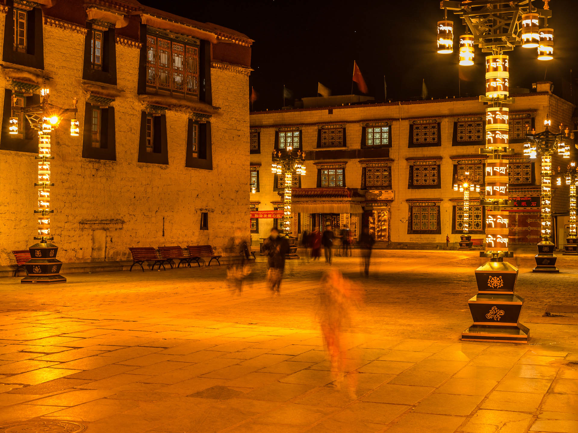 Uma praça sagrada brilha sob lanternas douradas enquanto figuras se movem em suaves borrões, sua presença efêmera e, ainda assim, profunda. Esta cena noturna captura o ritmo da devoção em um espaço onde história e espiritualidade convergem. Praça Barkhor, Lhasa, Tibete, 2013