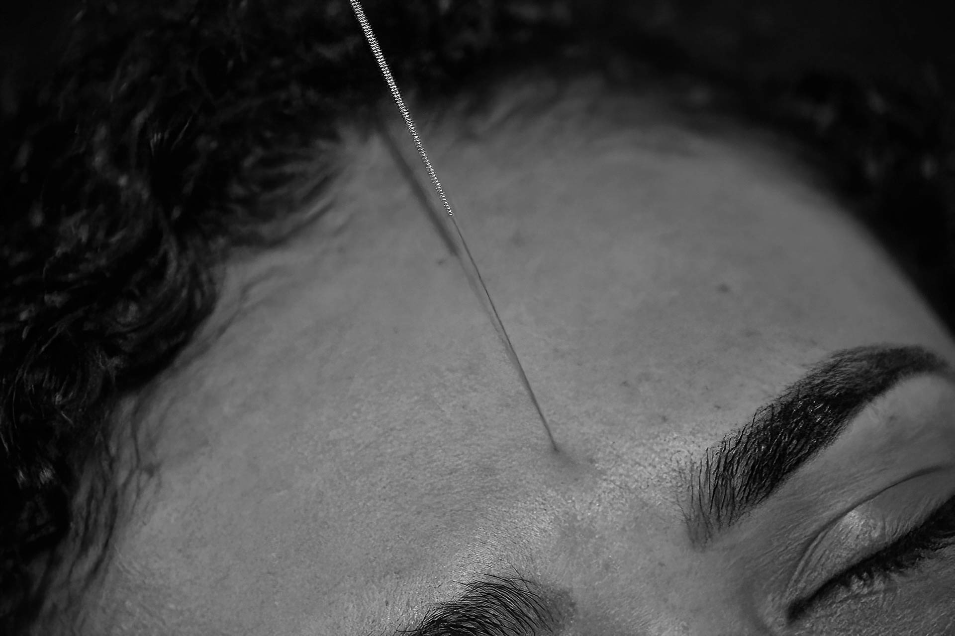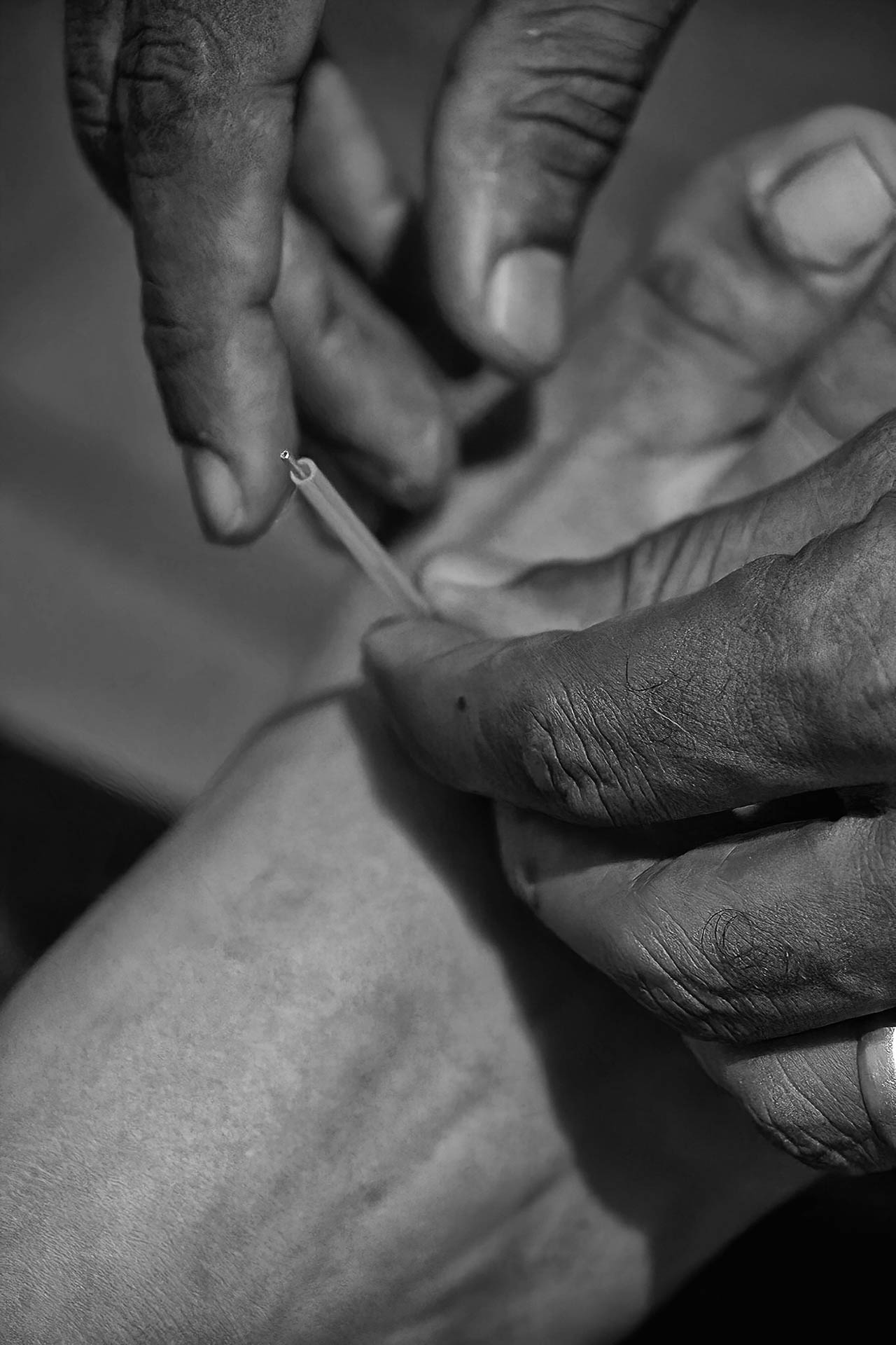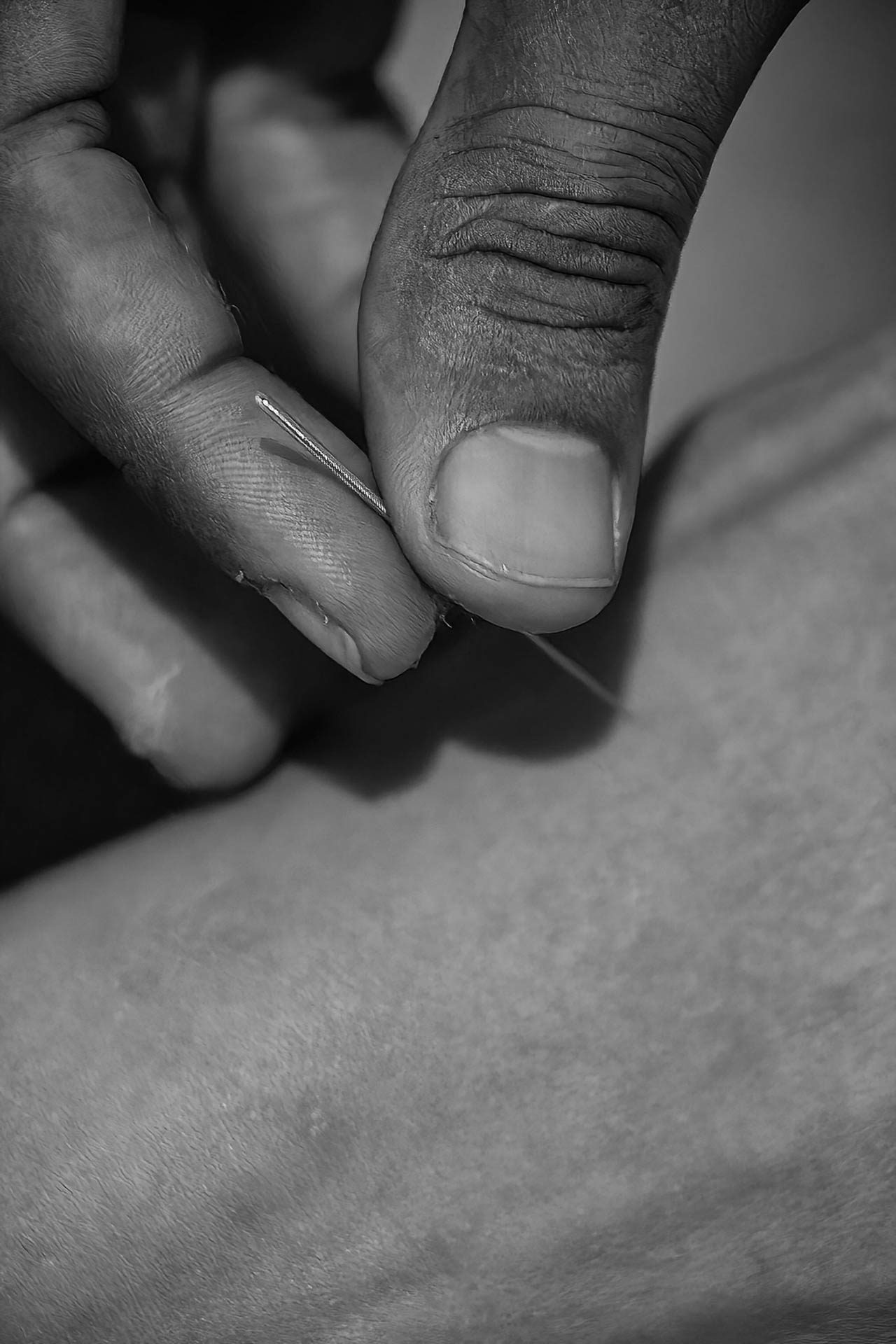 A escolha pelo preto e branco de alto contraste busca destacar a textura da pele, a leveza da fumaça e a frieza das agulhas, elementos que se fundem em um processo de entrega e confiança mútua entre o terapeuta e o paciente. Mais do que registrar um procedimento, as imagens buscam capturar o silêncio e o estado contemplativo necessários para a busca do equilíbrio interior.