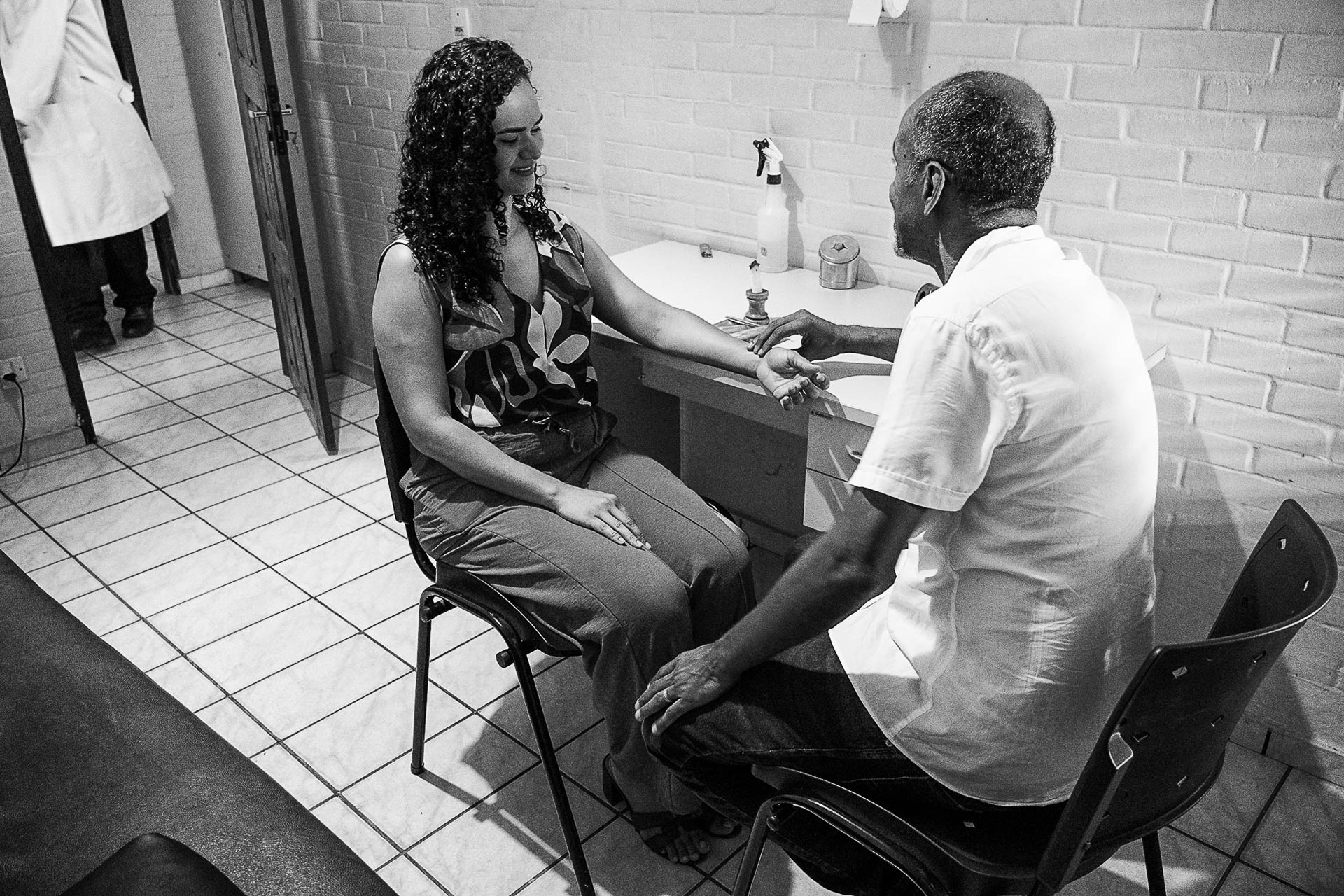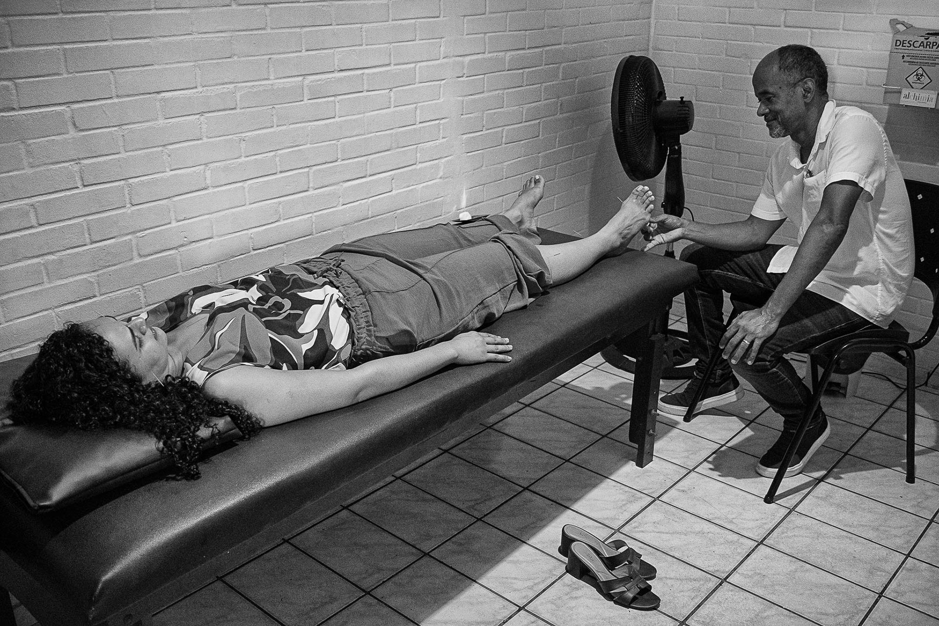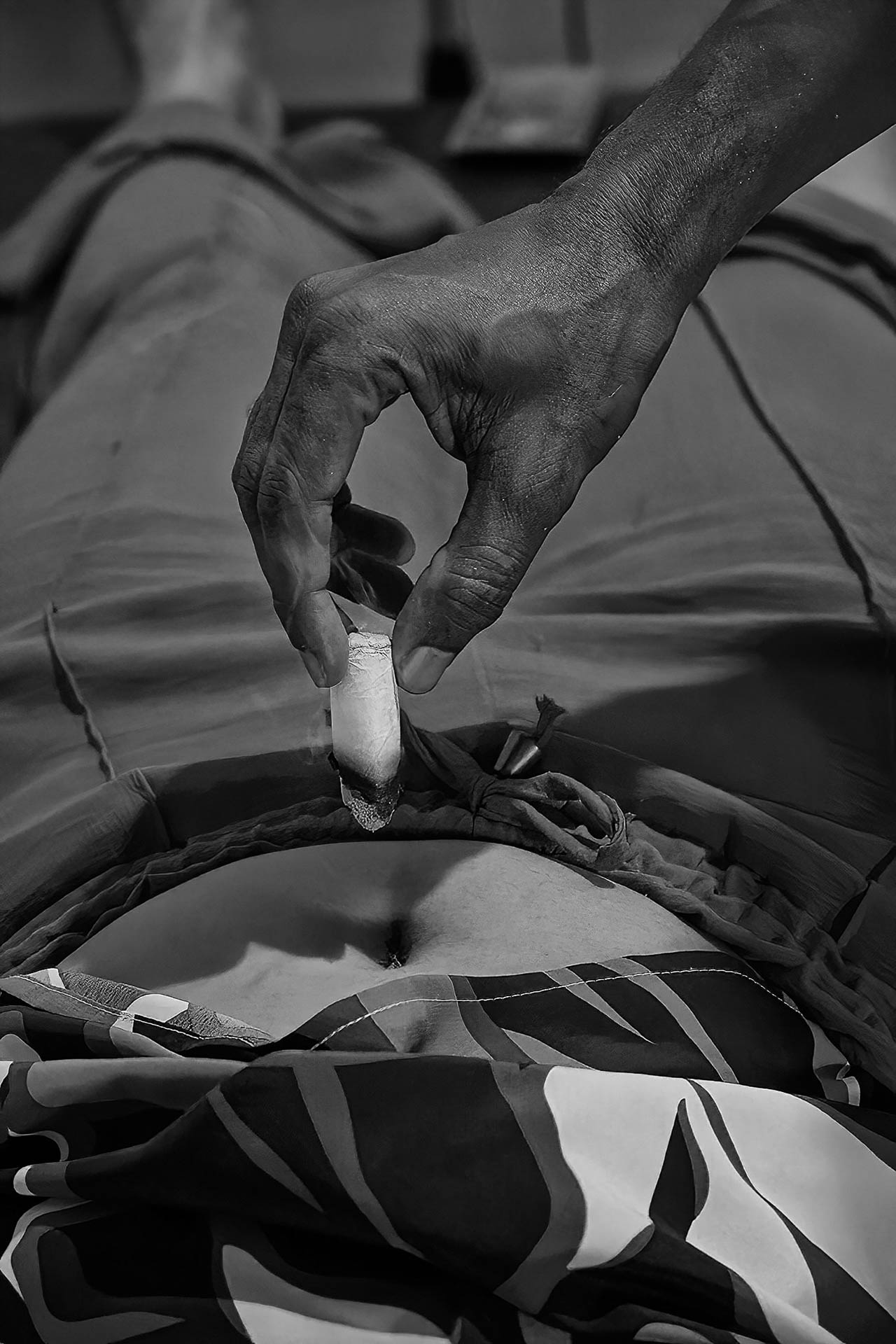 A escolha pelo preto e branco de alto contraste busca destacar a textura da pele, a leveza da fumaça e a frieza das agulhas, elementos que se fundem em um processo de entrega e confiança mútua entre o terapeuta e o paciente. Mais do que registrar um procedimento, as imagens buscam capturar o silêncio e o estado contemplativo necessários para a busca do equilíbrio interior.