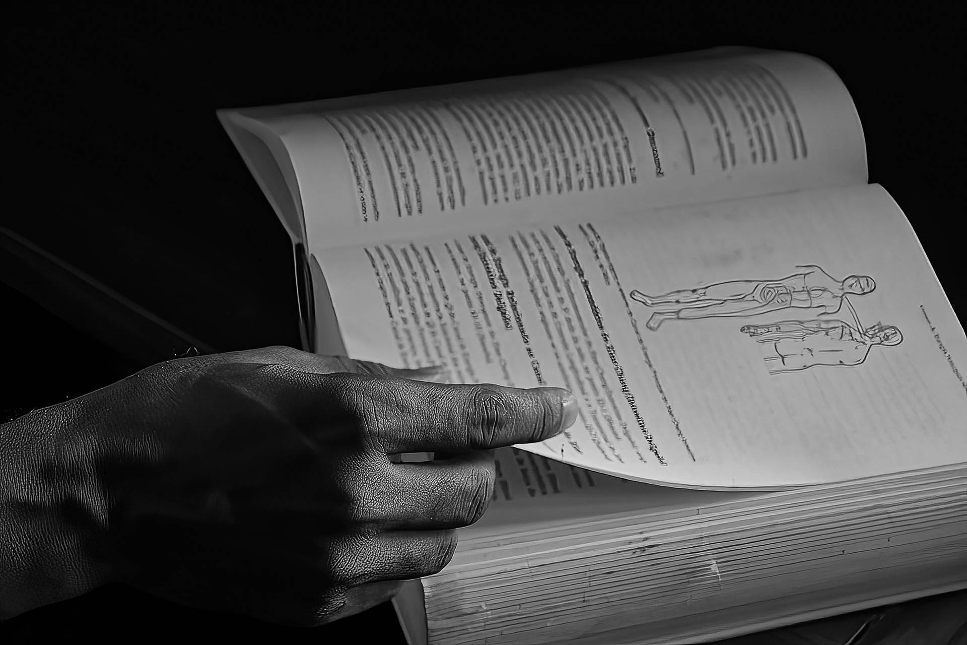 Close-up do dedo sobre o mapa anatômico, evidenciando o embasamento teórico e a tradição milenar da técnica.