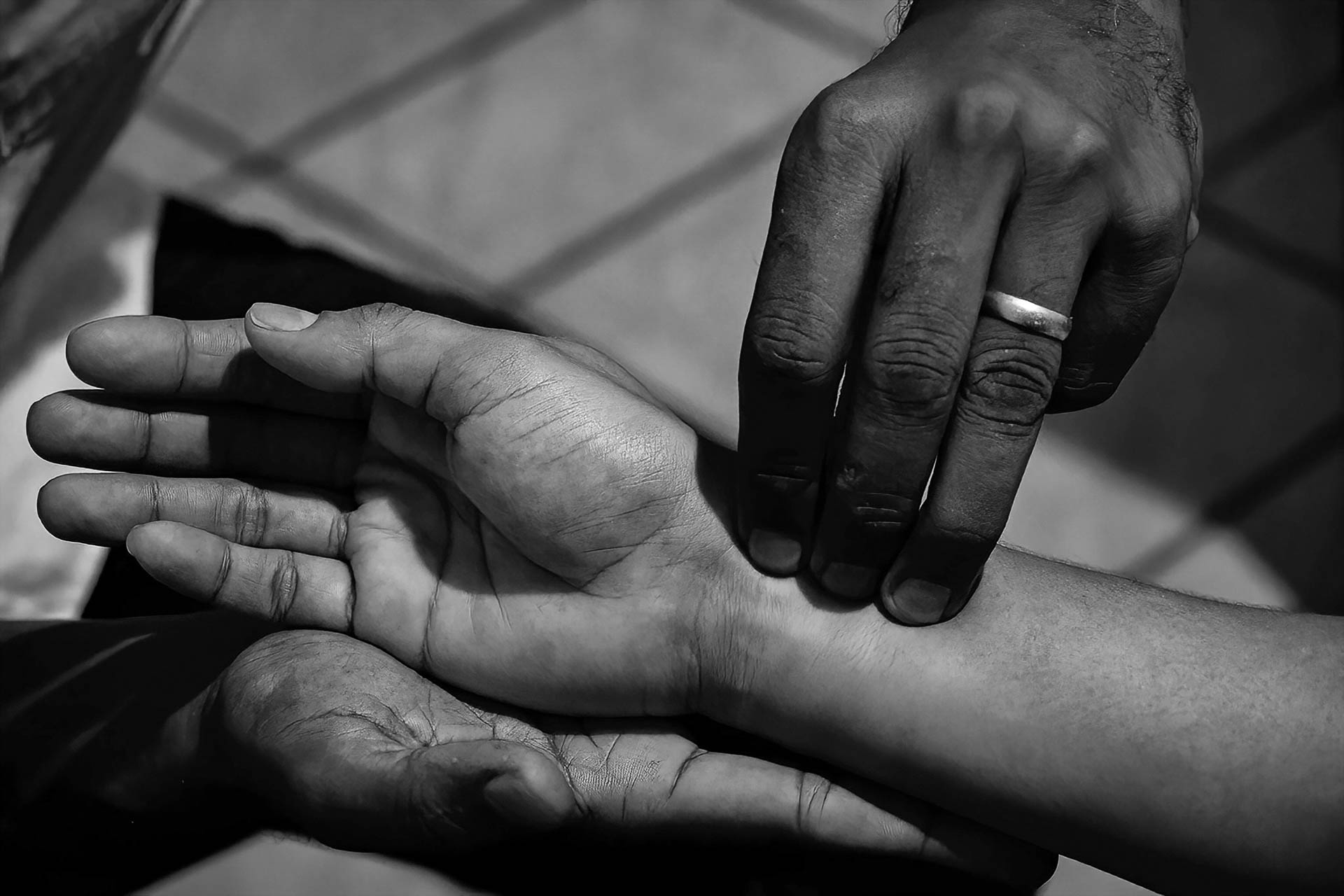 Detalhe do diagnóstico através da pulsação, onde o toque traduz o estado interno do paciente.