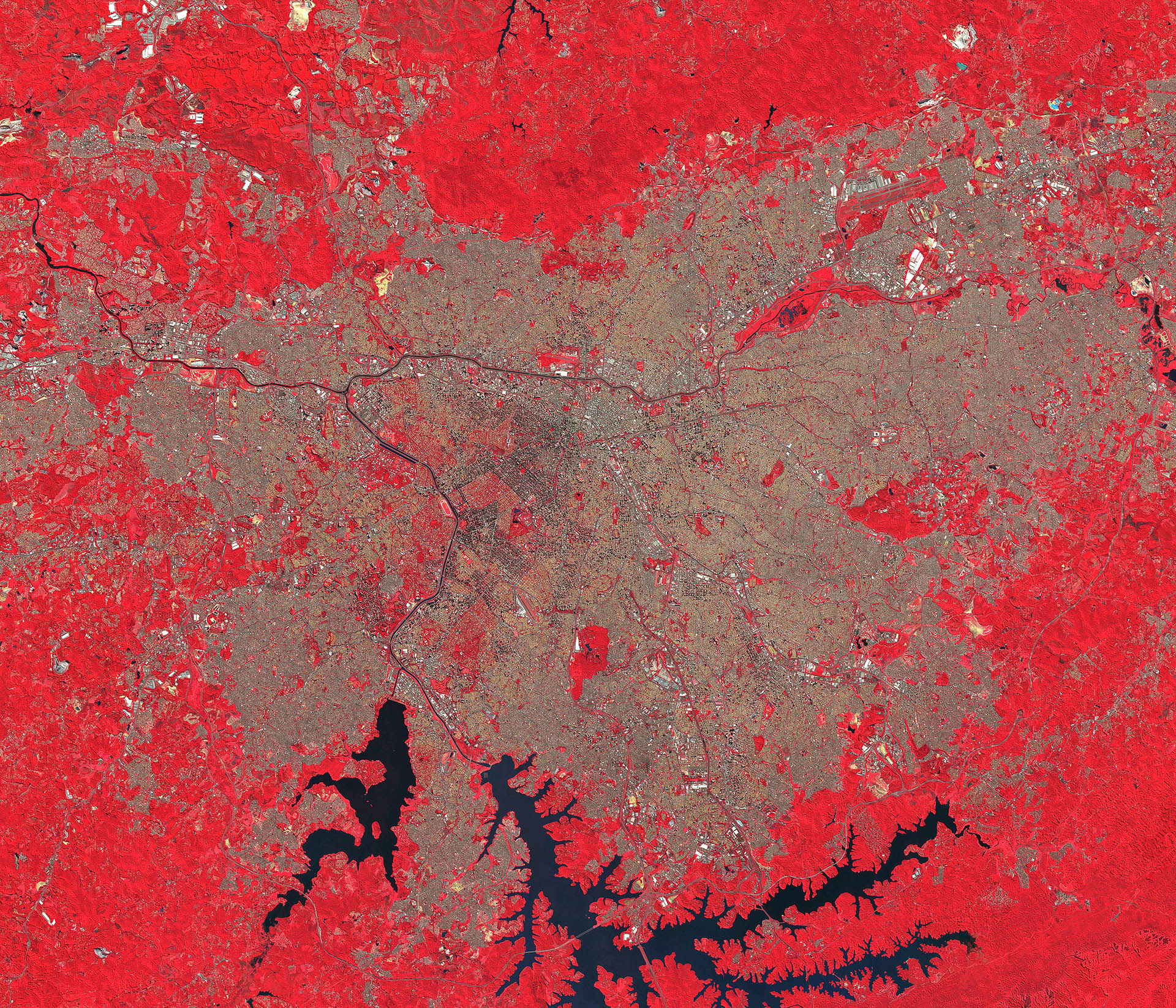 An infrared image of the center of São Paulo and in the back the perifery areas. The red in the image represent the green areas of the city. São Paulo Brazil