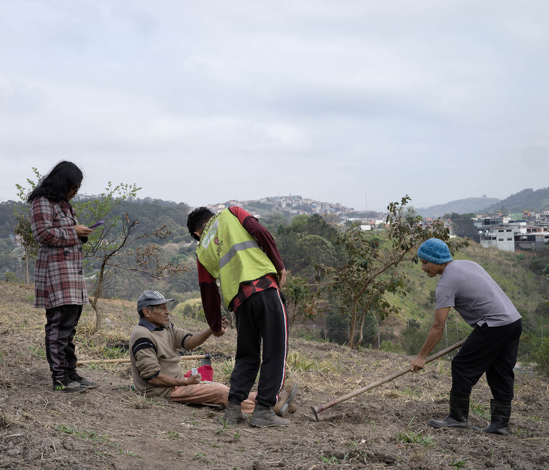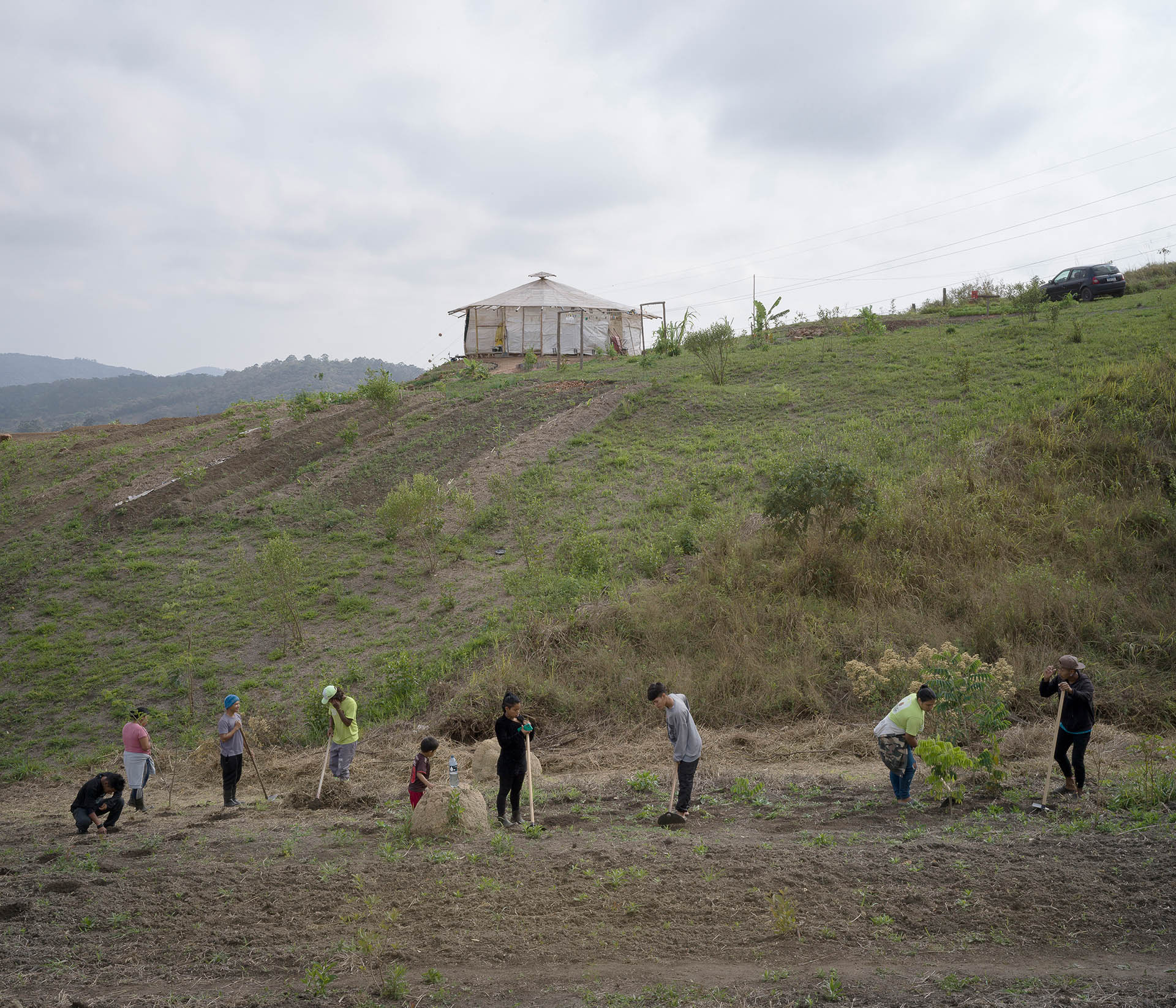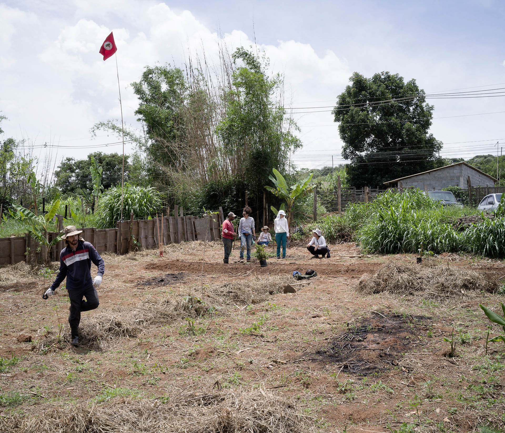 Volunteers of the MST movement (Without land movement), prepare a field to be used with the agro-forestal technique, a way of using the land that mix native trees, fruit trees and vegetables. The area is part of the land occupation named Irmã Alberta Community. Farmers occupied 15 years ago a land used as dump own by the water company to grow organic vegetables. The Brazilian Constitution allow to occupy lands that would be for agriculture but they are not productive.