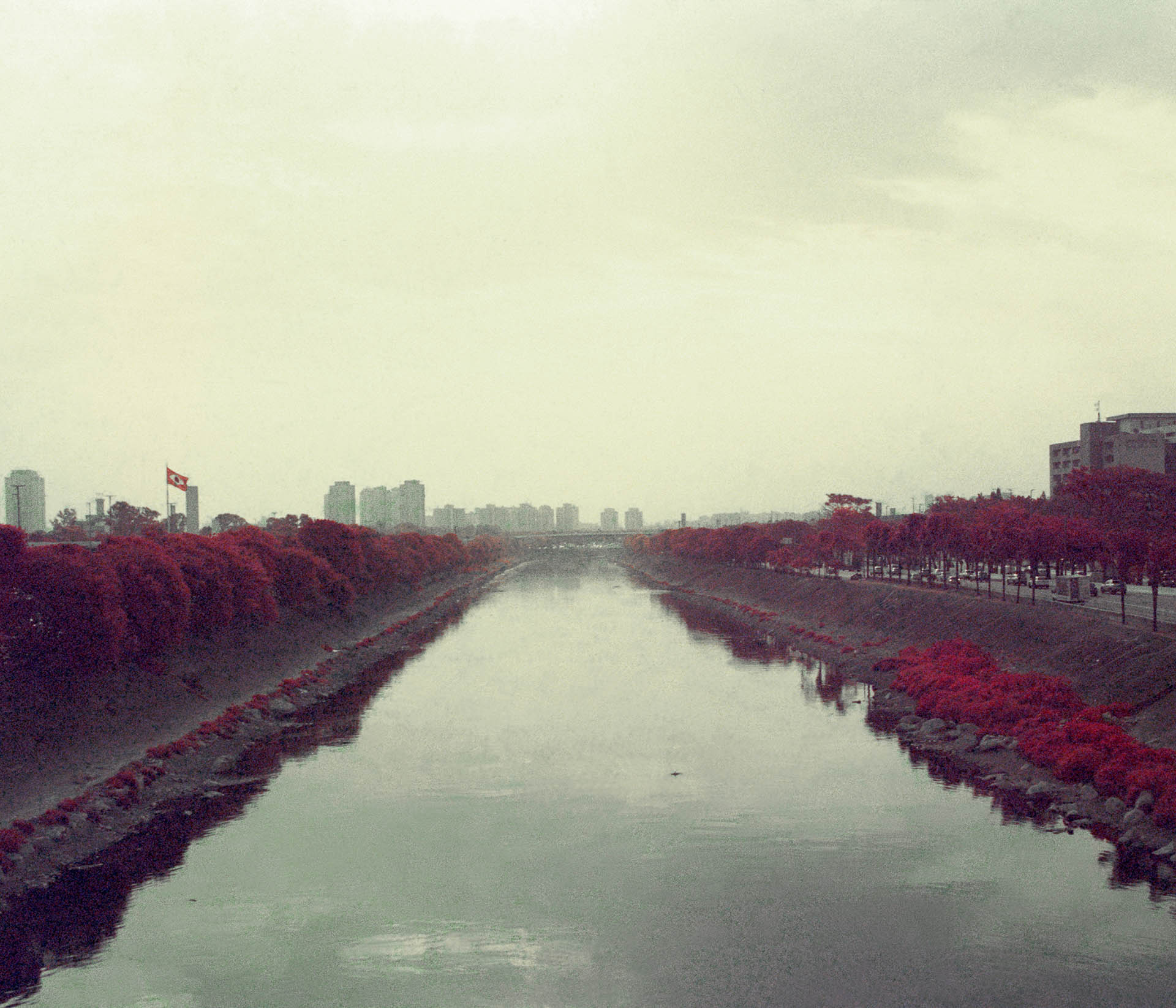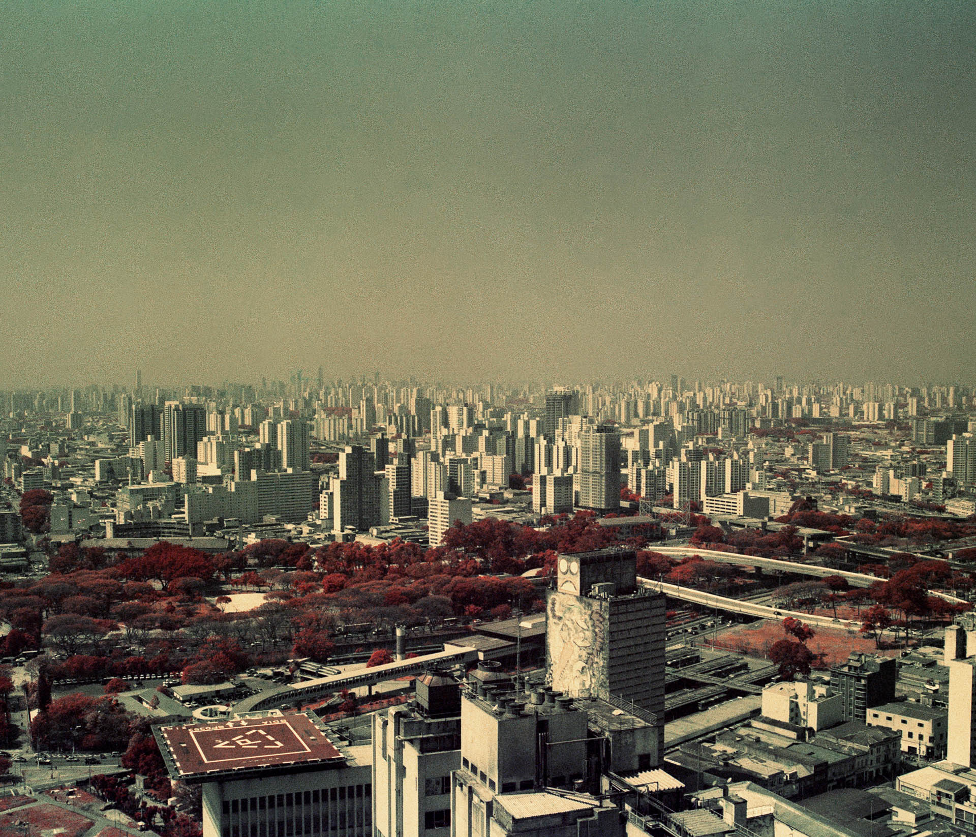 An infrared image of the center of São Paulo and in the back the perifery areas. The red in the image represent the green areas of the city.