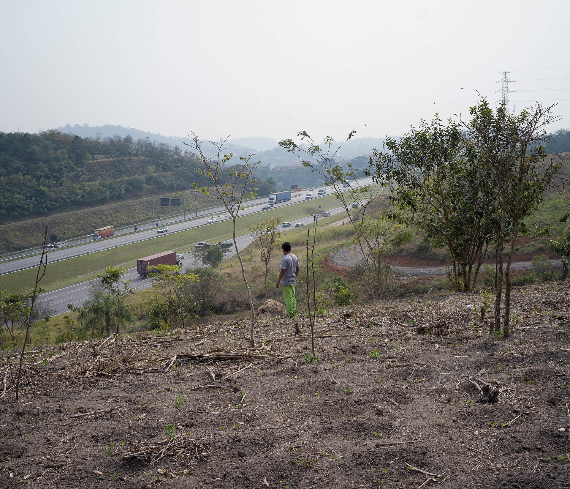 A Guarani of the village Tekoa Pindo Mirim look at the highway that limit the indigenous territory. São Paulo Brazil