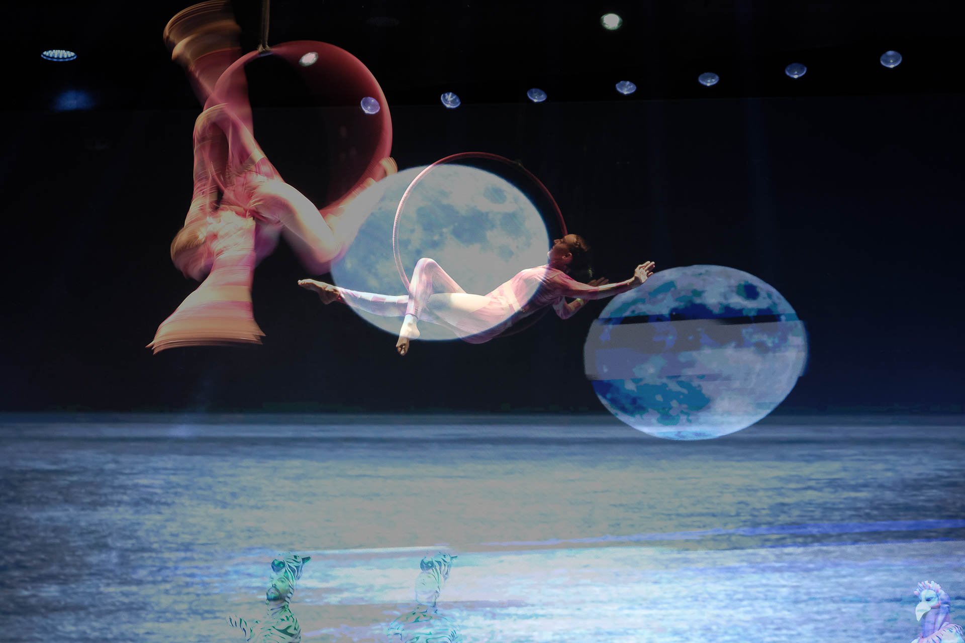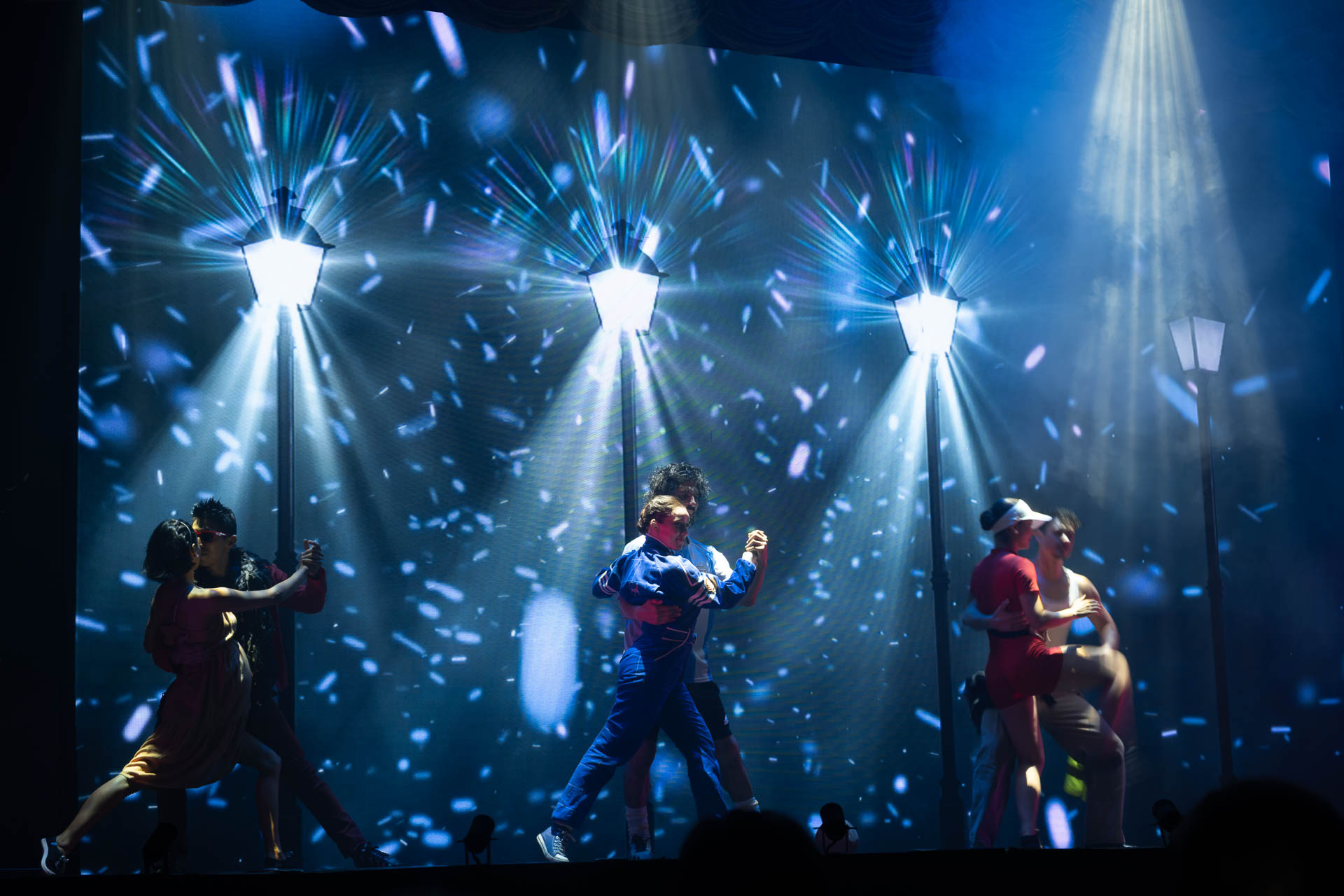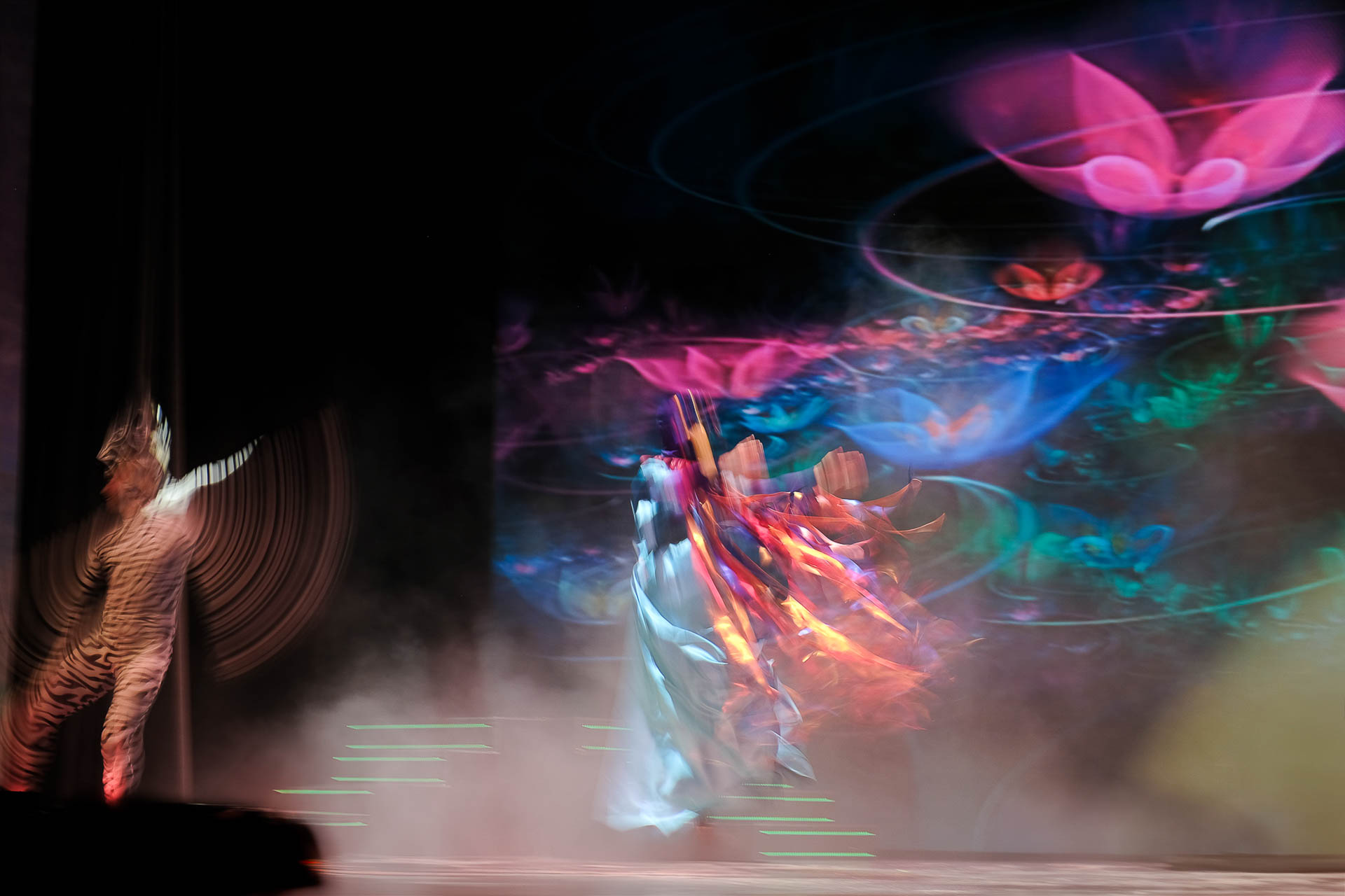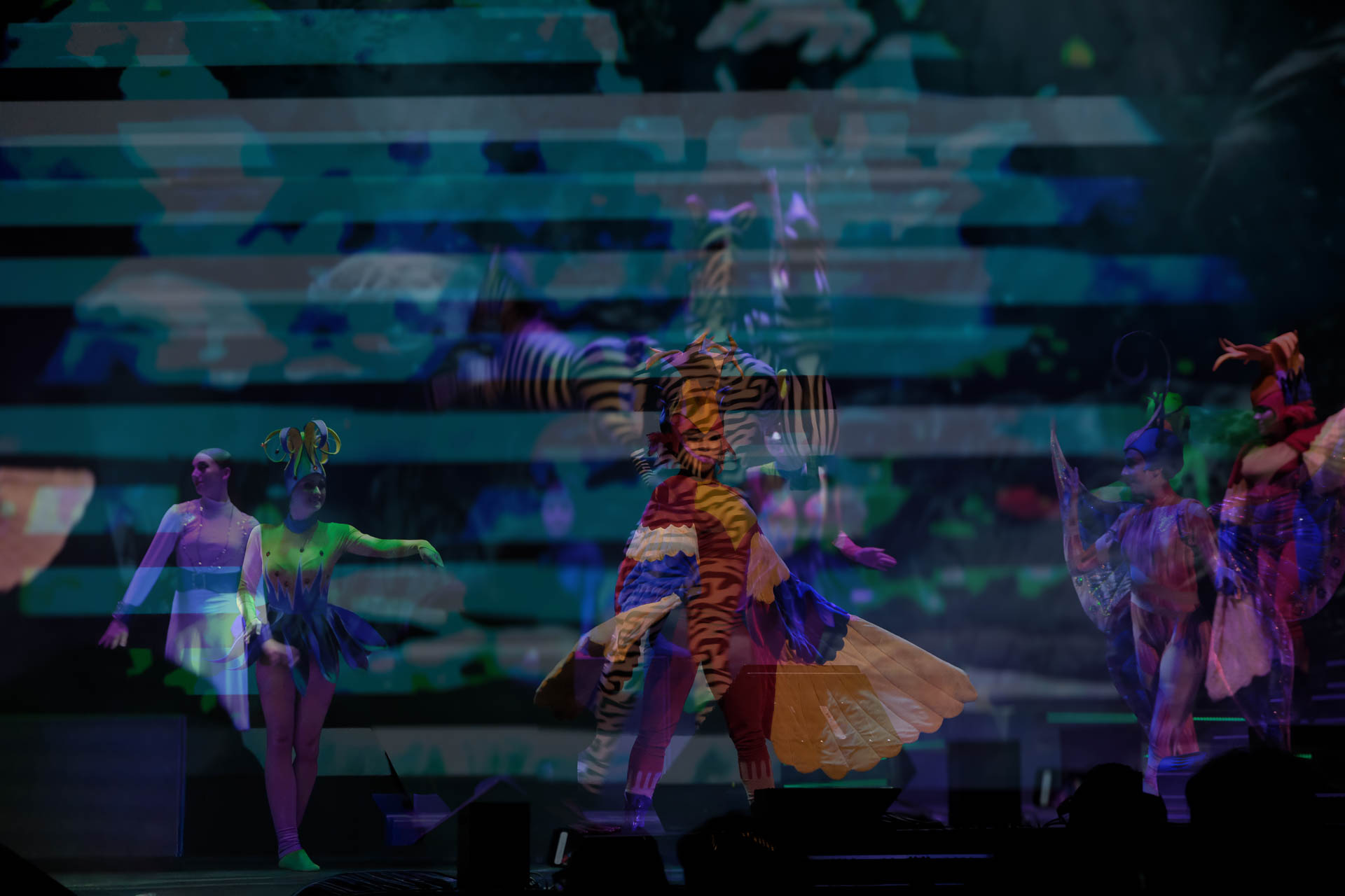 em camadas de luz, cor e projeção digital. A fusão entre figurino, gesto e ambiente cria um