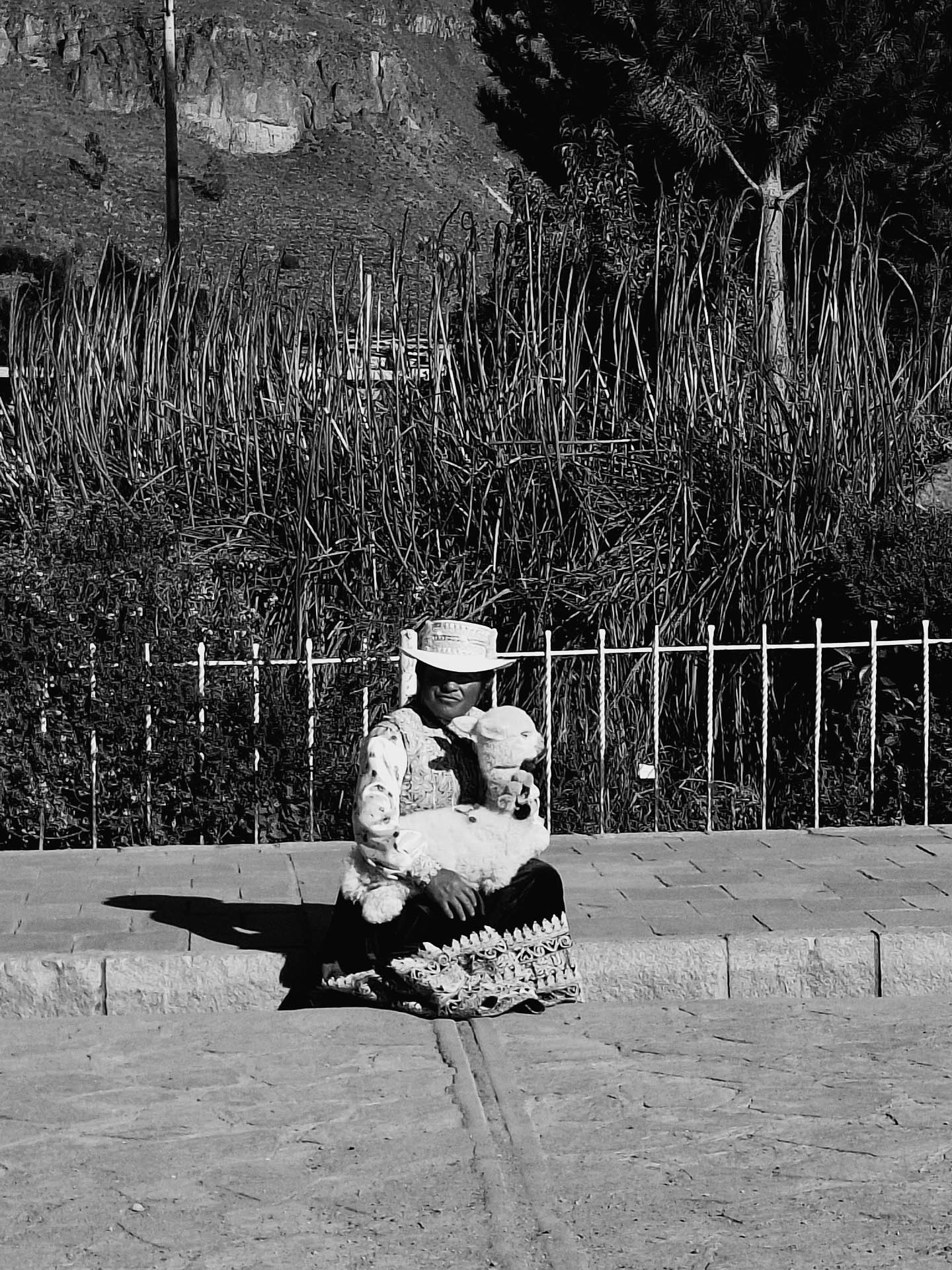 Peru y sus costumbres representadas en una señora indigena sentadacon el animal emblemático de Perú
