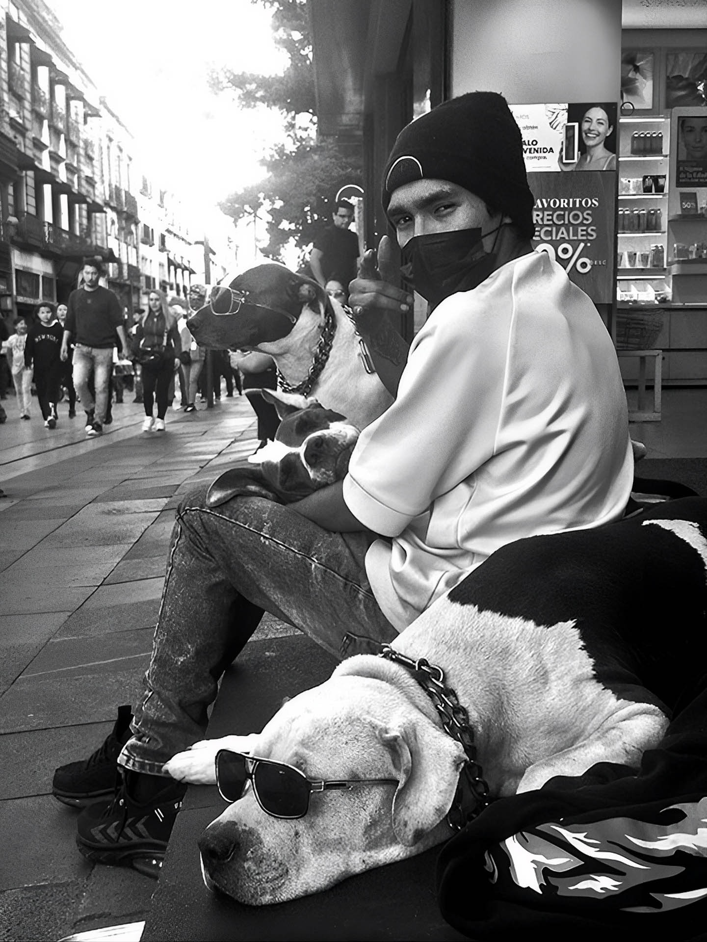 Una tarde en el centro histórico pude fotografiar a un chico con sus dos perros , buscaban obtener recursos económicos para alimentarlos, fueron estrellas de la fotografia y muestra de la desigualdad social que se visualiza en este lugar.