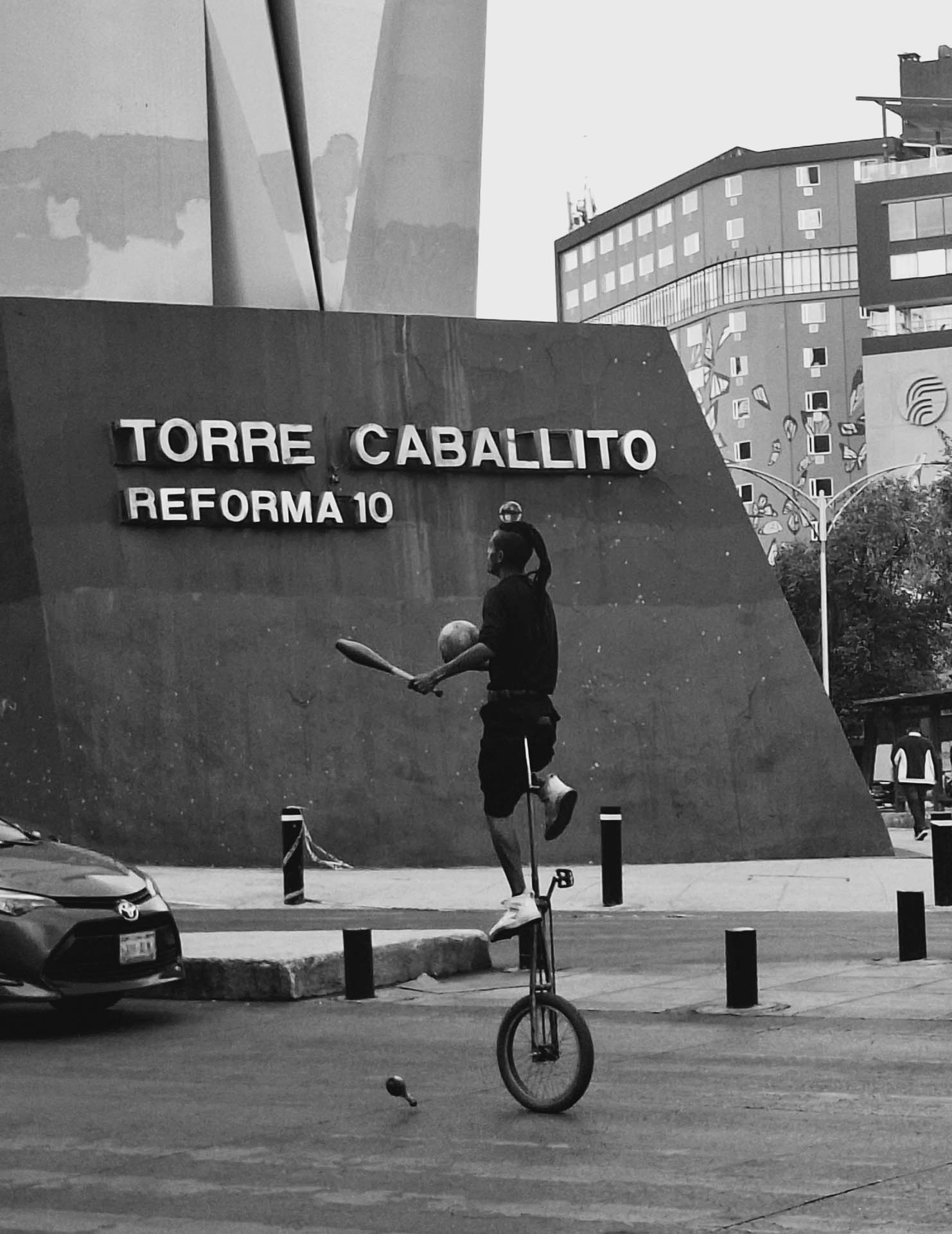 En una tarde nublada capturé esta fotografía en la que un chico realiza malabares encima de un monociclo con la finalidad de obtener recursos económicos . Miles de jóvenes en la Ciudad realizan espectáculos callejeros para obtener ingresos , ya que las oportunidades educativas y laborales no siempre son las mejores.
