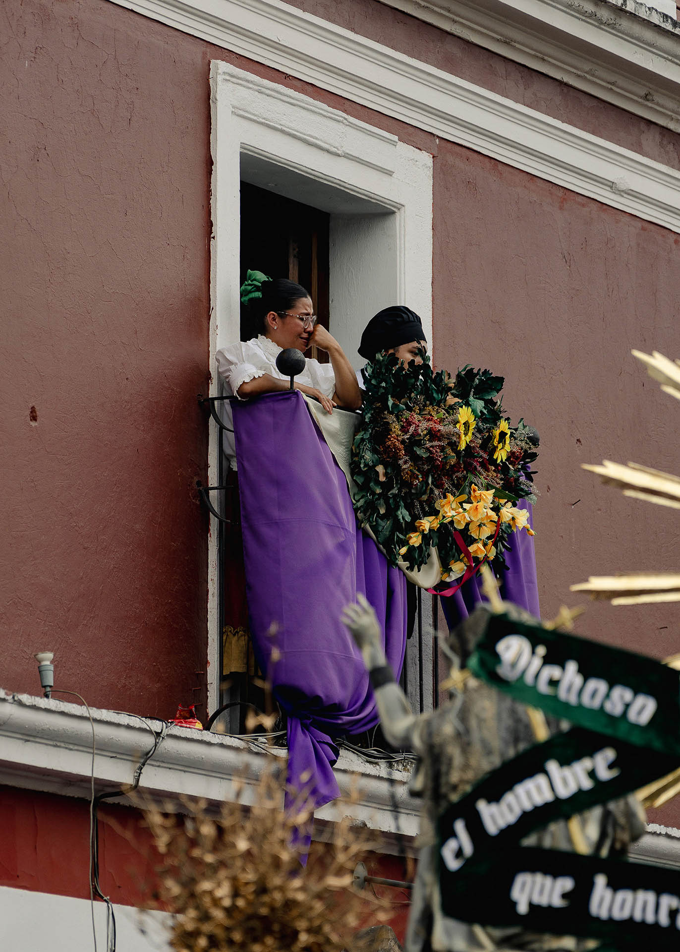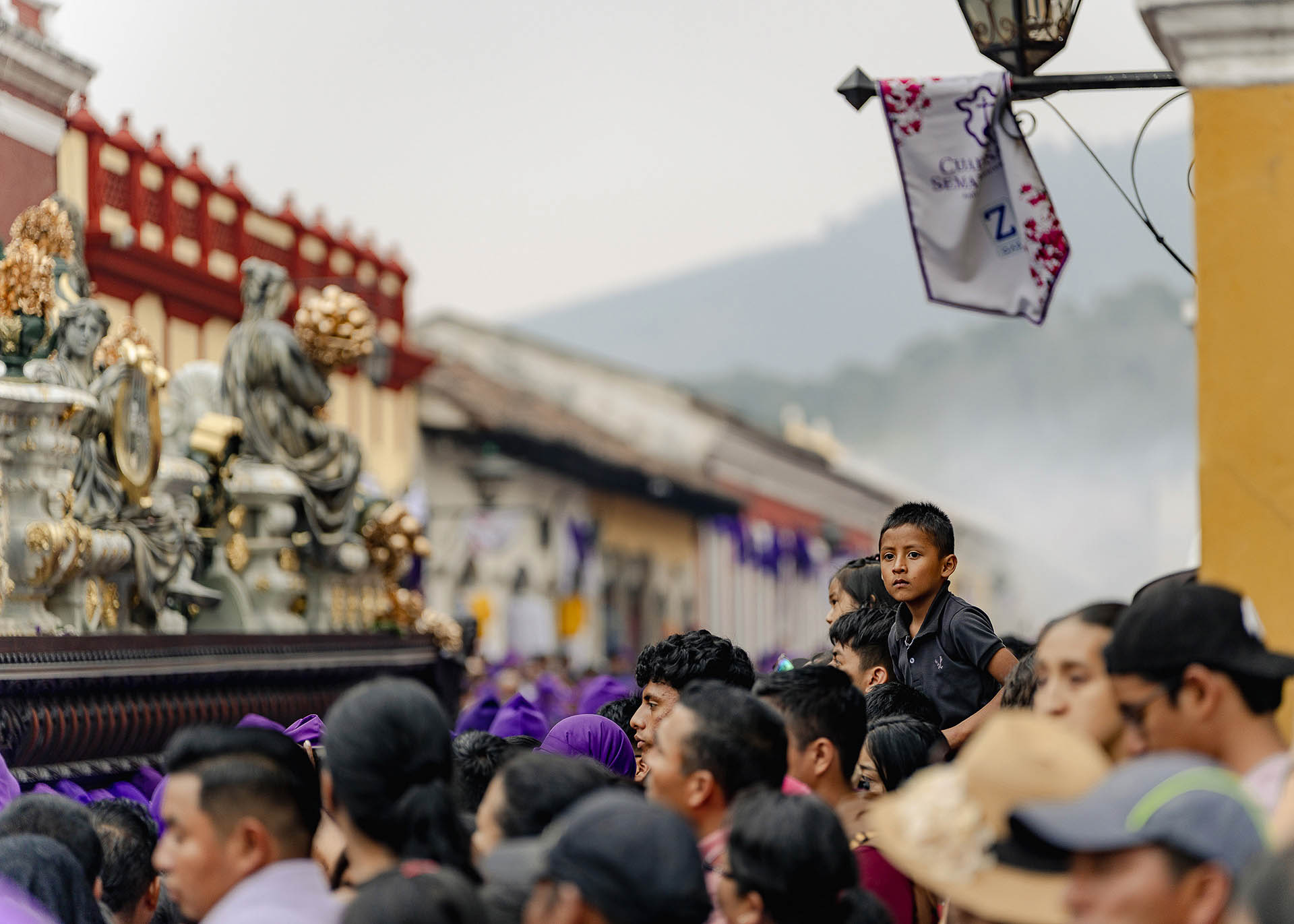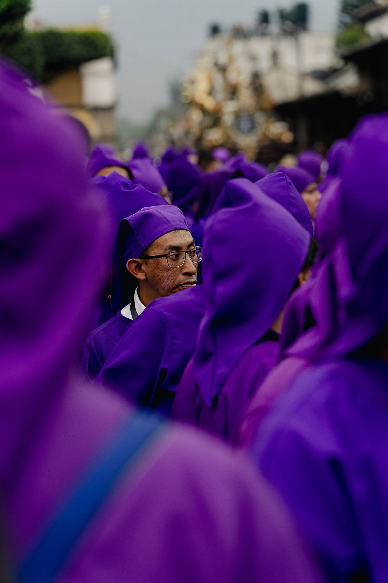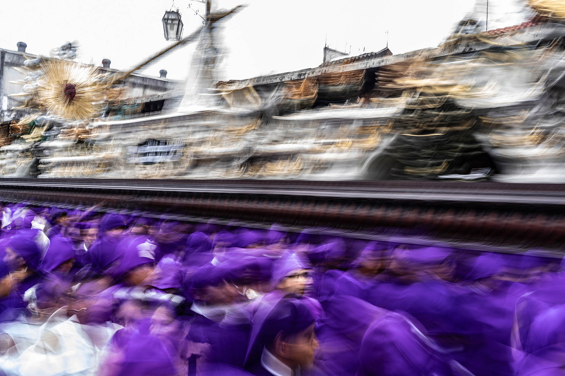 Num primeiro olhar o ensaio mostra a devoção no Domingo de Ramos na cidade de La Antigua Guatemala. A tradição católica atrai visitantes de todo o país e mobiliza a comunidade local num desfile carregado de simbolismo e miscigenação cultural e pesar. Vemos rostos maias travestidos de soldados romanos, encobertos por mantos na cor púrpura transportando barcas com mais de 20 metros, de madeira maciça, nos ombros embalados por um balanço lateral ritmado pela marcha fúnebre. As mulheres, de preto. Os homens de púrpura. E os espectadores, com suas vestes multicoloridas, simbolizando a tradição maia que vive em cada Pueblo.