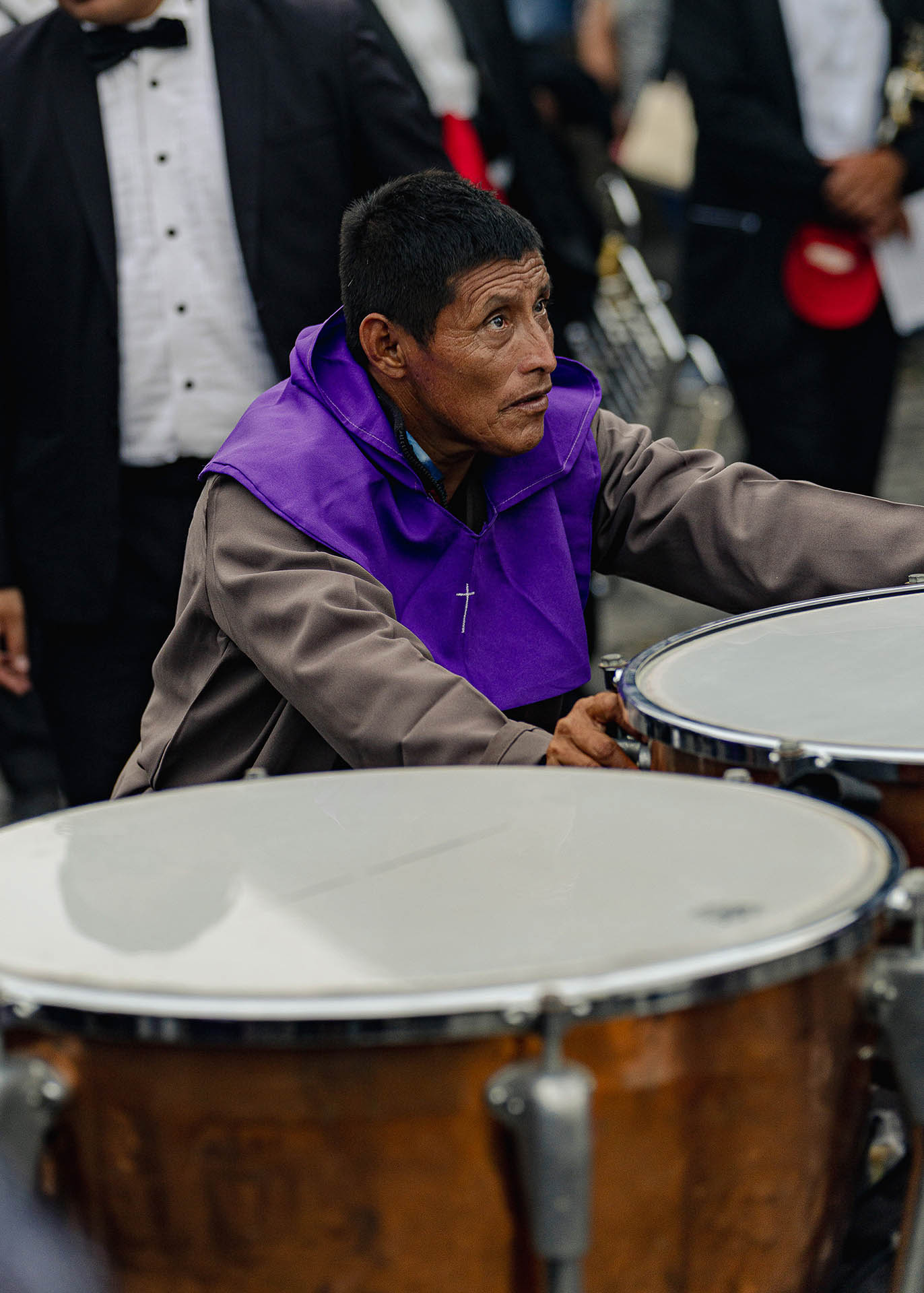 Entre as túnicas púrpura, um de vários rostos indígenas seguindo o cortejo.