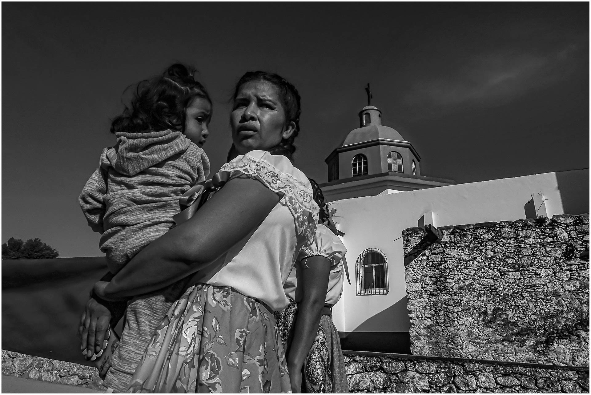 Madre con hija en brazos pasan frente al templo, la importancia de la familia en la preservación de nuestras tradiciones es vital, se asegura la continuidad y fortalece la identidad de nuestro pueblo.