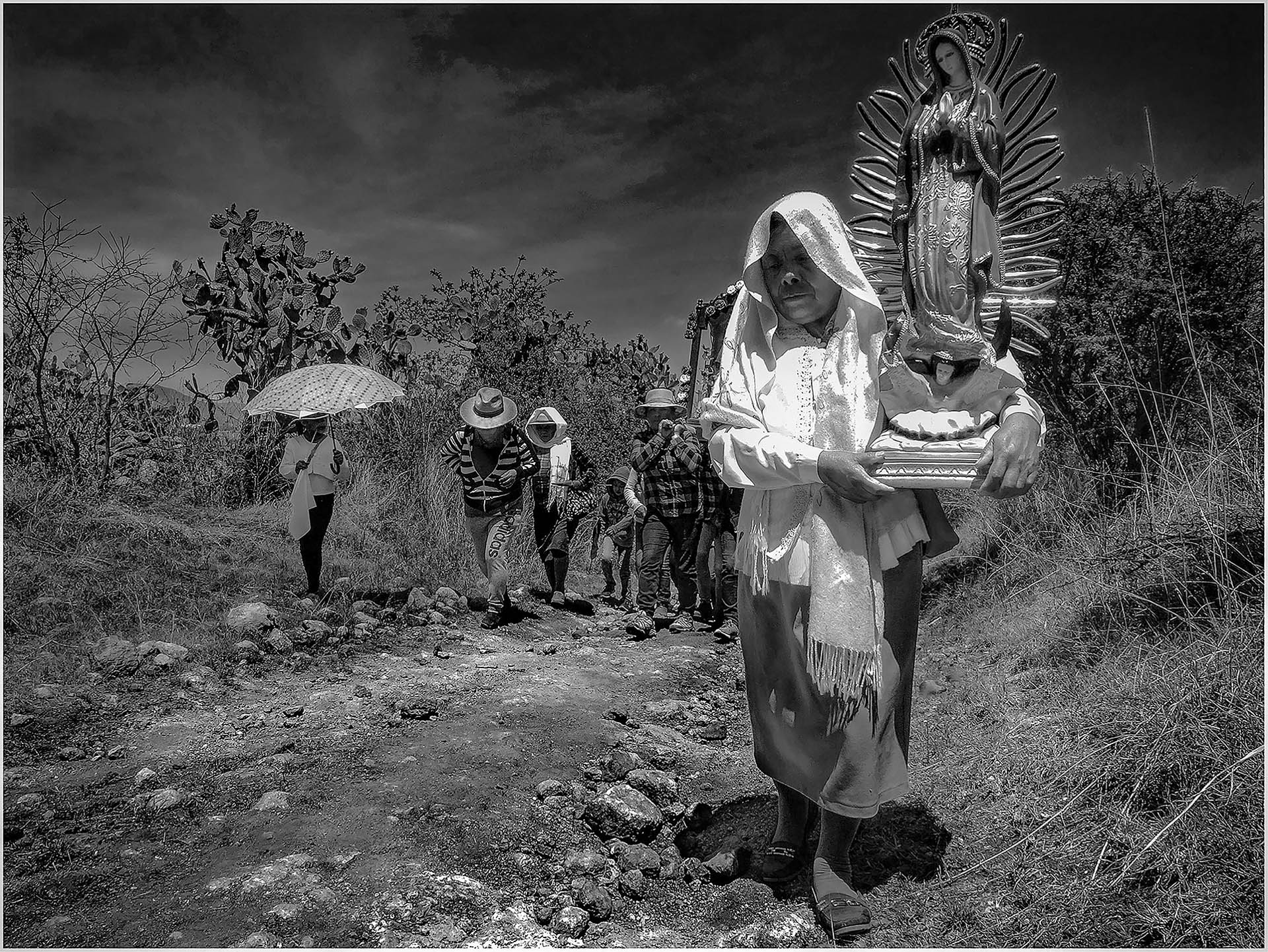 Sin importar la edad, la fe puesta en la imagen dota de fortaleza, una mujer avanza sobre un escarpada subida llevando en brazos su propia guadalupana, en su rostro se refleja el orgullo que impregna la “Madre de los mexicanos”