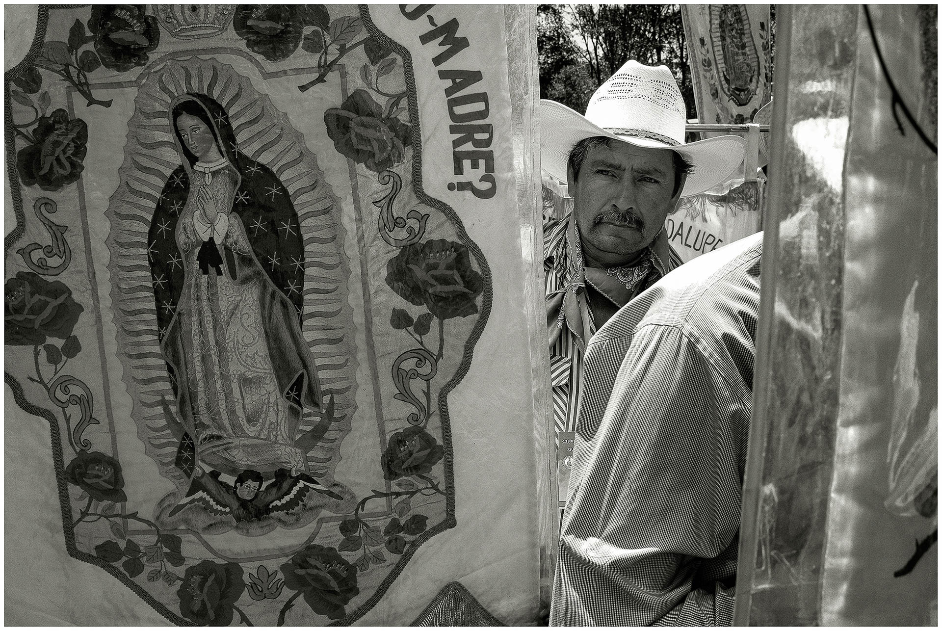 El rostro de un hombre que cubre su cabeza con su respectivo sombrero, emerge detrás de la virgen la protectora, en estandarte y con la palabra “madre” con la que habitualmente se le asocia esperan formados en fila para dar continuidad a su peregrinar.