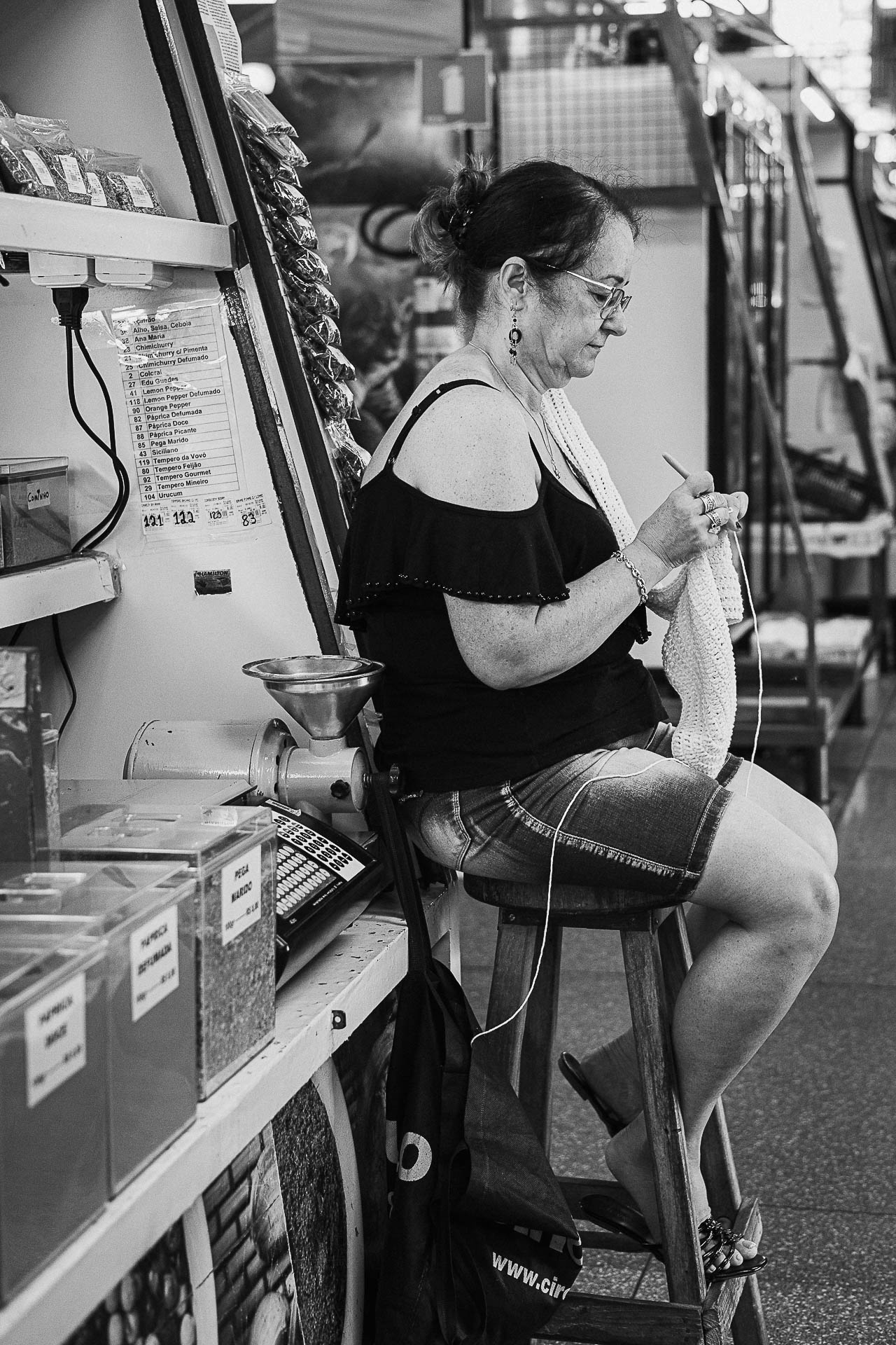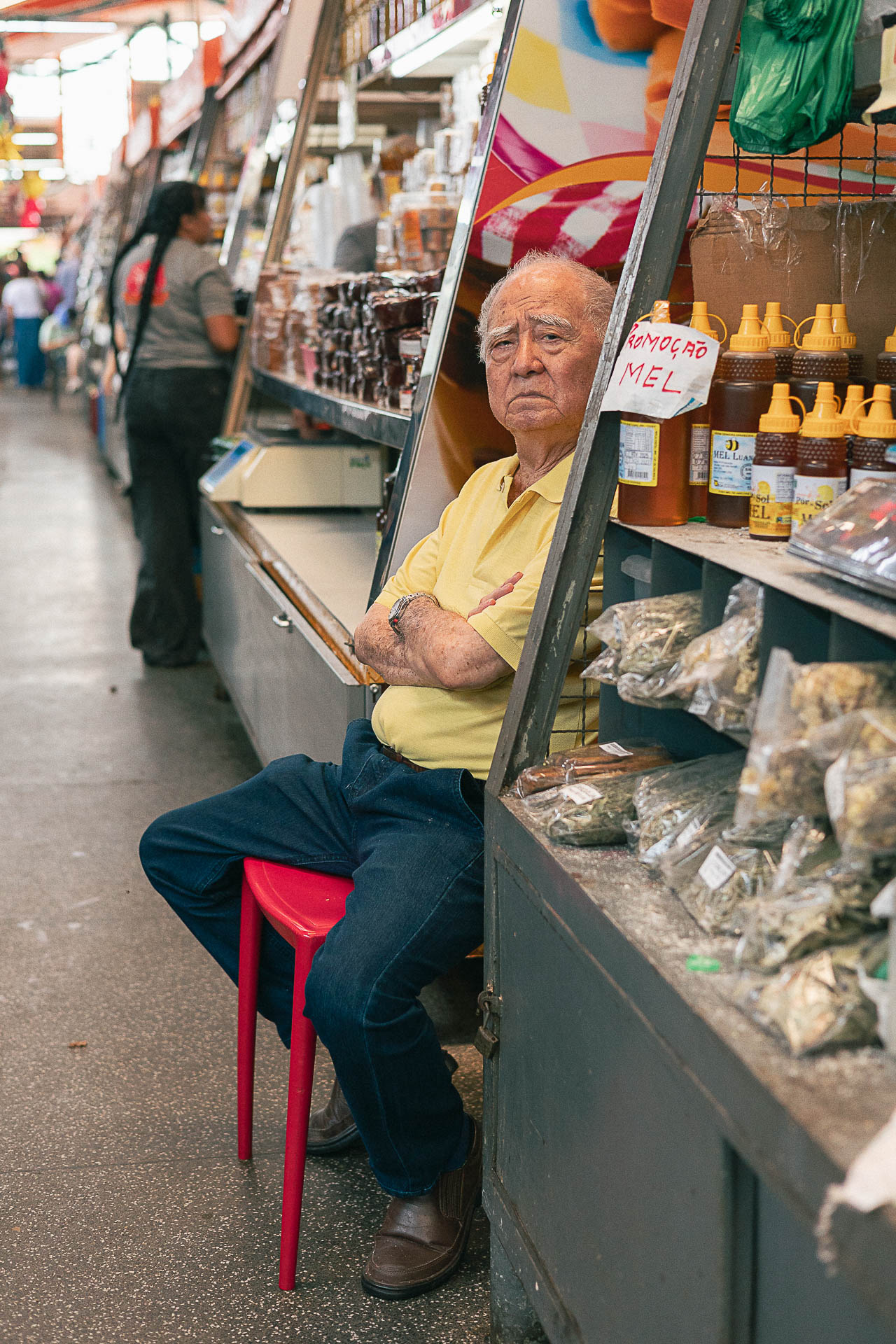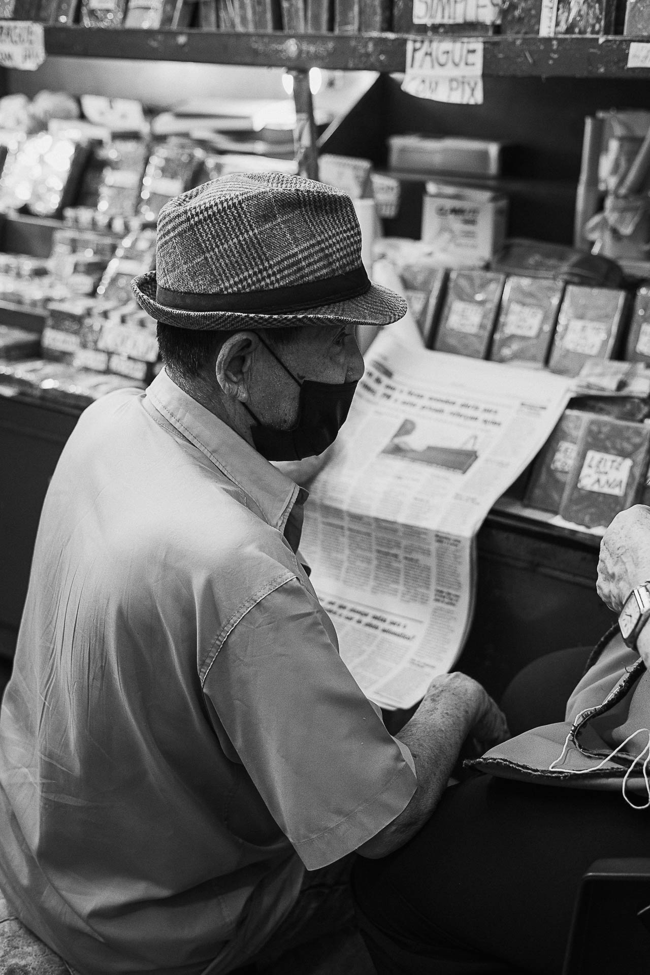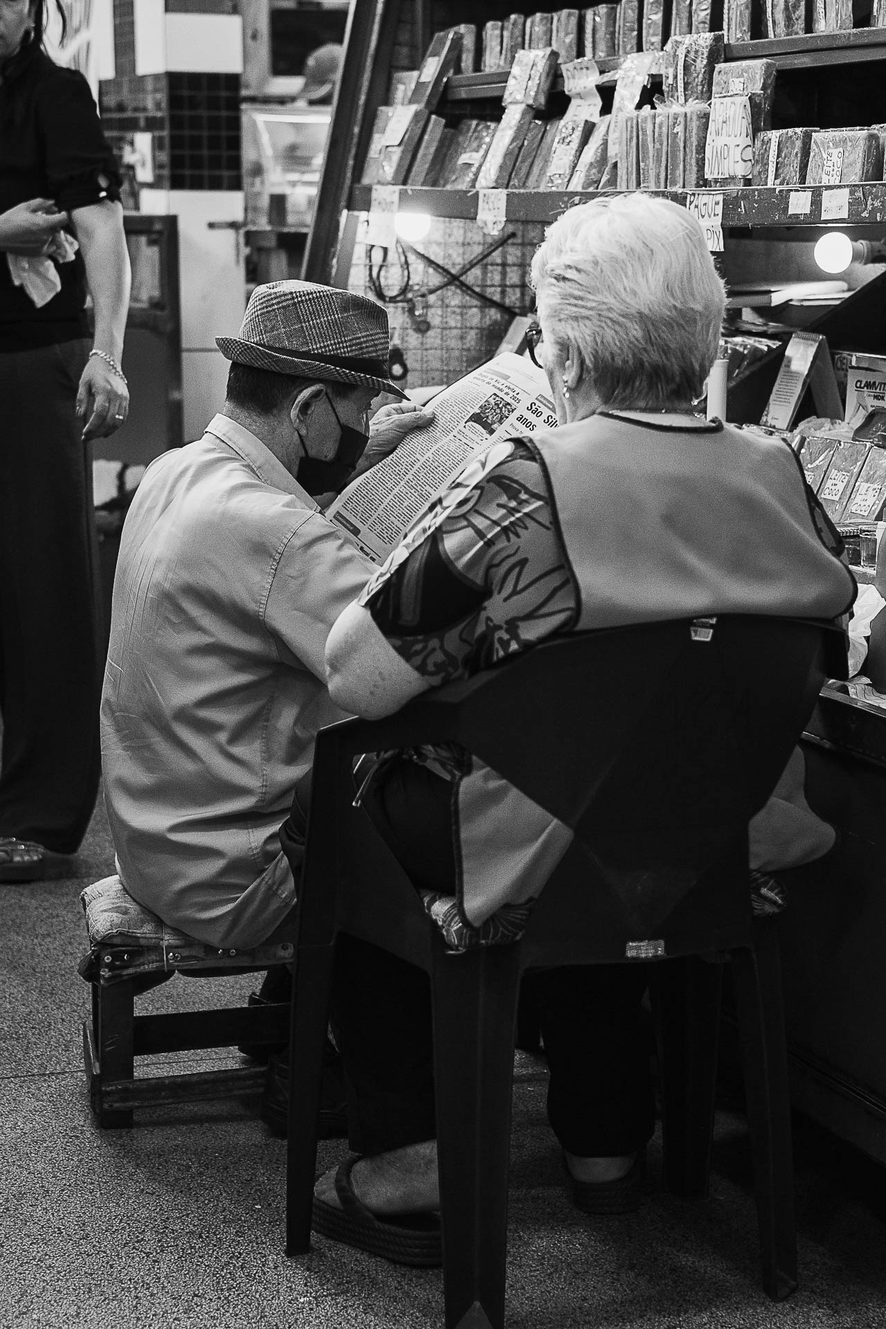 Sentar, esperar, observar, ler o jornal, tricotar, falar ao telefone, são cenas cotidianas que, quando isoladas pelo olhar fotográfico, ganham densidade e significado. O Mercado Municipal, tradicionalmente associado ao movimento e ao comércio, se transforma aqui em um espaço de pausa, onde o silêncio se insinua mesmo em meio ao barulho.