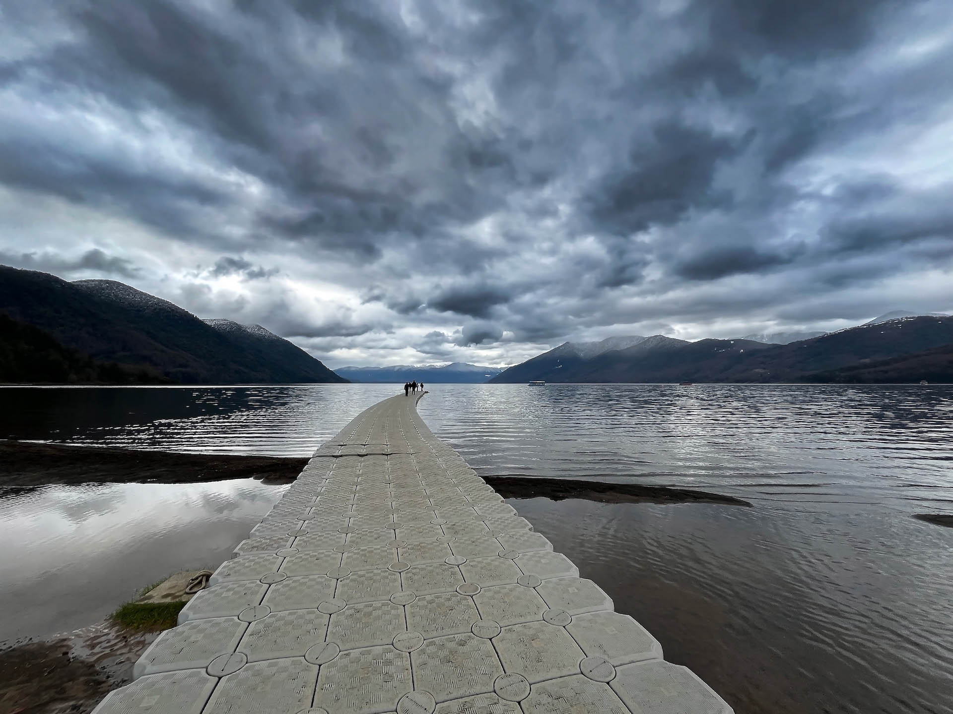 A imagem mostra um pier que se direciona para a parte profunda das águas e um grupo de pessoas caminhando neste pier. A intenção foi capturar a atmosfera e a escala entre a as pessoas e a paisagem, para representar a pequenez no ser humano diante da grandeza do mundo natural.