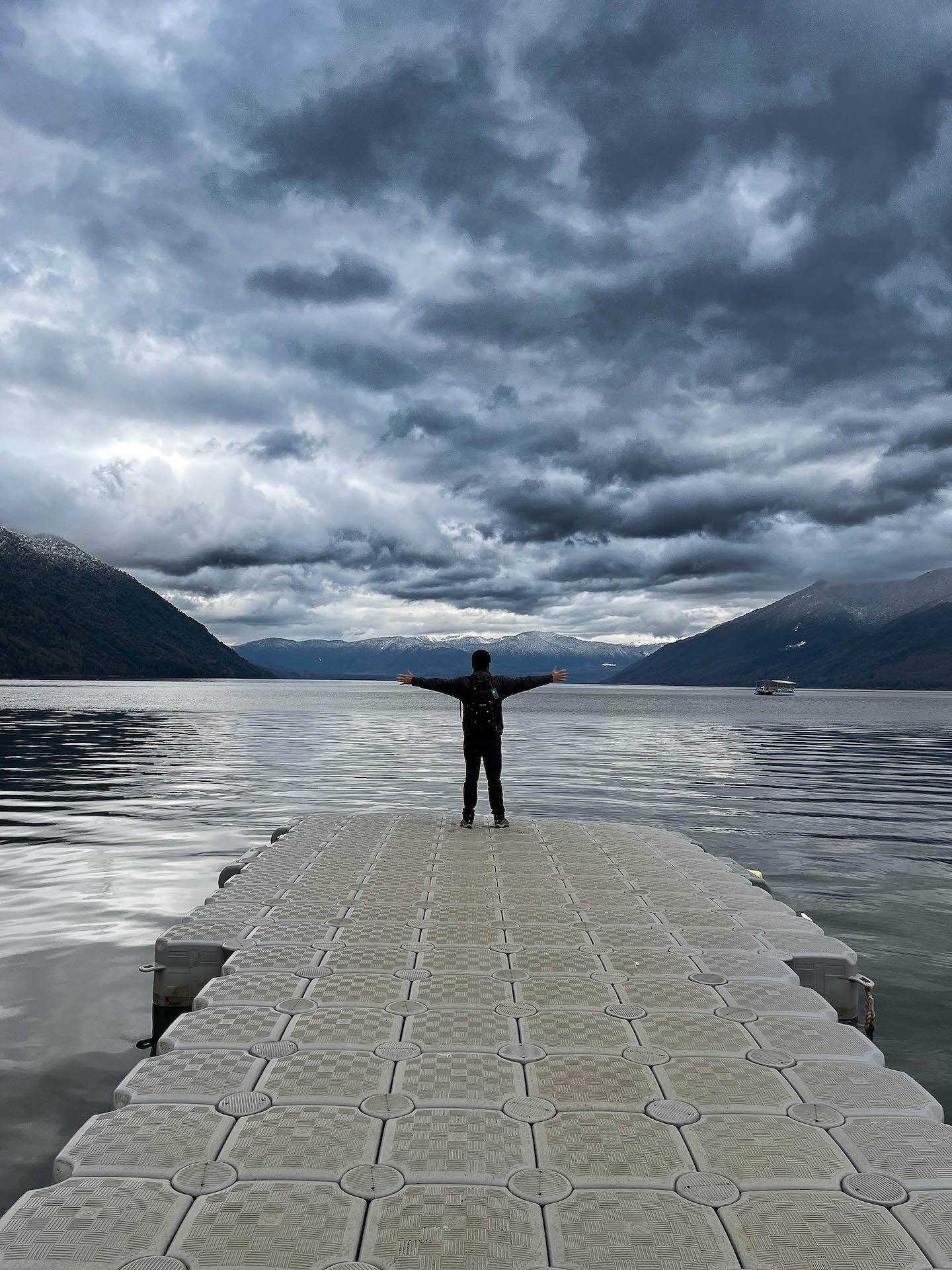 A imagem retrata um pier que direciona e insere a pessoa na paisagem. A pessoa com os braços abertos, simbolicamente representa a redenção da humanidade da condição de destruidor da natureza.