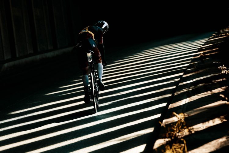 Um ciclista avança sozinho por um corredor de sombras, onde a luz fragmentada das aberturas do túnel corta o asfalto...