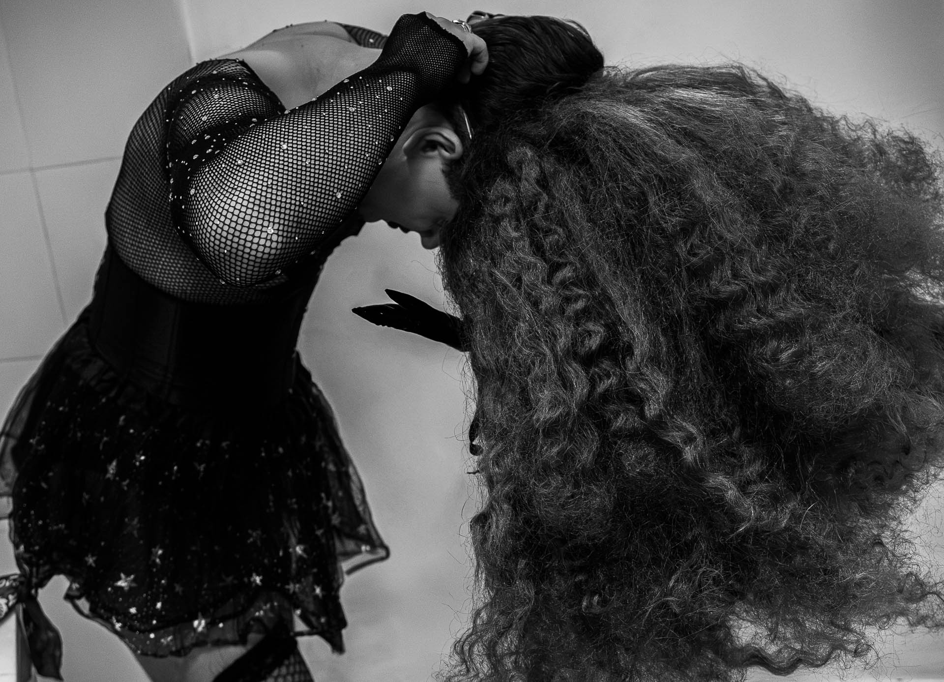 Nos camarins do Dragstar, o palco ainda é silêncio, mas a transformação já começou. A drag queen Capitu Pitanga se curva sobre a peruca, quase como num gesto de reverência. A textura da blusa com cristais e da saia de tule brilham sob a luz do camarim, enquanto os fios crespos da peruca anunciam o que vem: volume, presença, potência. A cena é íntima e ritualística.