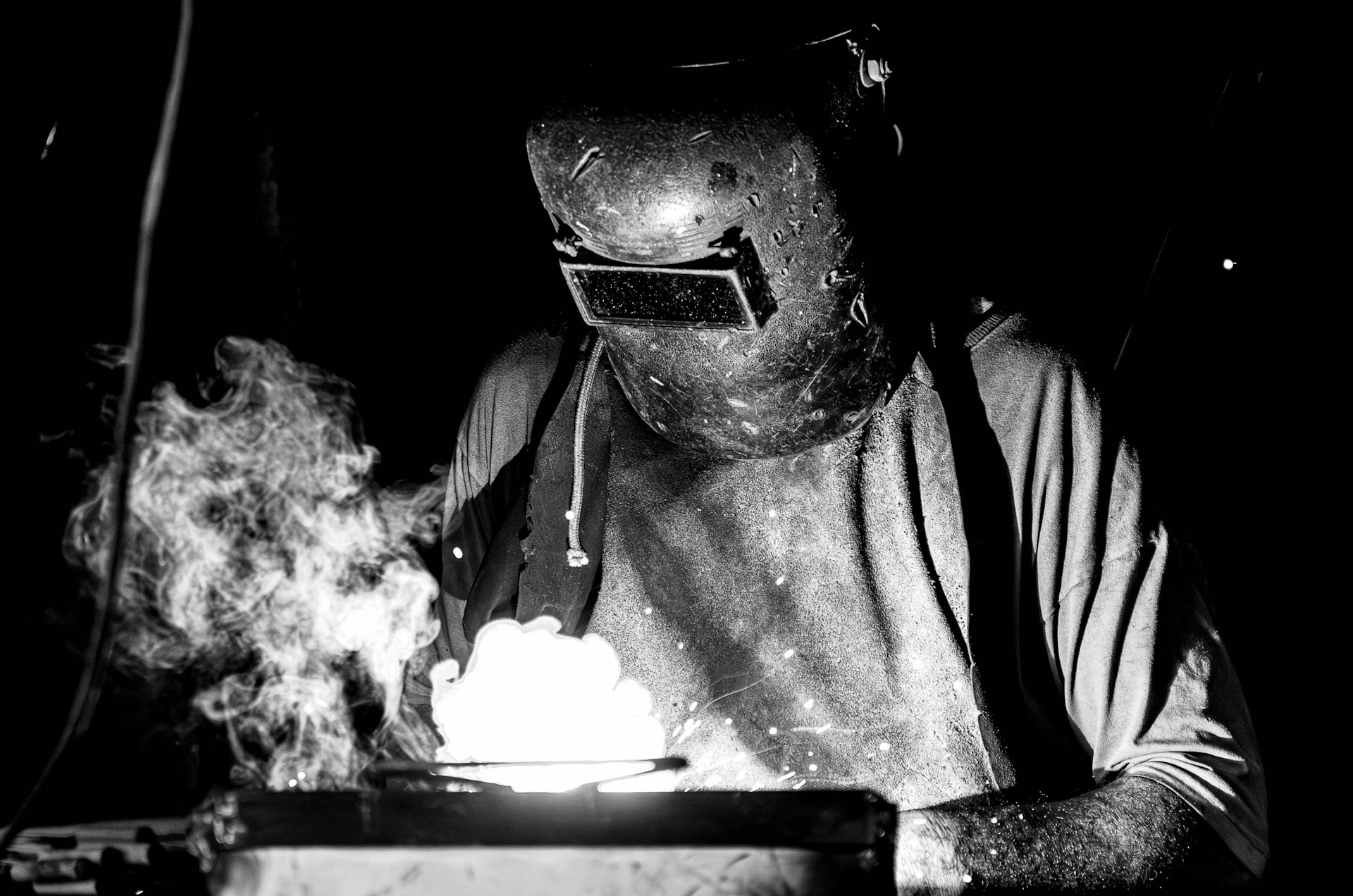 Entre sombra e clarão, a figura do soldador emerge quase como um arquétipo, envolta por faíscas e fumaça que criam atmosfera primordial. O elmo oculta o rosto, tornando o corpo inteiro símbolo da tarefa — peso, técnica e resistência condensados em um único gesto.