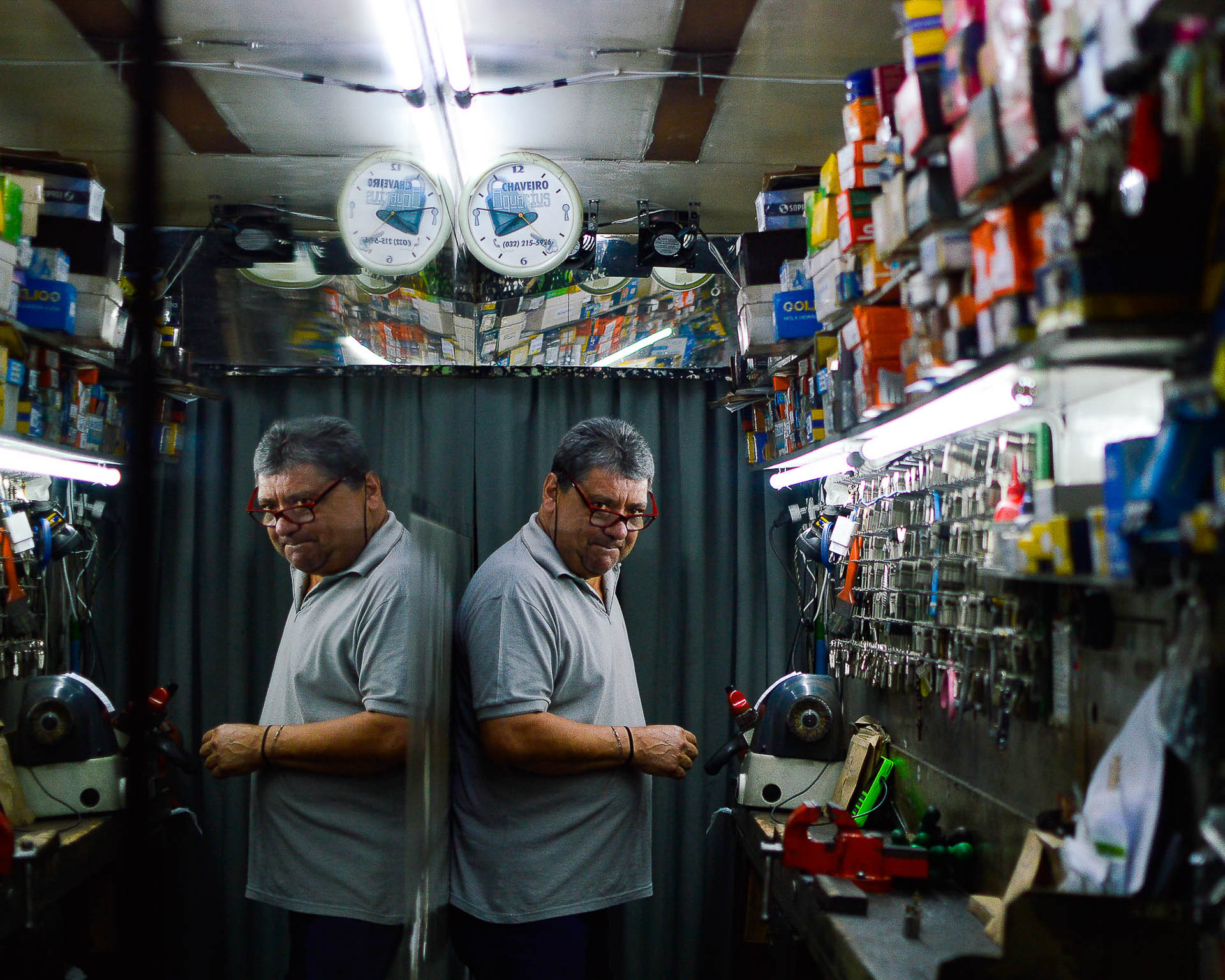 O Cristo de costas, visto através do para-brisa de um helicóptero. Vidro curvo, reflexos inesperados, o Rio dissolvido em luz.