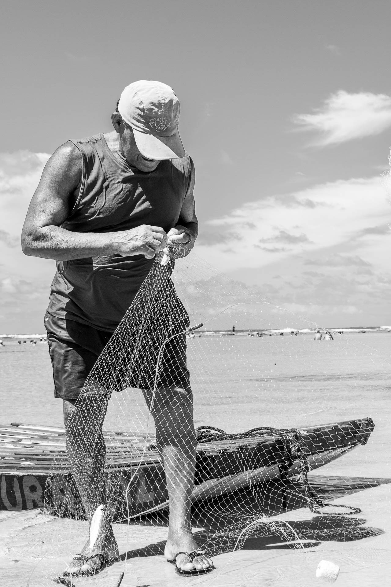 Os pescados são usados para a própria alimentação da comunidade ou vendidos para outros fornecedores de alimentos, muitas vezes a preços bem abaixo do valor de revenda. O trabalho é feito no sol ou na chuva e, mesmo com todos os desafios e dificuldades, a pesca é feita com a satisfação daqueles que conhecem o próprio ofício. Na foto, pescador cuida de barco na praia de Pipa, enquanto observa o intenso movimento na areia da praia.