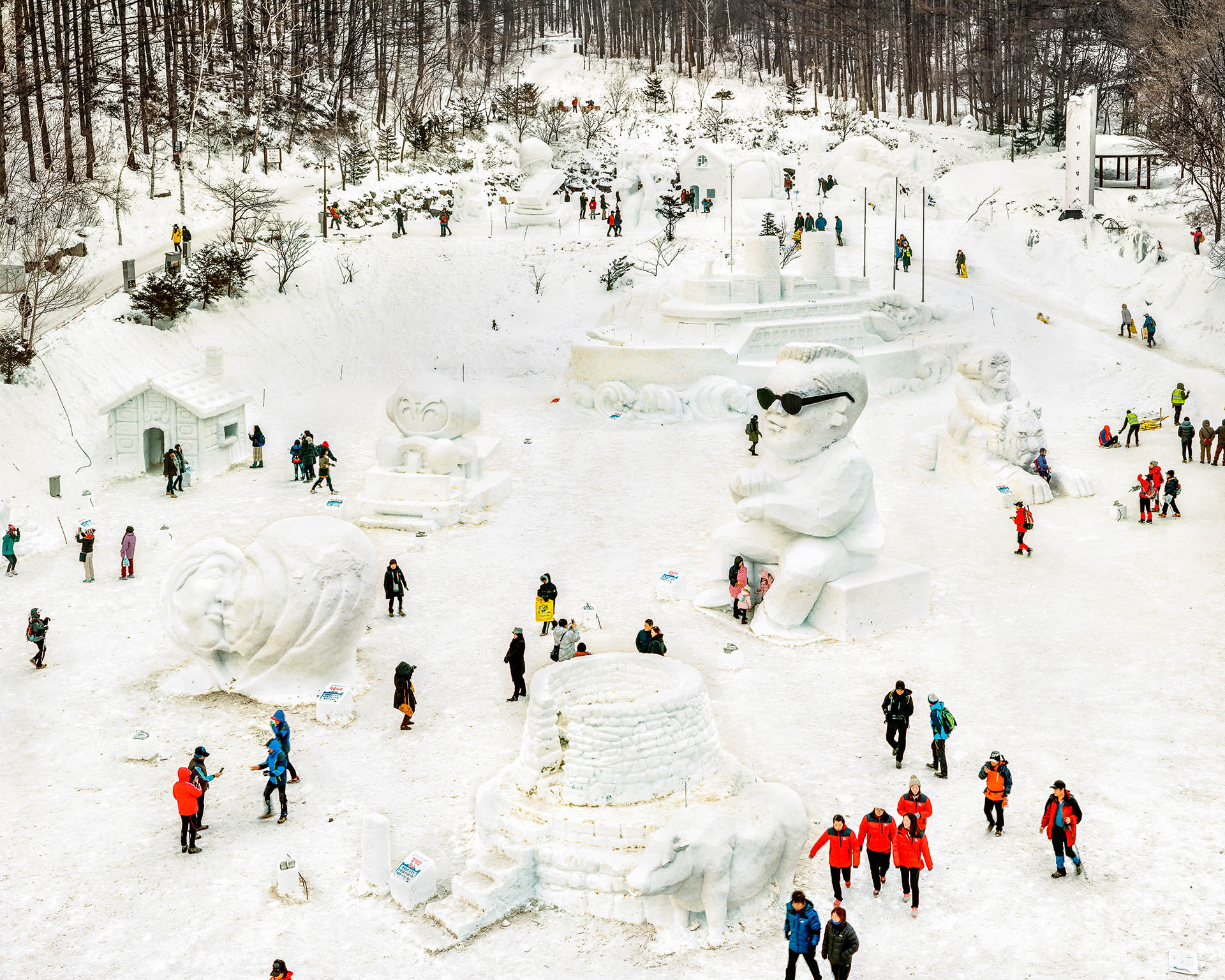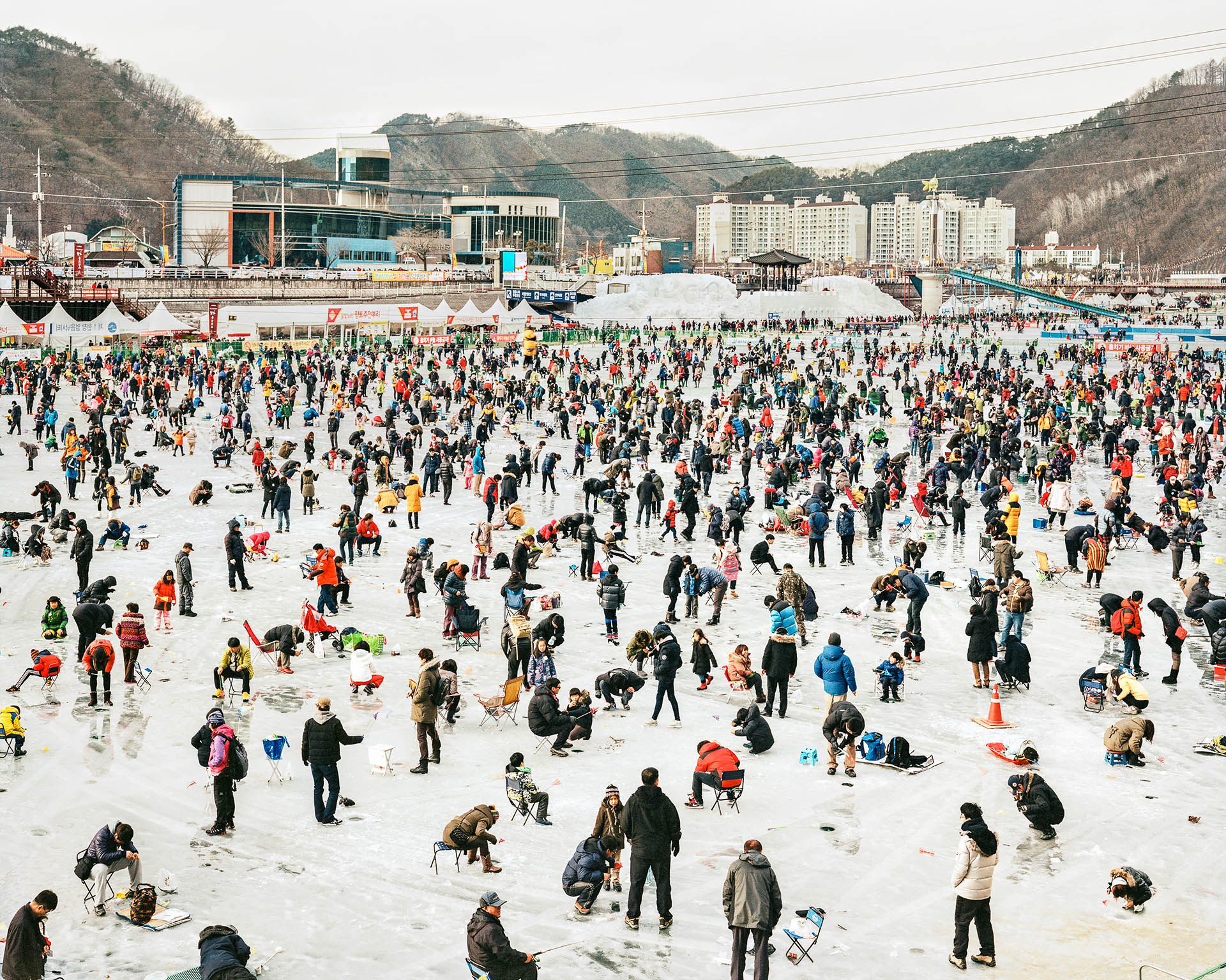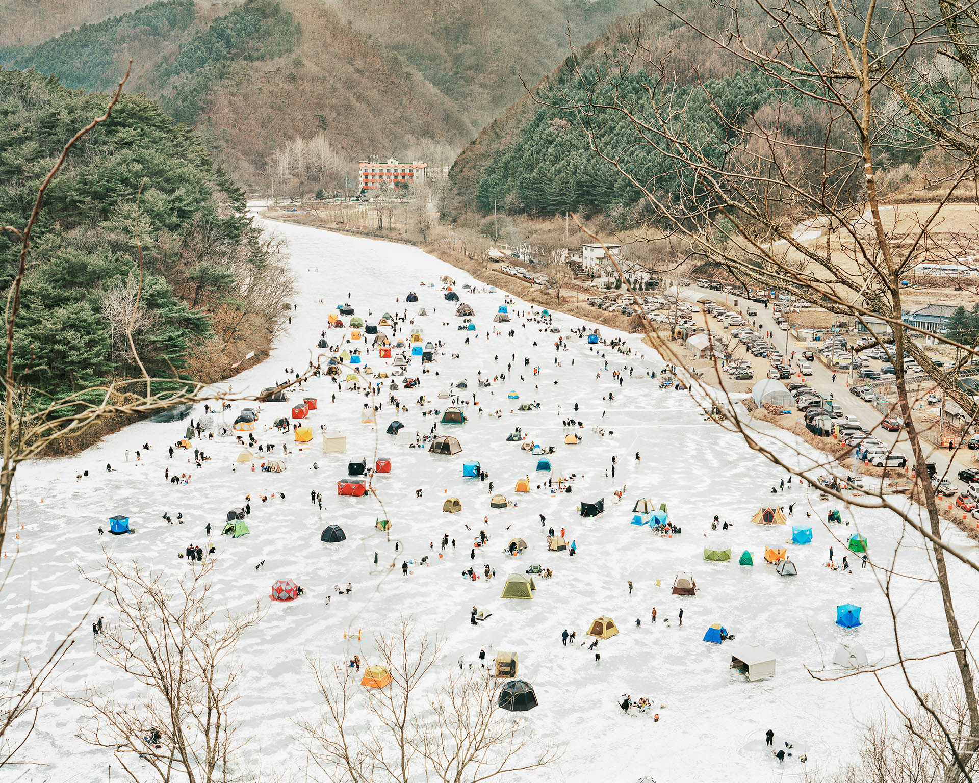 Over the past 40 years, South Korea has undergone rapid economic growth. However, this development has also produced social contradictions, such as long working hours and short vacations. For those unable to take long-distance or extended trips, weekends and short holidays become opportunities to visit local festivals or nearby attractions. Within ever-changing seasonal landscapes, people spend time with family, friends, and partners enjoying activities like swimming, fishing, or sledding. Seen from a distance, these scenes take on the form of a collective.