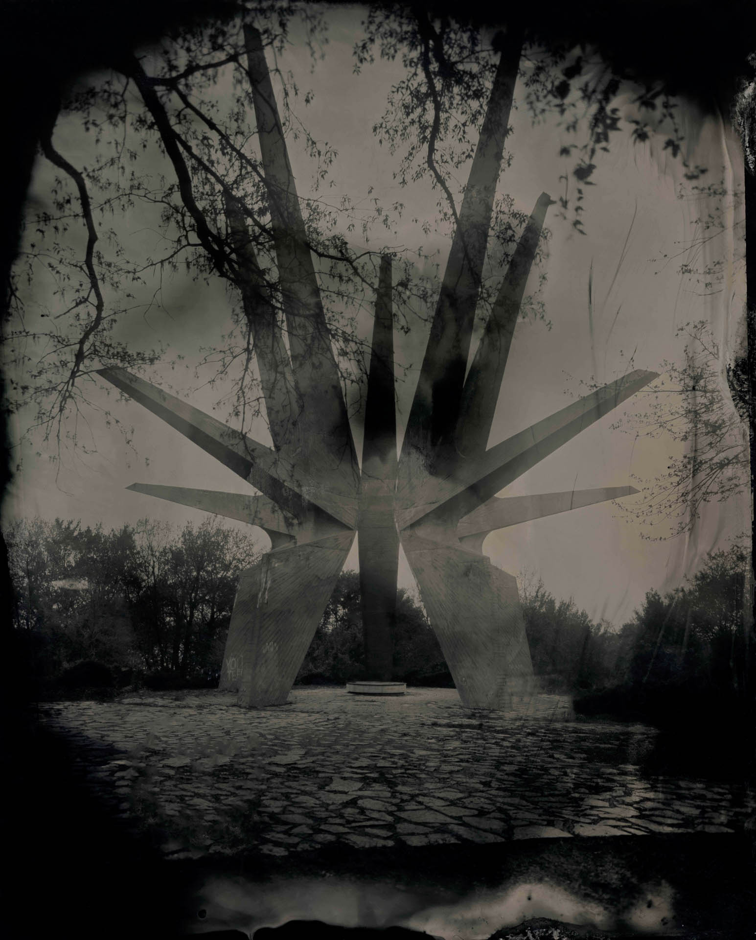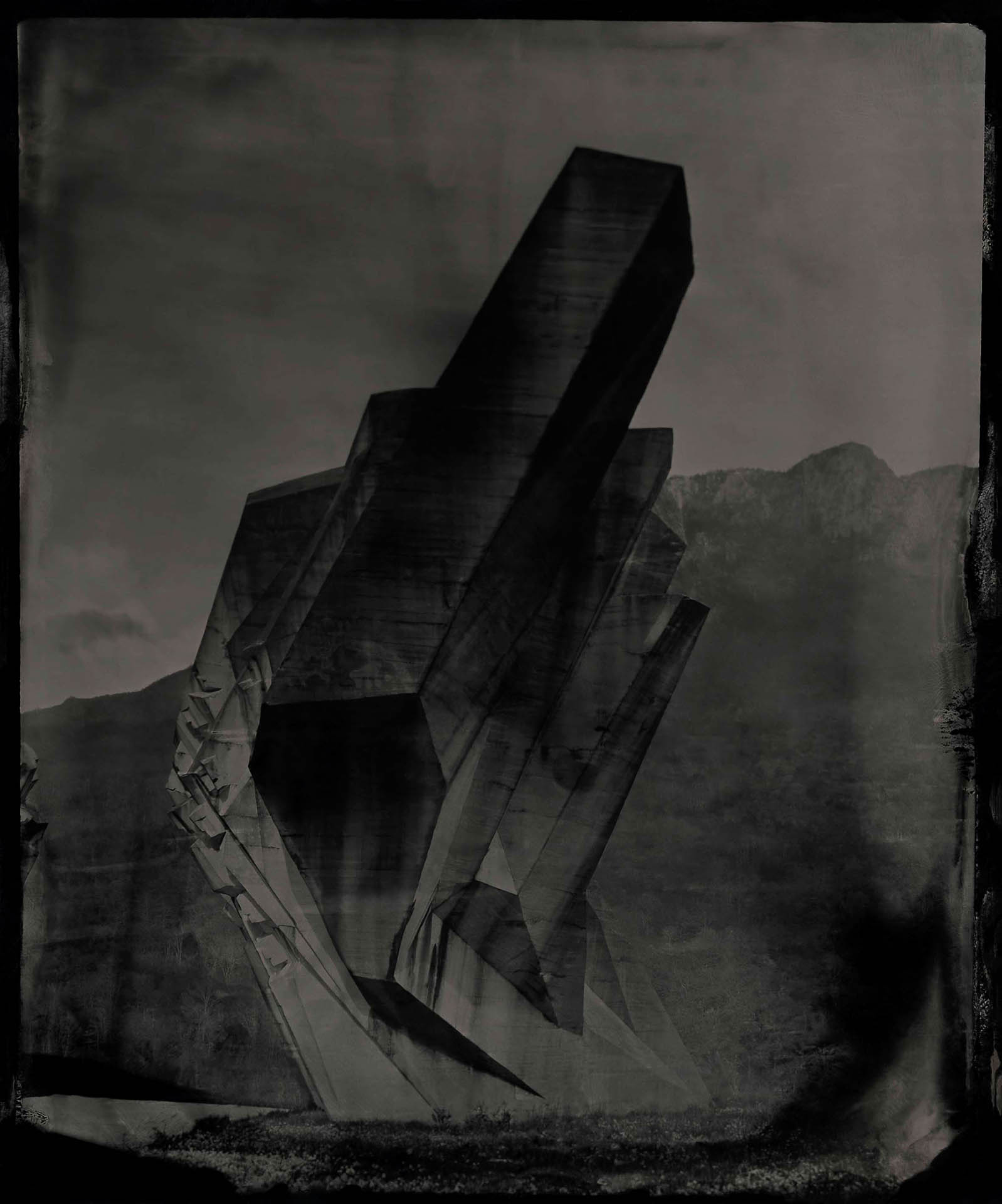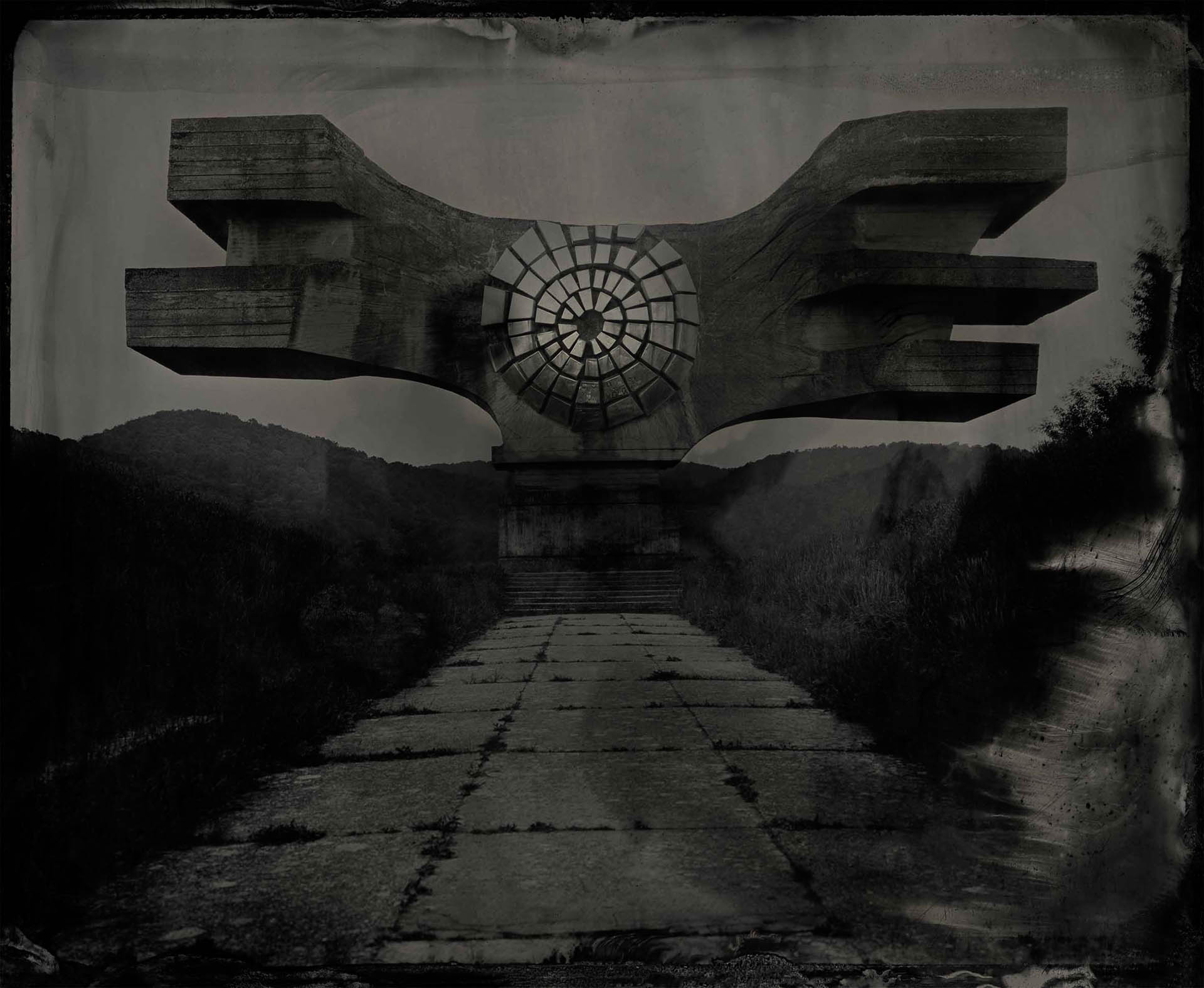 In contrast to our current age of technology, the alchemical process of collodion recontextualizes these monuments, not as relics of propaganda, nor as obsolete war memorials, but as poetic thresholds between past and present, utopia and aftermath. They become luminous apparitions, suspended in time, reflecting both the grandeur of their original intent and the melancholy of their abandonment.