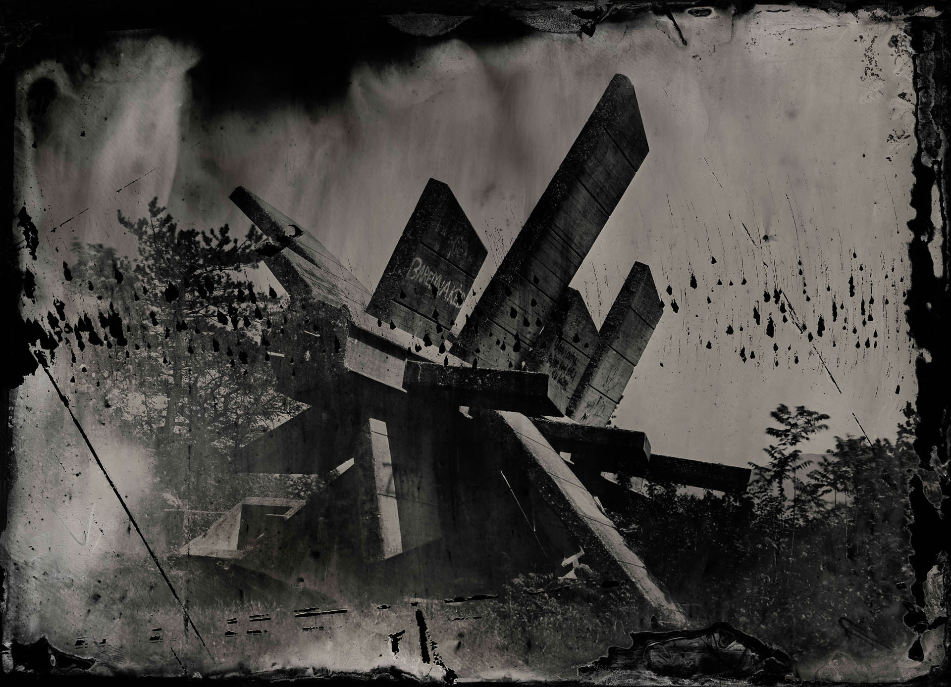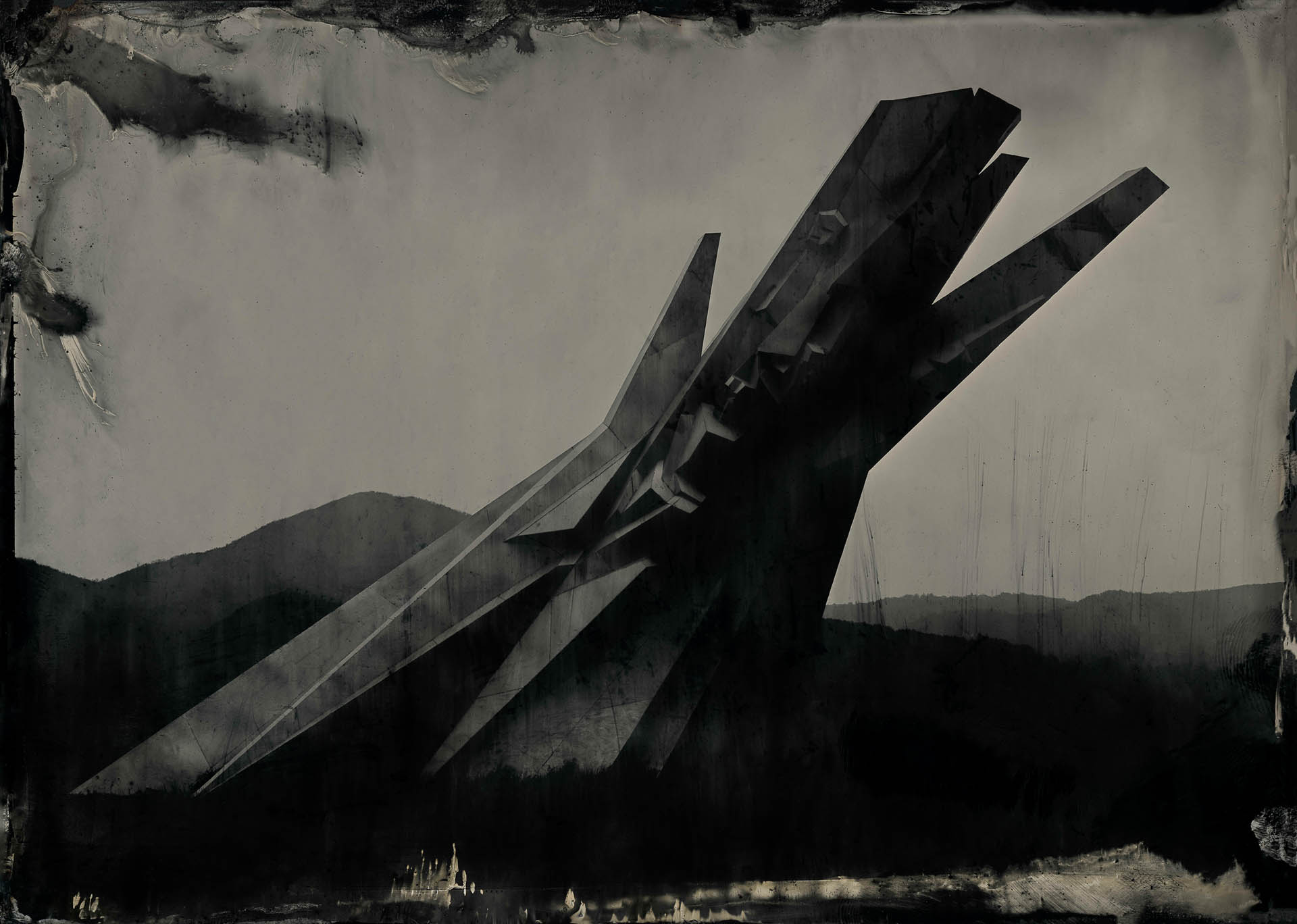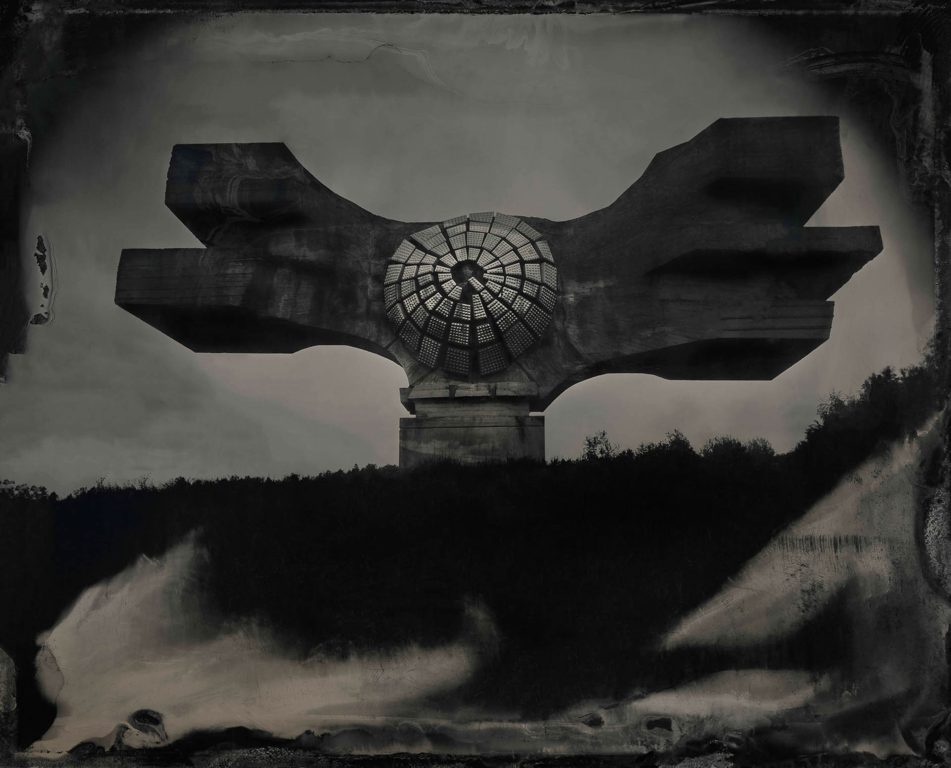 In contrast to our current age of technology, the alchemical process of collodion recontextualizes these monuments, not as relics of propaganda, nor as obsolete war memorials, but as poetic thresholds between past and present, utopia and aftermath. They become luminous apparitions, suspended in time, reflecting both the grandeur of their original intent and the melancholy of their abandonment.