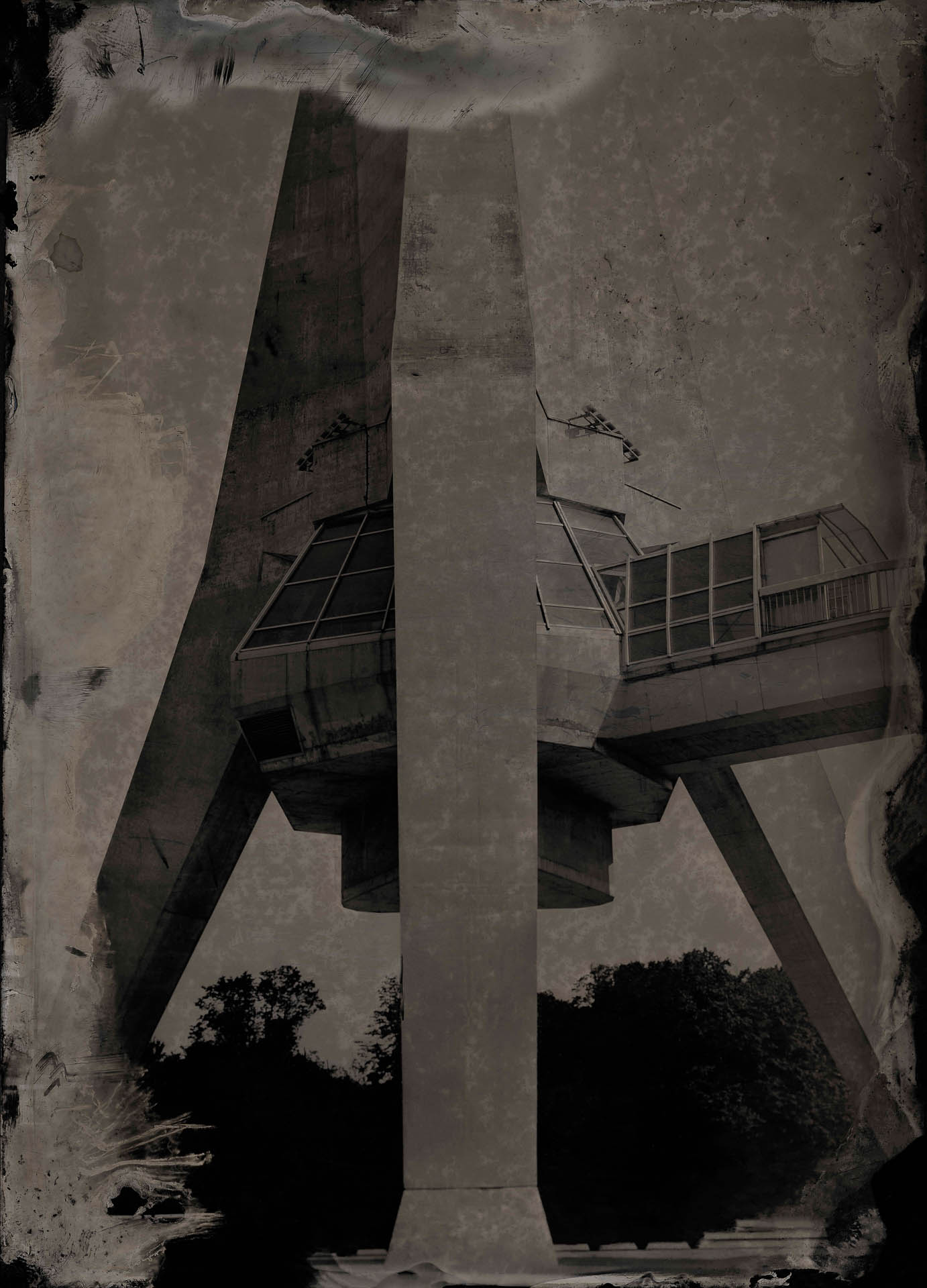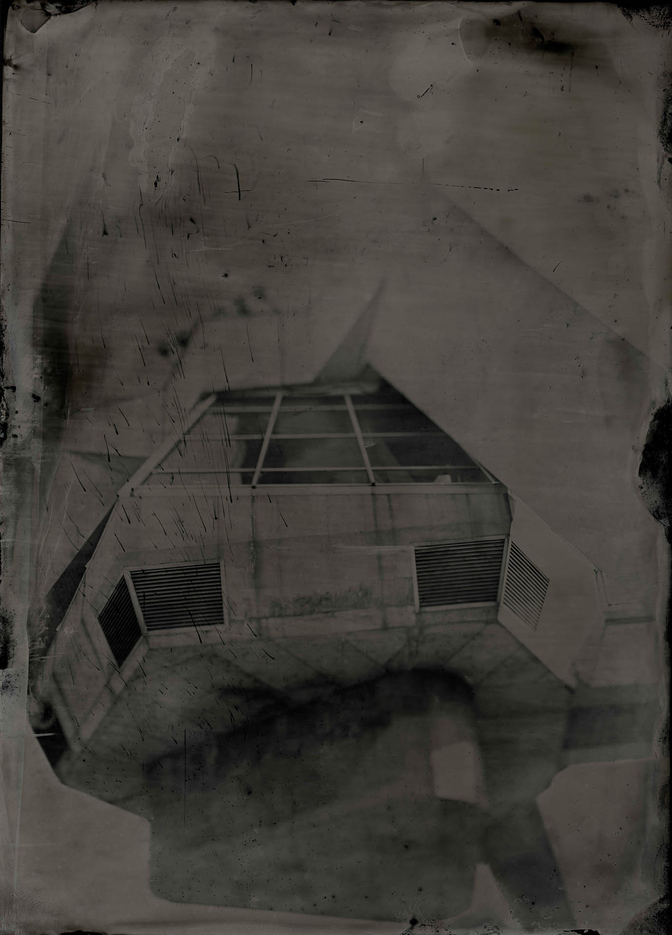 Its unique quality and inherent unpredictability, stands in stark contrast to the uncompromising solidity of the Brutalist monuments. Where concrete imposes, collodion flows. Where Brutalism is monumental, wet plates are intimate, ephemeral. The result is a haunting visual dialectic, inviting conversation between permanence and fragility, ideology, memory and myth. This body of work does not seek to document or archive, but rather to transform them into visual elegies.
