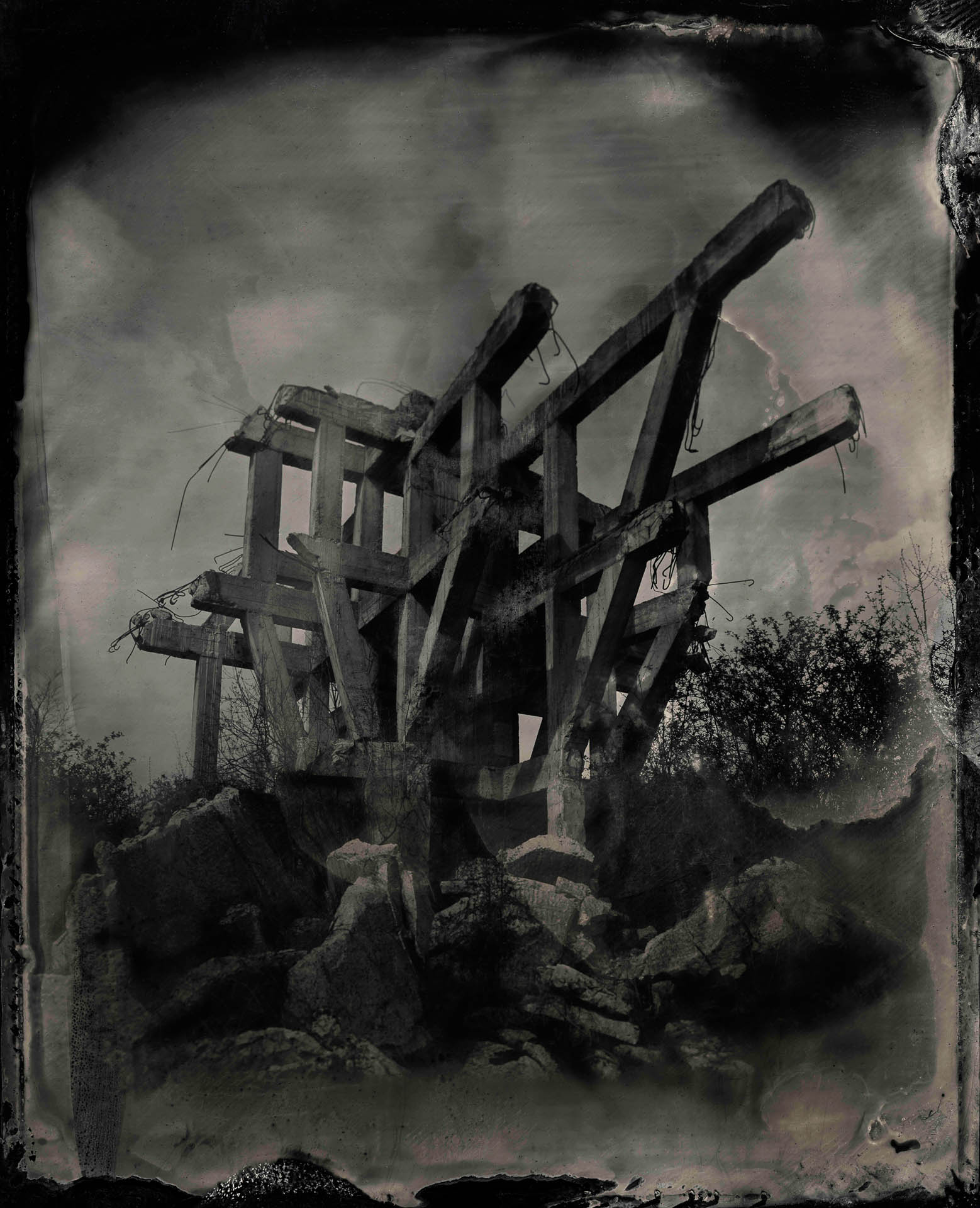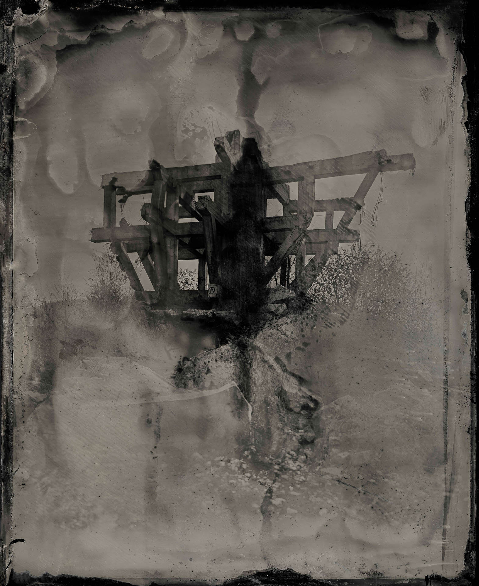 These fine art photographs are analogically made on metal plates in 13×18 cm., coated with collodion and silver nitrate, exposed in large-format cameras, and developed on site in a makeshift darkroom. The results of this process are imperfect chemical processes unveiling ghostly organic anomalies that are not corrected but embraced, echoing the expressionistic nature of exposing human fragility to concrete brutality. The juxtapose to this organic technique is an unmatched quality and sharpness as the liquid collodion film is at ISO 1 without filmgrain.