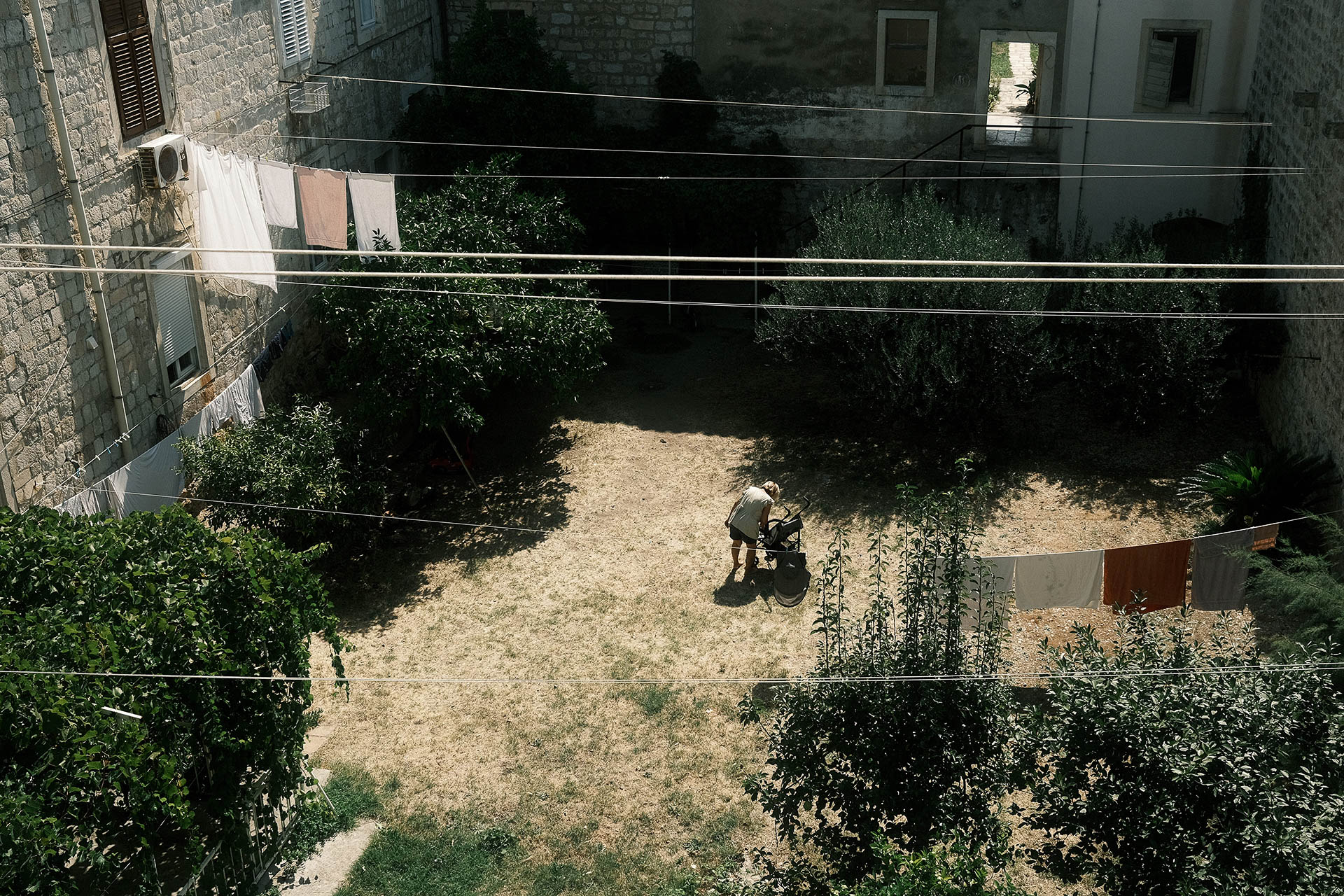 Mulher em seu quintal com o carrinho de bebê, dentro da cidade murada de Dubrovnik, Croácia.