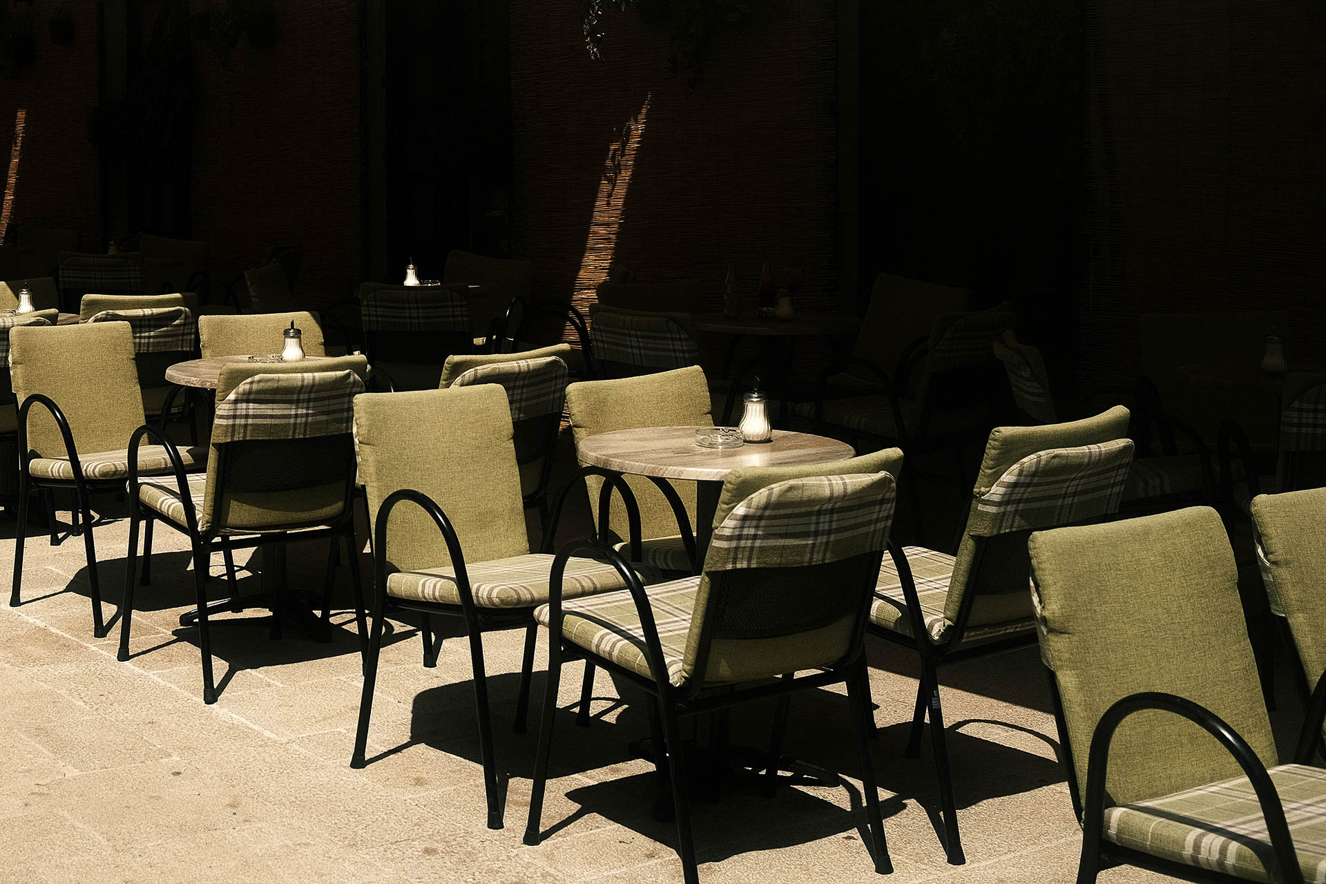 Mesas vazias em um dos cafés típicos da Bósnia e Herzegovina, uma representação da ausência na cidade sérvia